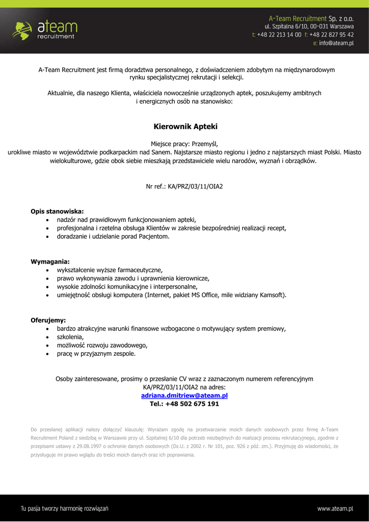 A-Team Recruitment jest firmą doradztwa personalnego, z doświadczeniem zdobytym na międzynarodowym rynku specjalistycznej rekrutacji i selekcji. Aktualnie, dla naszego Klienta, właściciela nowocześnie urządzonych aptek, poszukujemy ambitnych i energicznych osób na stanowisko: Kierownik Apteki Miejsce pracy: Przemyśl, urokliwe miasto w województwie podkarpackim nad Sanem. Najstarsze miasto regionu i jedno z najstarszych miast Polski. Miasto wielokulturowe, gdzie obok siebie mieszkają przedstawiciele wielu narodów, wyznań i obrządków. Nr ref.: KA/PRZ/03/11/OIA2 Opis stanowiska: • nadzór nad prawidłowym funkcjonowaniem apteki, • profesjonalna i rzetelna obsługa Klientów w zakresie bezpośredniej realizacji recept, • doradzanie i udzielanie porad Pacjentom. Wymagania: • wykształcenie wyższe farmaceutyczne, • prawo wykonywania zawodu i uprawnienia kierownicze, • wysokie zdolności komunikacyjne i interpersonalne, • umiejętność obsługi komputera (Internet, pakiet MS Office, mile widziany Kamsoft). Oferujemy: • bardzo atrakcyjne warunki finansowe wzbogacone o motywujący system premiowy, • szkolenia, • możliwość rozwoju zawodowego, • pracę w przyjaznym zespole. Osoby zainteresowane, prosimy o przesłanie CV wraz z zaznaczonym numerem referencyjnym KA/PRZ/03/11/OIA2 na adres: [email protected] Tel.: +48 502 675 191 Do przesłanej aplikacji nalezy dołączyć klauzulę: Wyrażam zgodę na przetwarzanie moich danych osobowych przez firmę A-Team Recruitment Poland z siedzibą w Warszawie przy ul. Szpitalnej 6/10 dla potrzeb niezbędnych do realizacji procesu rekrutacyjnego, zgodnie z przepisami ustawy z 29.08.1997 o ochronie danych osobowych (Dz.U. z 2002 r. Nr 101, poz. 926 z póź. zm.). Przyjmuję do wiadomości, że przysługuje mi prawo wglądu do treści moich danych oraz ich poprawiania.