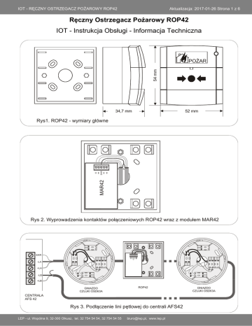 IOT - RĘCZNY OSTRZEGACZ POŻAROWY ROP42 Aktualizacja: 2017-01-26 Strona 1 z 6 Ręczny Ostrzegacz Pożarowy ROP42 IOT - Instrukcja Obsługi - Informacja Techniczna 54 mm POŻAR 52 mm 34,7 mm MAR42 EKR Rys1. ROP42 - wymiary główne Rys 2. Wyprowadzenia kontaktów połączeniowych ROP42 wraz z modułem MAR42 EKR EKR T T +LA T T -LA -LB +LB GNIAZDO CZUJKI OSD63A ROP42 CENTRALA AFS 42 Rys 3. Podłączenie lini pętlowej do centrali AFS42 LEP - ul. Wspólna 9, 32-300 Olkusz, tel. 32 754 54 54, 32 754 54 55 [email protected], www.lep.pl GNIAZDO CZUJKI OSD63A IOT - RĘCZNY OSTRZEGACZ POŻAROWY ROP42 Rys. 4 Testowanie Aktualizacja: 2017-01-26 Strona 2 z 6 Rys. 5 Instalacja (wymiana szybki / elementu wymiennego) LEP - ul. Wspólna 9, 32-300 Olkusz, tel. 32 754 54 54, 32 754 54 55 [email protected], www.lep.pl IOT - RĘCZNY OSTRZEGACZ POŻAROWY ROP42 Aktualizacja: 2017-01-26 Strona 3 z 6 INSTRUKCJA OBSŁUGI 1. PRZEZNACZENIE Ręczny Ostrzegacz Pożarowy ROP42 wyposażony w moduł MAR42 przeznaczony jest do wywoływania alarmu przez osobę, która zauważyła pożar. ROP42 pracuje w linii dozorowej centrali AFS42. Zawiera izolator zwarć. Moduł MAR42 może służyć także jako adapter linii bocznej - system AFS42 będzie traktował taką linię jak pojedynczy detektor sygnalizacji pożarowej. Moduł MAR42 umożliwia podłączenie do systemu AFS42 także i innych, dwustanowych detektorów sygnalizacji pożarowej. Detektor powinien charakteryzować się wzrostem prądu zasilającego lub zwarciem obwodu w stanie alarmowania. 2. UŻYTKOWANIE Zbicie szybki a tym samym wciśnięcie przycisku w ostrzegaczu ROP42 powoduje wysłanie sygnału alarmowego, który przez centralkę AFS42 traktowany jest jako alarm I stopnia. ROP42 wyposażony jest w moduł adresujący MAR42 o zakodowanym unikalnym adresie w danym systemie AFS42 (od 00 do 99). 3. KONSERWACJA Producent nie przewiduje specjalnych czynności konserwujących. LEP - ul. Wspólna 9, 32-300 Olkusz, tel. 32 754 54 54, 32 754 54 55 [email protected], www.lep.pl IOT - RĘCZNY OSTRZEGACZ POŻAROWY ROP42 Aktualizacja: 2017-01-26 Strona 4 z 6 INFORMACJA TECHNICZNA 1438 LEP - Maciej Kluczewski ul. Wspólna 9, 32-300 Olkusz 12 1438/CPD/0215 EN-54-11 Ręczny ostrzegacz pożarowy do systemów sygnalizacji pożarowej stosowanych w budynkach. TYPA ROP42 Dane techniczne: dostępne w Informacji Technicznej ROP42 4. DANE TECHNICZNE Wymiary (dł. x szer. x wys.) Stopień ochrony Zakres temperatur przechowywania 93 x 89 x 59,5 mm IP51 od -25 do +55 °C Dane elektryczne: Rodzaj elementu liniowego Napięcie zasilania Pobór prądu Współpraca z centralką sygnalizacji pożarowej Zasada działania izolatora Napięcie odcięcia Wtrącona rezystancja szeregowa Rodzaj transmisji do centrali Zabezpieczenie przed odwrotną polaryzacją zasilania Czas reakcji na zwarcie w linii Materiał obudowy Zakres temperatur pracy Wilgotność względna czerwony ABS od -25 do +55 °C 80% adresowalny z wbudowanym izolatorem zwarć 20V (od 12V do 30V) 400µA AFS42 dwukierunkowy automatyczny napięciowy 6V 0,04Ohm cyfrowa tak 10 ms 5. BUDOWA I ZASADA DZIAŁANIA ROP42 wyposażony jest w moduł adresujący MAR42. Na obwodzie drukowanym modułu MAR42 są zainstalowane zaciski za pomocą których gniazdo jest włączane w linię dozorową. Jedna para zacisków oznaczona + - służy do podłączenia linii dochodzącej a druga para linii odchodzącej. Zacisk oznaczony jako E służy do wspólnego podłączenia ekranów obu kabli. Dla układu elektronicznego MAR42 są rozpoznawalne dwa stany ROP42: jego brak, oraz stan alarmowania. Moduł MAR42 ma zakodowany unikalny adres w danym systemie AFS42 - od 00 do 99. Centrala AFS42 „odpytuje” każdego dołączonego do niej ROP42 otrzymując w odpowiedzi wszystkie stany pracy i na ich podstawie podejmuje decyzje wynikające z konfiguracji systemu. Zbicie szybki a tym samym wciśnięcie przycisku w ostrzegaczu ROP42 powoduje wysłanie sygnału alarmowego, który przez centralę AFS42 traktowany jest jako alarm I stopnia. ROP42 ma zrealizowany na obwodzie drukowanym MAR42 układ izolatora zwarć. Stan izolatora nie jest przekazywany do centrali podczas odpytywania gniazda, natomiast centrala jest w stanie zlokalizować które ROP42 mają rozwarte izolatory na podstawie informacji jednostronnych odpowiedzi ROP42 w linii pętlowej. ROP42, w którym jest rozwarty izolator jest zasilany i „widziany” przez centralę od tej strony w której nie ma zwarcia. LEP - ul. Wspólna 9, 32-300 Olkusz, tel. 32 754 54 54, 32 754 54 55 [email protected], www.lep.pl IOT - RĘCZNY OSTRZEGACZ POŻAROWY ROP42 Aktualizacja: 2017-01-26 Strona 5 z 6 6. INSTALOWANIE Ręczy Ostrzegacz Pożarowy instalowany jest za pomocą 2szt. wkrętów ∅4 zaopatrzonych w kołki rozporowe. ROP42 powinien być zainstalowany wewnątrz budynku w miejscu łatwo dostępnym, dobrze widocznym, najlepiej w pobliżu dróg transportowych i ewakuacyjnych na wysokości około 1,4 m nad powierzchnią podłogi. Linię systemu AFS42 tworzą, odpowiednio połączone, moduły MAR42 i detektory sygnalizacji pożarowej. Moduły MAR połączone są dwużyłowym przewodem w ekranie. Linia powinna tworzyć pętlę co w powiązaniu z dwustronnymi izolatorami zwarć każdego modułu MAR42 poprawia niezawodność systemu. Izolator zwarć odłącza uszkodzoną część linii. Należy zwracać uwagę na polaryzację przy łączeniu centrali i modułów MAR42. 7. KONFIGURACJA Ustawienie adresu modułu MAR42. Adresy modułów MAR w określonym systemie muszą być niepowtarzalne. Producent dostarcza elementy skonfigurowane zgodnie z zamówionymi, konkretnymi wartościami adresów lub partię elementów z niepowtarzalnymi wartościami adresów dla określonego systemu. Producent nie zaleca samodzielnego ustawiania wartości adresu przez osoby nie posiadające doświadczenia z zakresu montażu urządzeń elektronicznych. Zmiana wartości adresu obejmuje: - usunięcie lakieru elektroizolacyjnego z płytki MAR42 w obrębi