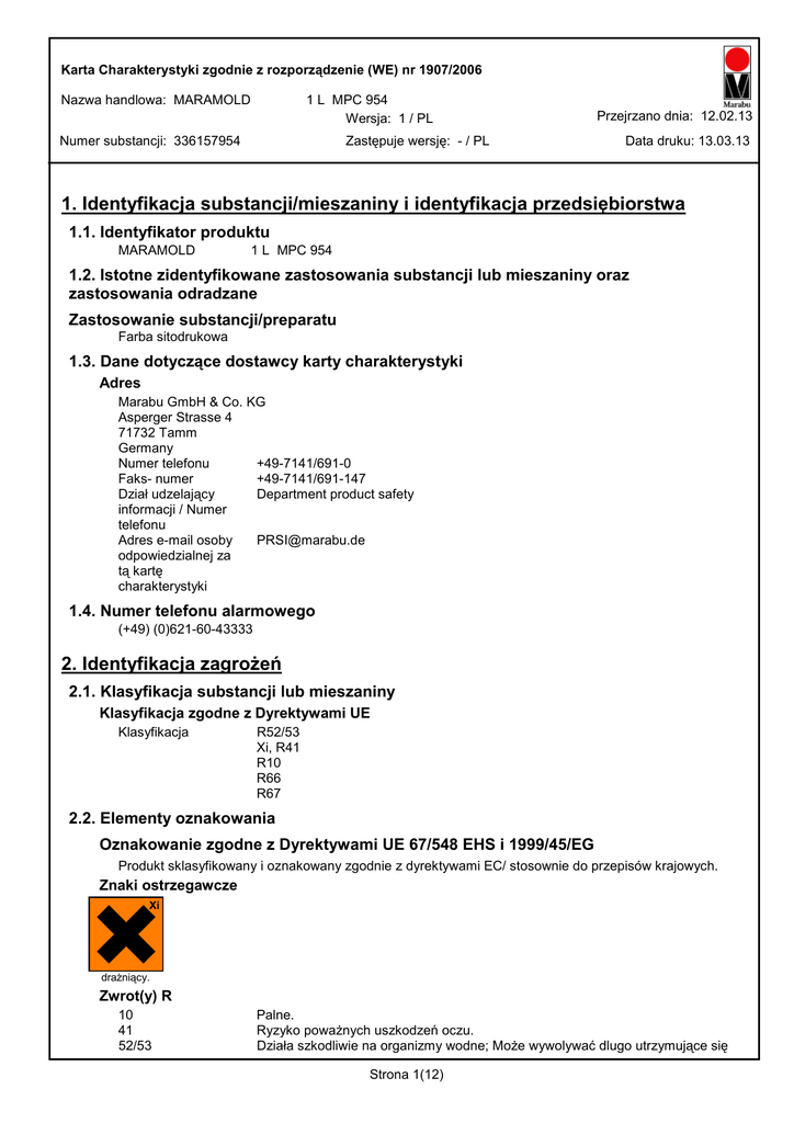 Karta Charakterystyki zgodnie z rozporządzenie (WE) nr 1907/2006 Nazwa handlowa: MARAMOLD 1 L MPC 954 Wersja: 1 / PL Numer substancji: 336157954 Zastępuje wersję: - / PL Przejrzano dnia: 12.02.13 Data druku: 13.03.13 1. Identyfikacja substancji/mieszaniny i identyfikacja przedsiębiorstwa 1.1. Identyfikator produktu MARAMOLD 1 L MPC 954 1.2. Istotne zidentyfikowane zastosowania substancji lub mieszaniny oraz zastosowania odradzane Zastosowanie substancji/preparatu Farba sitodrukowa 1.3. Dane dotyczące dostawcy karty charakterystyki Adres Marabu GmbH & Co. KG Asperger Strasse 4 71732 Tamm Germany Numer telefonu +49-7141/691-0 Faks- numer +49-7141/691-147 Dział udzelający Department product safety informacji / Numer telefonu Adres e-mail osoby [email protected] odpowiedzialnej za tą kartę charakterystyki 1.4. Numer telefonu alarmowego (+49) (0)621-60-43333 2. Identyfikacja zagrożeń 2.1. Klasyfikacja substancji lub mieszaniny Klasyfikacja zgodne z Dyrektywami UE Klasyfikacja R52/53 Xi, R41 R10 R66 R67 2.2. Elementy oznakowania Oznakowanie zgodne z Dyrektywami UE 67/548 EHS i 1999/45/EG Produkt sklasyfikowany i oznakowany zgodnie z dyrektywami EC/ stosownie do przepisów krajowych. Znaki ostrzegawcze drażniący. Zwrot(y) R 10 41 52/53 Palne. Ryzyko poważnych uszkodzeń oczu. Działa szkodliwie na organizmy wodne; Może wywolywać dlugo utrzymujące się Strona 1(12) Karta Charakterystyki zgodnie z rozporządzenie (WE) nr 1907/2006 Nazwa handlowa: MARAMOLD 1 L MPC 954 Wersja: 1 / PL Numer substancji: 336157954 66 67 Przejrzano dnia: 12.02.13 Zastępuje wersję: - / PL Data druku: 13.03.13 zmiany w środowisku wodnym. Powtarzany kontakt ze skórą prowadzić może do jej wysuszenia i popękania. Wyziewy spowodować mogą ospałość i uczucie zmęczenia. Zwrot(y) S 26 39 60 61 Zanieczyszczone oczy przemyć natychmiast dużą ilością wody i zasięgnąć porady lekarza. Nosić okulary lub ochronę twarzy. Produkt i opakowanie usuwać jako odpad niebezpieczny. Unikać zrzutów do środowiska. Postępować zgodnie z instrukcją lub kartą charakterystyki. 3. Skład/informacja o składnikach Dział udzelający informacji Farba sitodrukowa rozpuszczalnikowa na bazie środków wiążących – żywic poliestrowych Składniki niebezpieczne Solvent naphtha (petroleum), light arom. Nr CAS 64742-95-6 Nr EINECS 265-199-0 Koncentracja >= 10 Klasyfikacja Xn, R65 Xi, R37 N, R51/53 R10 R66 R67 < 20 % 20 % 7 % Klasyfikacja (Rozporządzenie (WE) nr 1272/2008) Flam. Liq. 3 H226 STOT SE 3 H336 STOT SE 3 H335 Asp. Tox. 1 H304 Aquatic chronic H411 2 Gamma-butyrolactone Nr CAS Nr EINECS Numer rejestracyjny Koncentracja Klasyfikacja 96-48-0 202-509-5 01-2119471839-21 >= 10 Xn, R22 Xi, R41 < Klasyfikacja (Rozporządzenie (WE) nr 1272/2008) Acute Tox. 4 H302 Eye Dam. 1 H318 STOT SE 3 H336 Hydrocarbons, C10, aromatics, <1% naphthalene Nr EINECS 918-811-1 Numer rejestracyjny 01-2119463583-34 Koncentracja >= 5 < Klasyfikacja Xn, R65 N, R51/53 R66 Strona 2(12) Karta Charakterystyki zgodnie z rozporządzenie (WE) nr 1907/2006 Nazwa handlowa: MARAMOLD 1 L MPC 954 Wersja: 1 / PL Numer substancji: 336157954 Przejrzano dnia: 12.02.13 Zastępuje wersję: - / PL Data druku: 13.03.13 R67 Klasyfikacja (Rozporządzenie (WE) nr 1272/2008) Asp. Tox. 1 H304 Aquatic chronic H411 2 STOT SE 3 H336 EUH066 cykloheksanon Nr CAS Nr EINECS Koncentracja Klasyfikacja 108-94-1 203-631-1 >= Xn, R20 R10 10 < 20 % Klasyfikacja (Rozporządzenie (WE) nr 1272/2008) Acute Tox. 4 H332 Flam. Liq. 3 H226 4. Środki pierwszej pomocy 4.1. Opis środków pierwszej pomocy Informacje ogólne W razie jakichkolwiek watpliwosci, lub jezeli objawy nie ustepuja, nalezy zasiegnac pomocy lekarskiej. Nigdy nie podawać niczego doustnie osobie nieprzytomnej. W razie utraty przytomnosci, nalezy ulozyc w pozycji stabilizowanej (polozenie na boku) i uzyskac pomoc lekarska. W przypadku wdychania Wyniesc na swieze powietrze. Zapewnic osobie cieplo i spokój. Jeżeli osoba nie oddycha, oddycha nieregularnie lub gdy oddychanie ustało, wykwalifikowany personel powinien wykonać sztuczne oddychanie lub podać tlen. W przypadku kontaktu ze skórą Zdjąć skażoną odzież i buty. Skórę należy myć dokładnie wodą z mydłem lub stosować sprawdzony środek do mycia skóry. Nie wolno używać rozpuszczalników ani rozcieńczalników. W przypadku kontaktu z oczami Sprawdzić i usunąc szkła kontaktowe. Natychmiast rozpocząć przemywanie oczu wodą przez okres conajmniej 5 minut, sprawdzić wewnętrzne powierzchnie górnych i dolnych powiek. W przypadku połknięcia W razie połknięcia niezwłocznie zasięgnij porady lekarza - pokaż opakowanie lub etykietę. Zapewnić osobie ciepło i spokój. Nie wywoływać wymiotów. 5. Postępowanie w przypadku pożaru 5.1. Środki gaśnicze Odpowiednie środki gaśnicze Zalecane : piana gaśnicza (odporna na alkohol), dwutlenek węgla, gaśnice proszkowe, mgła wodna. Nie zalecane : strumień wody. Środki gaśnicze, których nie należy stosować: strumień wody 5.2. Szczególne zagrożenia związane z substancją lub mieszaniną W przypadku pożaru mogą uwalniać się następujące produkty spalania: Ditlenek węgla (CO2). Tlenek węgla (CO). gęsty, czarny dym; Tlenki azotu (NOx). Strona 3(12) Karta Charakterystyki zgodnie z rozporządzenie (WE) nr 1907/2006 Nazwa handlowa: MARAMOLD 1 L MPC 954 Wersja: 1 / PL Numer substancji: 336157954 Przejrzano dnia: 12.02.13 Zastępuje wersję: - / PL Data druku: 13.03.13 5.3. Informacje dla straży pożarnej Specjalne wyposażenie ochronne dla strażaków Zamknięte pojemniki, wystawione na działanie ognia należy chłodzić wodą. Nie dopuścić, aby potencjalnie skażona woda (w tym deszczówka) pochodząca z pogorzeliska lub rozlania, dostała się do dróg wodnych, ścieków lub kanalizacji. 6. Postępowanie w przypadku niezamierzonego uwolnienia do środowiska 6.1. Indywidualne środki ostrożności, wyposażenie ochronne i procedury w sytuacjach awaryjnych Należy usunąć
