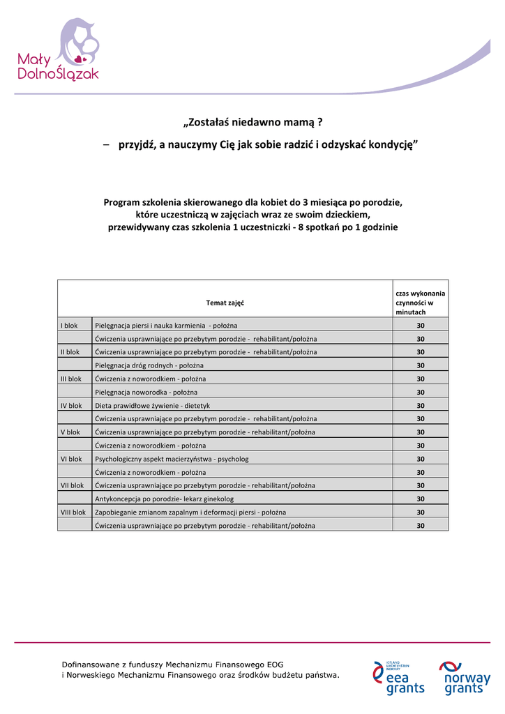 „Zostałaś niedawno mamą ? – przyjdź, a nauczymy Cię jak sobie radzić i odzyskać kondycję” Program szkolenia skierowanego dla kobiet do 3 miesiąca po porodzie, które uczestniczą w zajęciach wraz ze swoim dzieckiem, przewidywany czas szkolenia 1 uczestniczki -‐ 8 spotkań po 1 godzinie Temat zajęć czas wykonania czynności w minutach I blok Pielęgnacja piersi i nauka karmienia -‐ położna 30 Ćwiczenia usprawniające po przebytym porodzie -‐ rehabilitant/położna 30 II blok Ćwiczenia usprawniające po przebytym porodzie -‐ rehabilitant/położna 30 Pielęgnacja dróg rodnych -‐ położna 30 III blok Ćwiczenia z noworodkiem -‐ położna 30 Pielęgnacja noworodka -‐ położna 30 IV blok Dieta prawidłowe żywienie -‐ dietetyk 30 Ćwiczenia usprawniające po przebytym porodzie -‐ rehabilitant/położna 30 V blok Ćwiczenia usprawniające po przebytym porodzie -‐ rehabilitant/położna 30 Ćwiczenia z noworodkiem -‐ położna 30 VI blok Psychologiczny aspekt macierzyństwa -‐ psycholog 30 Ćwiczenia z noworodkiem -‐ położna 30 VII blok Ćwiczenia usprawniające po przebytym porodzie -‐ rehabilitant/położna 30 Antykoncepcja po porodzie-‐ lekarz ginekolog 30 VIII blok Zapobieganie zmianom zapalnym i deformacji piersi -‐ położna 30 Ćwiczenia usprawniające po przebytym porodzie -‐ rehabilitant/położna 30
