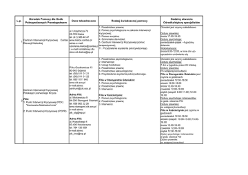 L.p. 1 Ośrodek Pomocy dla Osób Pokrzywdzonych Przestępstwem Centrum Interwencji Kryzysowej Diecezji Kieleckiej Rodzaj świadczonej pomocy 1. Poradnictwo prawne; 2. Pomoc psychologiczna w zakresie interwencji ul. Urzędnicza 7b kryzysowej; 25-729 Kielce 3. Pomoc socjalna; tel. (41) 366 48 47 4. Schronisko dla kobiet; Caritas www.kielce.caritas.pl 5. Centrum Interwencji Kryzysowej (pomoc adres e-mail: [email protected] terapeutyczna); 11. Przydzielanie asystenta pokrzywdzonego. l, e-mail kontaktowy dla stron:[email protected] Centrum Interwencji Kryzysowej Polskiego Czerwonego KrzyŜa 2 Dane teleadresowe Filie: 1. Punkt Interwncji Kryzysowej (PCK) "Kociewska Niebieska Linia" 2. Punkt Interwencji Kryzysowej (PCPR) Pl.ks.Gustkowicza 13 80-543 Gdańsk tel. (58) 511 01 21 tel. (58) 511 01 22 tel. 0801 011 843 www.cik.sos.pl e-mail.adres: [email protected] Adres Filii: ul. Mickiewicza 9 84-200 Starogard Gdański tel. 058 562 22 26 www.starogard.cik.sos.pl e-mail adres: [email protected] Adres Filii: ul. Krasickiego 4 83-400 Kościerzyna tel. 784 135 009 e-mail adres: [email protected] 1. Poradnictwo psychologiczne; 2. Interwencje; 3. Usługi hostelowe; 4. Poradnictwo prawne; 5. Poradnictwo seksuologiczne; 6. Przydzielanie asystenta pokrzywdzonego. Filia w Starogardzie Gdańskim: 1. Pomoc psychologiczna; 2. Poradnictwo prawne; 3. Interwenci. Filia w Kościerzynie: 1. Pomoc psychologiczna; 2. Poradnictwo prawne; 3. Interwenci. Godziny otwarcia Ośrodka/dyŜury specjalistów Ośrodek jest czynny całodobowo DyŜury prawnika: środa 17.00-19.00 DyŜury psychologa: poniedziałek-piątek - 4 godziny dziennie Wolontariusze: środa 8.00-12.00, w inne dni -po uprzednim umówieniu się Ośrodek jest czynny całodobowo: DyŜury psychologa: 7 dni w tygodniu przez 24 h/dobę DyŜury prawnika: Po wstępnej konsultacjii Filia w Starogardzie Gdańskim jest czynna w godzinach: poniedziałek 12.00-18.00 wtorek 12.00-18.00 środa 12.00-18.00 czwartek 12.00-18.00 piątek (zespół: 8.00-11.00) 12.0018.00 DyŜury psychologa i interwentów: w godz. otwarcia Filii DyŜury prawnika: po wstępnej konsultacji Filia w Kościerzynie jest czynna w godzinach: poniedziałek 12.00-18.00 wtorek (zespół: 10.00-13.00) 13.0018.00 środa 12.00-18.00 czwartek 12.00-18.00 piątek 12.00-18.00 DyŜury psychologa i interwentów: w godz. otwarcia Filii DyŜury prawnika: po wstępnej konsultacji 3 Elbląskie Centrum Mediacji i Aktywizacji Społecznej 1. Poradnictwo prawne; 2. Poradnictwo obywatelskie; ul. Franciszka Stefczyka 73. Poradnictwo psychologiczne; 8/6,6a,7 4.Terapia indywidulana i grupowa; 82-300 Elbląg 5. Prowadzenie mediacji; tel. 055 642 44 25 6. Interwencja kryzysowa; www.mediacje.elblag.pl 7. Pomoc socjalna; e-mail adres: 8. Rzecznictwo interesów; [email protected], 9. Spotkania edukacyjne z ofiarami przemocy domowej; [email protected] 10. Działania informacyjno-promocyjne; 11. Przydzielanie asystenta pokrzywdzonego. 1. Pomoc prawna; 2. Pomoc psychologiczna; 3. Pomoc socjalna; 4. Przydzielanie asystenta pokrzywdzonego; 5. Prowadzenie hostelu dla ofiar przemocy; ul. Brzozowa 9 6. Promowanie, ochrona i polepszenie jakości Ŝycia; 87-100 Toruń tel.(56) 657 58 61/ fax 657- 7. Zapobieganie patologiom społecznym, przemocy, alkoholizmowi, narkomanii oraz przestępczości wśród 58-62 nieletnich. www.azyltorun.org.pl e-mail adres: [email protected] Stowarzyszenie "Azyl" na Rzecz Pomocy Adres Filii: Kobietom i Dzieciom Ofiarom Przemocy ul. Przodowników Pracy 4 12 (Osiedle Kapuściska) Filia Ośrodka: Bydgoszcz OPOPP w Bydgoszczy tel. (56) 649 54 71 e-mail adres: [email protected] Adres Filii : siedziba Miejskiego Ośrodka Profilaktyki i UzaleŜnień, ul. Kamionka 6, 86-200 Chełmno Ośrodek jest czynny w dniach: poniedziałek - czwartek 9.00-18.00, piątek 9.00 do 14.00 DyŜury prawnika: poniedziałek-środa 16.00-18.00 piątek 12.00-14.00 DyŜury psychologa: środa 15.00-18.00 (pozostałe spotkania, w zaleŜności od zgłoszeń) Osoba pierwszego kontaktu: poniedziałek - piątek 10.00-16.00 Ośrodek jest czynny całodobowo: DyŜury prawnika: poniedziałek i środa 16.00-19.00 DyŜury psychologa: wtorek 17.00-20.00 Przyjmowanie zgłoszeń telefonicznych dot. spotkań ze specjalistami w godz. 10.00-20.00 pod nr kontaktowym Ośrodka DyŜury OPOPP w Bydgoszczy: prawnik: poniedziałek 16.00-19.00 DyŜury w Filii w Chełmnie : prawnik: 1 i 3 wtorek miesiąca, psycholog: 1 i 3 środa miesiąca 5 6 Katolickie Stowarzyszenie Pomocy Oosbom Potrzebującym "AGAPE" Lubuskie Stowarzyszenie na Rzecz Kobiet BABA ul. Bernardyńska 5 20-109 Lublin tel. (81) 534 38 87 www.agape.lublin.pl e-mail adres: [email protected] Stary Rynek 17 067 Zielona Góra tel. (68) 457 10 45 www.baba.org.pl e-mail adres: [email protected] 1. Konsultacje prawnika (poradnictwo prawne, pomoc w redagowaniu pism procesowych); 2. Konsultacje psychologa (wsparcie psychologiczne, Ośrodek czynny codziennie od.8.00poradnictwo psychologiczno-pedagogiczne); 19.00 3. Konsultacje specjalisty do spraw uzaleŜnień; W ośrodku pełnią dyŜury: 4. Konsultacje specjalisty do spraw przemocy; Prawnik; 5. Porady pedagogiczne; Psycholog; 6. Przydzielanie asystenta osoby pokrzywdzonej; Psycholog-specjalista terapii 7. Grupy socjoterapeutyczne dla dzieci i młodzieŜy; uzaleŜnień: 8. Grupy psychoedukacyjne dla rodziców i dzieci Psychoterapeuta; naduŜywających i uzaleŜnionych od narkotyków; Pracownik socjalny - specjalista ds. 9. Konsultacje socjalne; przemocy; 10.Konsultacje duszpasterskie; Psychoterapeuta-specjalista ds. dzieci 11.Punkt konsultacyjno-diagnostyczny w Lublinie krzywdzonych wykonujący nieodpłatnie i anonimowa badania w Duszpasterz: kierunku HIV; -na dyŜury specjalistów naleŜy zapisać 12. Grupy wsparcia dla anonimowych alkoholików i się telefonicznie pod numerem narkomanów; telefonu 081 534 38 87, bądź 13. Grupa dla dzieci skrzywdzonych przestępstwem; osobiście w siedzibie stowarzyszenia 14. Grupa terapeutyczna dla kobiet- ofiar przestępstw; 15