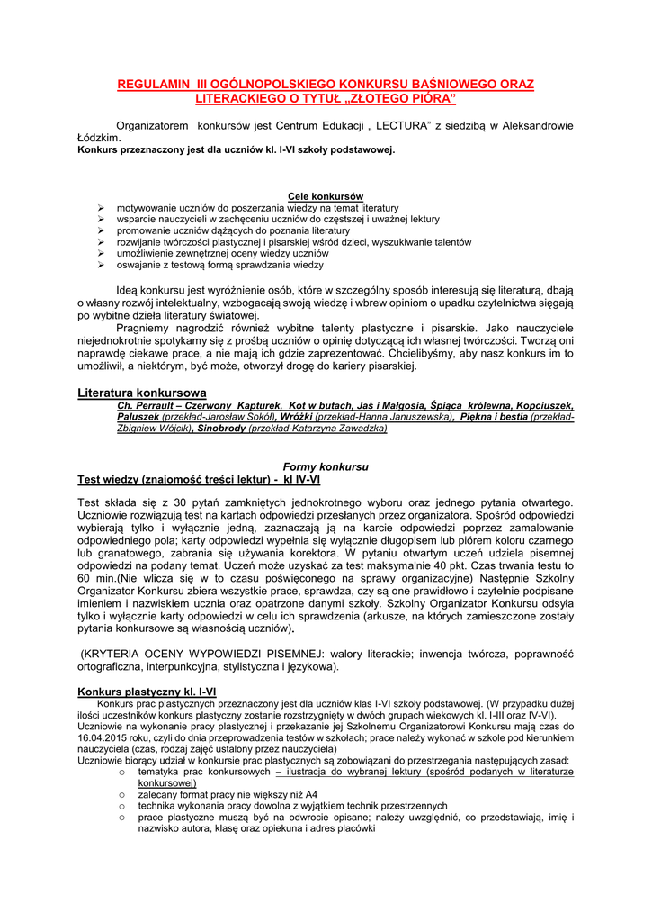 REGULAMIN III OGÓLNOPOLSKIEGO KONKURSU BAŚNIOWEGO ORAZ LITERACKIEGO O TYTUŁ „ZŁOTEGO PIÓRA” Organizatorem konkursów jest Centrum Edukacji „ LECTURA” z siedzibą w Aleksandrowie Łódzkim. Konkurs przeznaczony jest dla uczniów kl. I-VI szkoły podstawowej. Cele konkursów motywowanie uczniów do poszerzania wiedzy na temat literatury wsparcie nauczycieli w zachęceniu uczniów do częstszej i uważnej lektury promowanie uczniów dążących do poznania literatury rozwijanie twórczości plastycznej i pisarskiej wśród dzieci, wyszukiwanie talentów umożliwienie zewnętrznej oceny wiedzy uczniów oswajanie z testową formą sprawdzania wiedzy Ideą konkursu jest wyróżnienie osób, które w szczególny sposób interesują się literaturą, dbają o własny rozwój intelektualny, wzbogacają swoją wiedzę i wbrew opiniom o upadku czytelnictwa sięgają po wybitne dzieła literatury światowej. Pragniemy nagrodzić również wybitne talenty plastyczne i pisarskie. Jako nauczyciele niejednokrotnie spotykamy się z prośbą uczniów o opinię dotyczącą ich własnej twórczości. Tworzą oni naprawdę ciekawe prace, a nie mają ich gdzie zaprezentować. Chcielibyśmy, aby nasz konkurs im to umożliwił, a niektórym, być może, otworzył drogę do kariery pisarskiej. Literatura konkursowa Ch. Perrault – Czerwony Kapturek, Kot w butach, Jaś i Małgosia, Śpiąca królewna, Kopciuszek, Paluszek (przekład-Jarosław Sokół), Wróżki (przekład-Hanna Januszewska), Piękna i bestia (przekładZbigniew Wójcik), Sinobrody (przekład-Katarzyna Zawadzka) Formy konkursu Test wiedzy (znajomość treści lektur) - kl IV-VI Test składa się z 30 pytań zamkniętych jednokrotnego wyboru oraz jednego pytania otwartego. Uczniowie rozwiązują test na kartach odpowiedzi przesłanych przez organizatora. Spośród odpowiedzi wybierają tylko i wyłącznie jedną, zaznaczają ją na karcie odpowiedzi poprzez zamalowanie odpowiedniego pola; karty odpowiedzi wypełnia się wyłącznie długopisem lub piórem koloru czarnego lub granatowego, zabrania się używania korektora. W pytaniu otwartym uczeń udziela pisemnej odpowiedzi na podany temat. Uczeń może uzyskać za test maksymalnie 40 pkt. Czas trwania testu to 60 min.(Nie wlicza się w to czasu poświęconego na sprawy organizacyjne) Następnie Szkolny Organizator Konkursu zbiera wszystkie prace, sprawdza, czy są one prawidłowo i czytelnie podpisane imieniem i nazwiskiem ucznia oraz opatrzone danymi szkoły. Szkolny Organizator Konkursu odsyła tylko i wyłącznie karty odpowiedzi w celu ich sprawdzenia (arkusze, na których zamieszczone zostały pytania konkursowe są własnością uczniów). (KRYTERIA OCENY WYPOWIEDZI PISEMNEJ: walory literackie; inwencja twórcza, poprawność ortograficzna, interpunkcyjna, stylistyczna i językowa). Konkurs plastyczny kl. I-VI Konkurs prac plastycznych przeznaczony jest dla uczniów klas I-VI szkoły podstawowej. (W przypadku dużej ilości uczestników konkurs plastyczny zostanie rozstrzygnięty w dwóch grupach wiekowych kl. I-III oraz IV-VI). Uczniowie na wykonanie pracy plastycznej i przekazanie jej Szkolnemu Organizatorowi Konkursu mają czas do 16.04.2015 roku, czyli do dnia przeprowadzenia testów w szkołach; prace należy wykonać w szkole pod kierunkiem nauczyciela (czas, rodzaj zajęć ustalony przez nauczyciela) Uczniowie biorący udział w konkursie prac plastycznych są zobowiązani do przestrzegania następujących zasad: o tematyka prac konkursowych – ilustracja do wybranej lektury (spośród podanych w literaturze konkursowej) o zalecany format pracy nie większy niż A4 o technika wykonania pracy dowolna z wyjątkiem technik przestrzennych o prace plastyczne muszą być na odwrocie opisane; należy uwzględnić, co przedstawiają, imię i nazwisko autora, klasę oraz opiekuna i adres placówki o prace muszą być wykonane samodzielnie przez uczniów (KRYTERIA OCENY PRAC PLASTYCZNYCH: własna, niepowtarzalna i unikalna wizja, walory artystyczne pracy, wkład włożonej pracy). Ogólnopolski Konkurs Literacki o tytuł „Złotego Pióra” Uczniowie na napisanie pracy literackiej i przekazanie jej Szkolnemu Organizatorowi Konkursu mają czas do dnia 16.04.2015 roku, czyli do dnia przeprowadzenia testów w szkołach. Uczniowie biorący udział w konkursie prac literackich są zobowiązani do przestrzegania następujących zasad: o tematyka prac konkursowych dowolna (mogą to być prace wcześniej stworzone przez uczniów, ale nigdzie dotąd niepublikowane lub prace stworzone specjalnie na potrzeby konkursu) o forma – proza (nie więcej niż 3 strony A4) lub wiersz o zalecany zapis w formie komputeropisu o wszystkie prace muszą być na odwrocie opisane; należy uwzględnić: imię i nazwisko autora, klasę oraz opiekuna i adres placówki Do prac należy dołączyć oświadczenie podpisane przez autora i jego prawnego opiekuna o samodzielnym zredagowaniu pracy (przykładowy tekst oświadczenia dostępny poniżej) Przykładowy tekst oświadczenia: Oświadczam, że praca wysłana na konkurs CE „Lectura” została stworzona przeze mnie samodzielnie, nie przypisałem (-am) sobie autorstwa całości, istotnego fragmentu lub innych elementów cudzego utworu. ……………………………. ……………………………………………….. …………. Czytelny podpis autora Czytelny podpis rodzica (prawnego opiekuna) Data (KRYTERIA OCENY WYPOWIEDZI PISEMNEJ: walory literackie; inwencja twórcza, poprawność ortograficzna, interpunkcyjna, stylistyczna i językowa). Prace konkursowe nie podlegają zwrotowi. Organizator zastrzega sobie prawo do ich wystawiania i publikowania. Warunki uczestnictwa w konkursach Konkurs jest samofinansujący. Warunkiem uczestnictwa jest wpłata na rachunek bankowy organizatorów konkursu wynosząca 8 zł od osoby. Uczniowie biorący udział zarówno w teście, jak i w konkursie prac plastycznych i literackich wnoszą opłatę za wszystkie f
