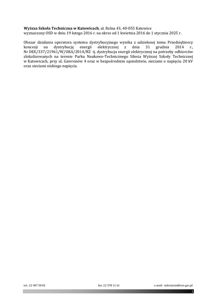 Wyższa Szkoła Techniczna w Katowicach, ul. Rolna 43, 40-055 Katowice wyznaczony OSD w dniu 19 lutego 2016 r. na okres od 1 kwietnia 2016 do 1 stycznia 2025 r. Obszar działania operatora systemu dystrybucyjnego wynika z udzielonej temu Przedsiębiorcy koncesji na dystrybucję energii elektrycznej z dnia 31 grudnia 2014 r., Nr DEE/337/21961/W/OKA/2014/RZ tj. dystrybucja energii elektrycznej na potrzeby odbiorców zlokalizowanych na terenie Parku Naukowo-Technicznego Silesia Wyższej Szkoły Technicznej w Katowicach, przy ul. Gawronów 4 oraz w bezpośrednim sąsiedztwie, sieciami o napięciu 20 kV oraz sieciami niskiego napięcia. tel.: 22 487 58 02 fax: 22 378 11 61 e-mail: [email protected] 1