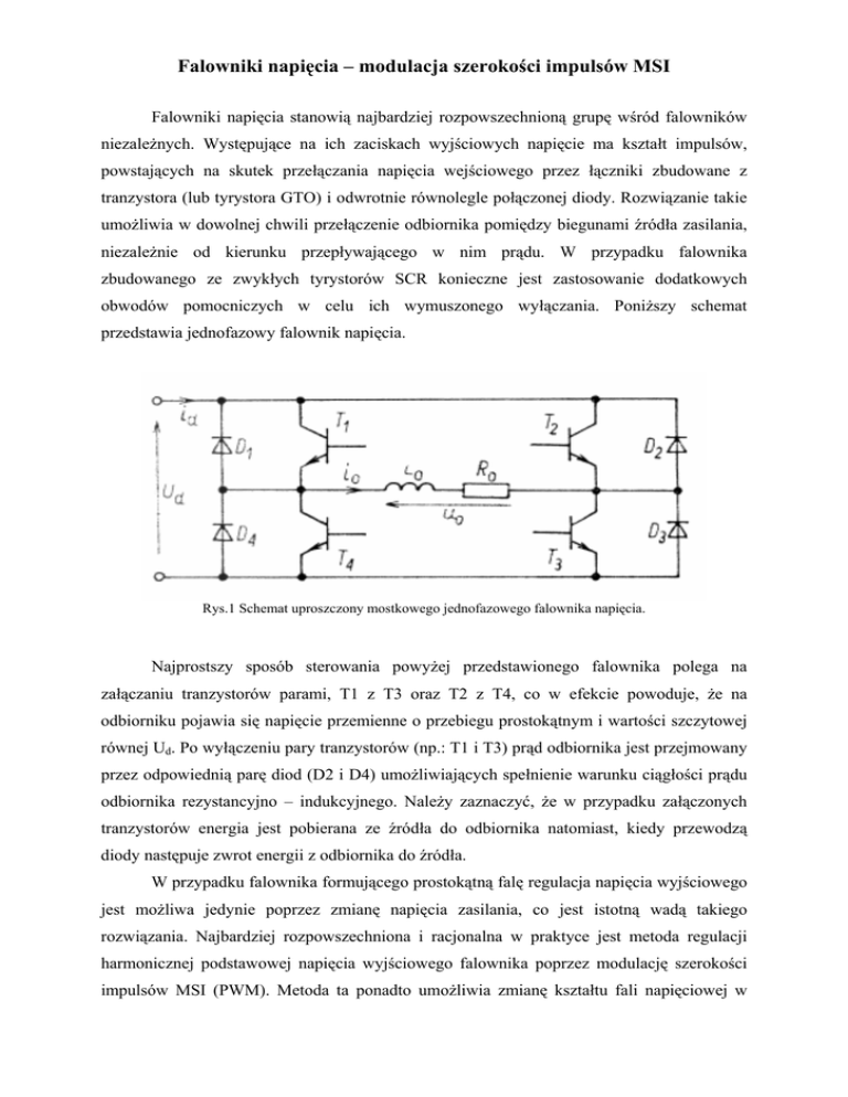 Falowniki napięcia – modulacja szerokości impulsów MSI Falowniki napięcia stanowią najbardziej rozpowszechnioną grupę wśród falowników niezależnych. Występujące na ich zaciskach wyjściowych napięcie ma kształt impulsów, powstających na skutek przełączania napięcia wejściowego przez łączniki zbudowane z tranzystora (lub tyrystora GTO) i odwrotnie równolegle połączonej diody. Rozwiązanie takie umożliwia w dowolnej chwili przełączenie odbiornika pomiędzy biegunami źródła zasilania, niezależnie od kierunku przepływającego w nim prądu. W przypadku falownika zbudowanego ze zwykłych tyrystorów SCR konieczne jest zastosowanie dodatkowych obwodów pomocniczych w celu ich wymuszonego wyłączania. Poniższy schemat przedstawia jednofazowy falownik napięcia. Rys.1 Schemat uproszczony mostkowego jednofazowego falownika napięcia. Najprostszy sposób sterowania powyżej przedstawionego falownika polega na załączaniu tranzystorów parami, T1 z T3 oraz T2 z T4, co w efekcie powoduje, że na odbiorniku pojawia się napięcie przemienne o przebiegu prostokątnym i wartości szczytowej równej Ud. Po wyłączeniu pary tranzystorów (np.: T1 i T3) prąd odbiornika jest przejmowany przez odpowiednią parę diod (D2 i D4) umożliwiających spełnienie warunku ciągłości prądu odbiornika rezystancyjno – indukcyjnego. Należy zaznaczyć, że w przypadku załączonych tranzystorów energia jest pobierana ze źródła do odbiornika natomiast, kiedy przewodzą diody następuje zwrot energii z odbiornika do źródła. W przypadku falownika formującego prostokątną falę regulacja napięcia wyjściowego jest możliwa jedynie poprzez zmianę napięcia zasilania, co jest istotną wadą takiego rozwiązania. Najbardziej rozpowszechniona i racjonalna w praktyce jest metoda regulacji harmonicznej podstawowej napięcia wyjściowego falownika poprzez modulację szerokości impulsów MSI (PWM). Metoda ta ponadto umożliwia zmianę kształtu fali napięciowej w sposób umożliwiający przesunięcie niepożądanych harmonicznych w zakres wysokich częstotliwości, przez co mogą one być stosunkowo łatwo odfiltrowane. Najbardziej rozpowszechnionym technicznym sposobem realizacji metody modulacji szerokości impulsów w celu uzyskania sinusoidalnego prądu odbiornika jest komparacja fali sinusoidalnej (sygnału modulującego) z sygnałem nośnym, którym może być: przebieg piłokształtny (modulacja jednostronna) lub trójkątny (modulacja dwustronna). W przypadku piłokształtnego sygnału nośnego jedno zbocze prostokątnego sygnału wyjściowego załączającego klucze ma względem sygnału nośnego ustalone położenie, natomiast położenie drugiego zbocza jest modulowane. Przy sygnale nośnym trójkątnym modulowane są położenia obu zboczy, stąd nazwa modulacja dwustronna. Sygnał modulujący ma kształt sinusoidy o częstotliwości równej podstawowej harmonicznej napięcia wyjściowego i amplitudzie proporcjonalnej do wymaganej amplitudy tej harmonicznej. Wykazane jest, że modulacja dwustronna daje korzystniejsze widmo napięcia i prądu odbiornika niż modulacja jednostronna. Rys. 2.Przebiegi czasowe dla modulacji dwustronnej.