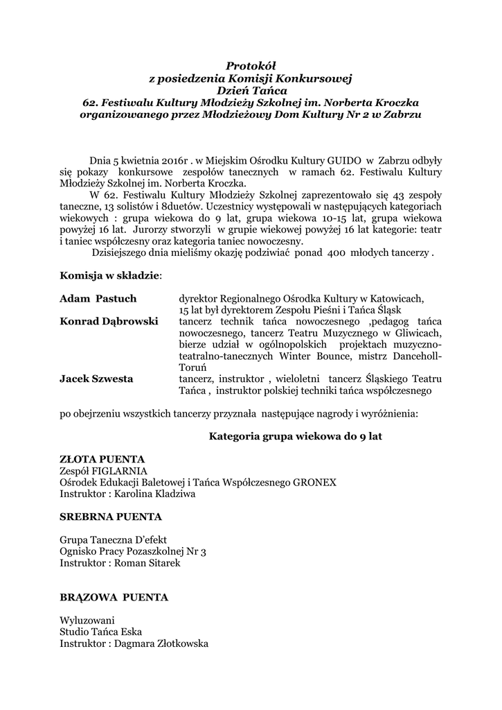Protokół z posiedzenia Komisji Konkursowej Dzień Tańca 62. Festiwalu Kultury Młodzieży Szkolnej im. Norberta Kroczka organizowanego przez Młodzieżowy Dom Kultury Nr 2 w Zabrzu Dnia 5 kwietnia 2016r . w Miejskim Ośrodku Kultury GUIDO w Zabrzu odbyły się pokazy konkursowe zespołów tanecznych w ramach 62. Festiwalu Kultury Młodzieży Szkolnej im. Norberta Kroczka. W 62. Festiwalu Kultury Młodzieży Szkolnej zaprezentowało się 43 zespoły taneczne, 13 solistów i 8duetów. Uczestnicy występowali w następujących kategoriach wiekowych : grupa wiekowa do 9 lat, grupa wiekowa 10-15 lat, grupa wiekowa powyżej 16 lat. Jurorzy stworzyli w grupie wiekowej powyżej 16 lat kategorie: teatr i taniec współczesny oraz kategoria taniec nowoczesny. Dzisiejszego dnia mieliśmy okazję podziwiać ponad 400 młodych tancerzy . Komisja w składzie: Adam Pastuch Konrad Dąbrowski Jacek Szwesta dyrektor Regionalnego Ośrodka Kultury w Katowicach, 15 lat był dyrektorem Zespołu Pieśni i Tańca Śląsk tancerz technik tańca nowoczesnego ,pedagog tańca nowoczesnego, tancerz Teatru Muzycznego w Gliwicach, bierze udział w ogólnopolskich projektach muzycznoteatralno-tanecznych Winter Bounce, mistrz DancehollToruń tancerz, instruktor , wieloletni tancerz Śląskiego Teatru Tańca , instruktor polskiej techniki tańca współczesnego po obejrzeniu wszystkich tancerzy przyznała następujące nagrody i wyróżnienia: Kategoria grupa wiekowa do 9 lat ZŁOTA PUENTA Zespół FIGLARNIA Ośrodek Edukacji Baletowej i Tańca Współczesnego GRONEX Instruktor : Karolina Kladziwa SREBRNA PUENTA Grupa Taneczna D’efekt Ognisko Pracy Pozaszkolnej Nr 3 Instruktor : Roman Sitarek BRĄZOWA PUENTA Wyluzowani Studio Tańca Eska Instruktor : Dagmara Złotkowska Kategoria grupa wiekowa 10-15 lat ZŁOTA PUENTA Grupa Taneczna D’efekt Ognisko Pracy Pozaszkolnej Nr 3 Instruktor : Roman Sitarek SREBRNA PUENTA Zespół Taneczny MAK II Młodzieżowy Dom Kultury Nr 1 Instruktor Małgorzata Makowska Crazy Monkeys Młodzieżowy Dom Kultury Nr 2 Instruktor: Wiktor Woźniczko Zespół Taneczny Szajba Azyl Studio Tańca i Ruchu Instruktor Wioletta Lewandowska BRĄZOWA PUENTA Zespół taneczny Szeptem Ośrodek Edukacji Baletowej i Tańca Współczesnego GRONEX Instruktor : Karolina Kladziwa TDK CREW Zespół Szkolno-Przedszkolny Trzebinia Instruktor: Tomasz Podgórski Kategoria grupa wiekowa powyżej 16 lat Teatr i taniec współczesny ZŁOTA PUENTA Młodzieżowy Teatr Tańca Młodzieżowy Dom Kultury Nr 2 Instruktor: Kamila Zduniak Zespół Za mgła Ośrodek Edukacji Baletowej i Tańca Współczesnego GRONEX Instruktor : Magdalena Wojnarowicz- Klimas SREBRNA PUENTA Zespół Taneczny Mak III Młodzieżowy Dom Kultury Nr 1 Instruktor: Małgorzata Makowska Taniec nowoczesny ZŁOTA PUENTA Zespół Fresz Trendy Azyl Studio Tańca i Ruchu Instruktor: Wioletta Lewandowska SREBRNA PUENTA Zespół JUST KIDDING Studio Tańca Ulicznego OPP4 CET Zabrze Instruktor: Agata Zeliszek SOLIŚCI ZŁOTA PUENTA Patrycja Janusek Studio Tańca Ulicznego OPP4-CET Instruktor Agata Zeliszek Wyróżnienie Liliana Kowalska Ośrodek Edukacji Baletowej i Tańca Współczesnego GRONEX Instruktor : Magdalena Wojnarowicz- Klimas Zuzanna Flakus Ośrodek Edukacji Baletowej i Tańca Współczesnego GRONEX Instruktor : Karolina Kladziwa DUETY ZŁOTA PUENTA Paulina Łaba/Marta Stawiarska Ośrodek Edukacji Baletowej i Tańca Współczesnego GRONEX Instruktor Magdalena Wojnarowicz-Klimas GRAND PRIX Justyna Szymańska Młodzieżowy Dom Kultury Nr2 Wnioski i wskazówki Jurorów po obejrzeniu Dnia Tańca w dniu 5.04.2016r: 1. Muzyka powinna stać się inspiracja do tworzenia choreografii, a nie tylko pretekstem i tłem do występu artystycznego. 2. Nauczyciele i instruktorzy proszeni są o organizowanie wewnętrznych przesłuchań, mających na celu wyłonienie najlepszych zespołów reprezentujących placówkę na Festiwalu. 3. Festiwal ma aspekt wychowawczy , dlatego należy przygotować uczestników do kulturalnego odbioru występów innych wykonawców. 4. Należy nie ograniczać się tylko do gatunków tanecznych lansowanych przez media, ale pomyśleć również o tańcach charakterystycznych / różnorodność/ Serdecznie dziękujemy wszystkim uczestnikom, nauczycielom i instruktorom za współtworzenie kształtu artystycznego Festiwalu. Dziękuję Dyrekcji Miejskiego Ośrodka Kultury za udostępnienie sali wraz ze sprzętem nagłaśniającym, pracownikom obsługi, pracownikom Młodzieżowego Domu Kultury Nr 2 za wszelką pomoc w organizacji Dnia Tańca. Dziękuję Jurorom za fachowość i obiektywizm w ocenie uczestników. Wioletta Muzykant Organizator Dnia Tańca Festiwalu