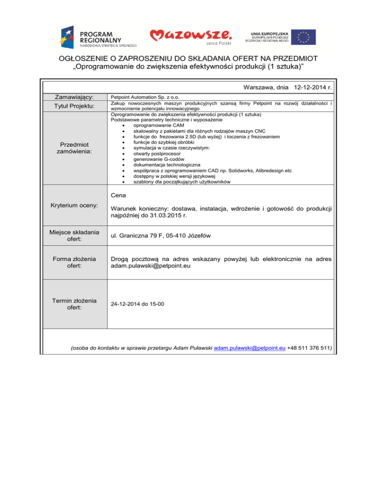 OGŁOSZENIE O ZAPROSZENIU DO SKŁADANIA OFERT NA PRZEDMIOT „Oprogramowanie do zwiększenia efektywności produkcji (1 sztuka)” Warszawa, dnia 12-12-2014 r. Zamawiający: Tytuł Projektu: Przedmiot zamówienia: Petpoint Automation Sp. z o.o. Zakup nowoczesnych maszyn produkcyjnych szansą firmy Petpoint na rozwój działalności i wzmocnienie potencjału innowacyjnego Oprogramowanie do zwiększenia efektywności produkcji (1 sztuka) Podstawowe parametry techniczne i wyposażenie oprogramowanie CAM skalowalny z pakietami dla różnych rodzajów maszyn CNC funkcje do frezowania 2.5D (lub wyżej) i toczenia z frezowaniem funkcje do szybkiej obróbki symulacja w czasie rzeczywistym: otwarty postprocesor generowanie G-codów dokumentacja technologiczna współpraca z oprogramowaniem CAD np. Solidworks, Alibredesign etc dostępny w polskiej wersji językowej szablony dla początkujących użytkowników Cena Kryterium oceny: Miejsce składania ofert: Warunek konieczny: dostawa, instalacja, wdrożenie i gotowość do produkcji najpóźniej do 31.03.2015 r. ul. Graniczna 79 F, 05-410 Józefów Forma złożenia ofert: Drogą pocztową na adres wskazany powyżej lub elektronicznie na adres [email protected] Termin złożenia ofert: 24-12-2014 do 15-00 (osoba do kontaktu w sprawie przetargu Adam Puławski [email protected] +48 511 376 511)