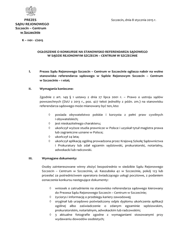 PREZES SĄDU REJONOWEGO Szczecin – Centrum w Szczecinie Szczecin, dnia 8 stycznia 2015 r. K – 1101 - 1/2015 OGŁOSZENIE O KONKURSIE NA STANOWISKO REFERENDARZA SĄDOWEGO W SĄDZIE REJONOWYM SZCZECIN – CENTRUM W SZCZECINIE I. Prezes Sądu Rejonowego Szczecin – Centrum w Szczecinie ogłasza nabór na wolne stanowisko referendarza sądowego w Sądzie Rejonowym Szczecin – Centrum w Szczecinie – 1 etat; II. Wymagania konieczne: Zgodnie z art. 149 § 1 ustawy z dnia 27 lipca 2001 r. – Prawo o ustroju sądów powszechnych (DzU z 2013 r., poz. 427 tekst jednolity z późn. zm.) na stanowisku referendarza sądowego może mianowany być ten, kto: ◊ ◊ ◊ ◊ ◊ III. posiada obywatelstwo polskie i korzysta z pełni praw cywilnych i obywatelskich; jest nieskazitelnego charakteru; ukończył wyższe studia prawnicze w Polsce i uzyskał tytuł magistra prawa lub zagraniczne uznane w Polsce; ukończył 24 lata; ukończył aplikację ogólną prowadzona przez Krajową Szkołę Sądownictwa i Prokuratury lub zdał egzamin sędziowski, prokuratorski, notarialny, adwokacki lub radcowski. Wymagane dokumenty: Osoby zainteresowane winny złożyć bezpośrednio w siedzibie Sądu Rejonowego Szczecin – Centrum w Szczecinie, ul. Kaszubska 42 w Szczecinie, pokój 123 lub przesłać za pośrednictwem operatora świadczącego usługi pocztowe, z podaniem oznaczenia konkursu następujące dokumenty: ◊ ◊ ◊ ◊ wniosek o zatrudnienie na stanowisko referendarza sądowego kierowany do Prezesa Sądu Rejonowego Szczecin – Centrum w Szczecinie; życiorys i informację o przebiegu kariery zawodowej; oryginał lub urzędowo poświadczony odpis dyplomu ukończenia aplikacji ogólnej albo zaświadczenie o zdanym egzaminie sędziowskim, prokuratorskim, notarialnym, adwokackim lub radcowskim; 3 aktualne fotografie zgodne z wymaganiami stosowanymi przy wydawaniu dowodów osobistych; ◊ ◊ ◊ ◊ ◊ oświadczenie, że jest obywatelem Rzeczypospolitej Polskiej i korzysta z pełni praw cywilnych i obywatelskich; świadectwa pracy z poprzednich miejsc zatrudnienia; kwestionariusz osobowy dla osoby ubiegającej się o zatrudnienie; zgodę na przetwarzanie danych osobowych kandydata zawartych w zgłoszeniu do konkursu dla potrzeb niezbędnych do realizacji zatrudnienia na stanowisko referendarza sądowego zgodnie z ustawą z dnia 19 sierpnia 1997 r. o ochronie danych osobowych (DzU z 2014 r., poz. 1182 tekst jednolity); oświadczenie, czy jest prowadzone przeciwko kandydatowi postępowanie o przestępstwo ścigane z oskarżenia publicznego lub przestępstwo skarbowe. Do zgłoszenia kandydat może dołączyć dokumenty potwierdzające dodatkowe kwalifikacje i osiągnięcia. IV. Kompletne oferty z podaniem oznaczenia konkursu należy składać w nieprzekraczalnym terminie do dnia 30 stycznia 2015 roku w Oddziale Kadr Sądu Rejonowego Szczecin – Centrum w Szczecinie pokój 123 lub przesłać za pośrednictwem poczty (decyduje data stempla pocztowego) na adres: Sąd Rejonowy Szczecin – Centrum w Szczecinie Oddział Kadr ul. Kaszubska 42 70 – 952 Szczecin V. Termin, miejsce i zakres przedmiotowy konkursu. Konkurs na stanowisko referendarza sądowego Sądu Rejonowego Szczecin – Centrum w Szczecinie odbędzie się w dniu 16 lutego 2015 roku, godz. 9.00, sala 404, w Sali Konferencyjnej Sądu Okręgowego w Szczecinie, ul. Limanowskiego 1. Zgodnie z § 7 ust. 1 Rozporządzenia Ministra Sprawiedliwości z dnia 22 marca 2012 r. w sprawie przeprowadzania konkursu na stanowisko referendarza sądowego (DzU z 2012 r., poz. 331) konkurs na stanowisko referendarza sądowego jest przeprowadzany w formie pisemnej. Konkurs składa się z dwóch etapów: ◊ ◊ etapu pierwszego – wstępnej weryfikacji zgłoszeń kandydatów pod kątem spełnienia wymogów formalnych przystąpienia do konkursu; etapu drugiego - testu obejmującego 36 pytań z zakresu prawa cywilnego, postępowania cywilnego oraz z zakresu prawa handlowego, a także dwóch kazusów, których rozwiązanie polega na opracowaniu projektu postanowienia sądu wraz z uzasadnieniem - po jednym z zakresu prawa cywilnego, postępowania cywilnego lub prawa handlowego oraz z zakresu postępowania wieczystoksięgowego. Po sprawdzeniu, czy zgłoszenia spełniają wymogi formalne określone w § 3 ust. 1 Rozporządzenia Ministra Sprawiedliwości z dnia 22 marca 2012 r. w sprawie przeprowadzania konkursu na stanowisko referendarza sądowego (DzU z 2012 r., poz. 331) oraz czy kandydaci odpowiadają wymaganiom formalnym określonym w art. 149 § 1 ustawy z dnia 27 lipca 2001 r. – Prawo o ustroju sądów powszechnych (DzU z 2013 r., poz. 427 tekst jednolity z późn. zm.) Prezes Sądu ustali listę kandydatów dopuszczonych do konkursu i umieści ją na tablicy ogłoszeń sądu oraz na stronie internetowej sądu najpóźniej na 7 dni przed terminem rozpoczęcia konkursu. Osoby, które nie złożą kompletu dokumentów, także osoby, które nie będą spełniały warunków ustawowych, nie zostaną dopuszczone do dalszego etapu postępowania konkursowego. Prezes Sądu Rejonowego Szczecin – Centrum w Szczecinie /-/ Robert Bury