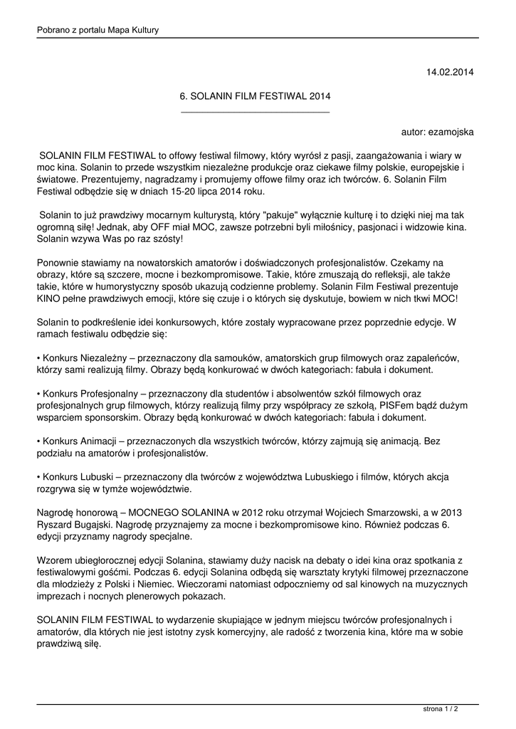 Pobrano z portalu Mapa Kultury 14.02.2014 6. SOLANIN FILM FESTIWAL 2014 ____________________________ autor: ezamojska SOLANIN FILM FESTIWAL to offowy festiwal filmowy, który wyrósł z pasji, zaangażowania i wiary w moc kina. Solanin to przede wszystkim niezależne produkcje oraz ciekawe filmy polskie, europejskie i światowe. Prezentujemy, nagradzamy i promujemy offowe filmy oraz ich twórców. 6. Solanin Film Festiwal odbędzie się w dniach 15-20 lipca 2014 roku. Solanin to już prawdziwy mocarnym kulturystą, który "pakuje" wyłącznie kulturę i to dzięki niej ma tak ogromną siłę! Jednak, aby OFF miał MOC, zawsze potrzebni byli miłośnicy, pasjonaci i widzowie kina. Solanin wzywa Was po raz szósty! Ponownie stawiamy na nowatorskich amatorów i doświadczonych profesjonalistów. Czekamy na obrazy, które są szczere, mocne i bezkompromisowe. Takie, które zmuszają do refleksji, ale także takie, które w humorystyczny sposób ukazują codzienne problemy. Solanin Film Festiwal prezentuje KINO pełne prawdziwych emocji, które się czuje i o których się dyskutuje, bowiem w nich tkwi MOC! Solanin to podkreślenie idei konkursowych, które zostały wypracowane przez poprzednie edycje. W ramach festiwalu odbędzie się: • Konkurs Niezależny – przeznaczony dla samouków, amatorskich grup filmowych oraz zapaleńców, którzy sami realizują filmy. Obrazy będą konkurować w dwóch kategoriach: fabuła i dokument. • Konkurs Profesjonalny – przeznaczony dla studentów i absolwentów szkół filmowych oraz profesjonalnych grup filmowych, którzy realizują filmy przy współpracy ze szkołą, PISFem bądź dużym wsparciem sponsorskim. Obrazy będą konkurować w dwóch kategoriach: fabuła i dokument. • Konkurs Animacji – przeznaczonych dla wszystkich twórców, którzy zajmują się animacją. Bez podziału na amatorów i profesjonalistów. • Konkurs Lubuski – przeznaczony dla twórców z województwa Lubuskiego i filmów, których akcja rozgrywa się w tymże województwie. Nagrodę honorową – MOCNEGO SOLANINA w 2012 roku otrzymał Wojciech Smarzowski, a w 2013 Ryszard Bugajski. Nagrodę przyznajemy za mocne i bezkompromisowe kino. Również podczas 6. edycji przyznamy nagrody specjalne. Wzorem ubiegłorocznej edycji Solanina, stawiamy duży nacisk na debaty o idei kina oraz spotkania z festiwalowymi gośćmi. Podczas 6. edycji Solanina odbędą się warsztaty krytyki filmowej przeznaczone dla młodzieży z Polski i Niemiec. Wieczorami natomiast odpoczniemy od sal kinowych na muzycznych imprezach i nocnych plenerowych pokazach. SOLANIN FILM FESTIWAL to wydarzenie skupiające w jednym miejscu twórców profesjonalnych i amatorów, dla których nie jest istotny zysk komercyjny, ale radość z tworzenia kina, które ma w sobie prawdziwą siłę. strona 1 / 2 Pobrano z portalu Mapa Kultury Mamy nadzieję, że również po 6. edycji Solanina wszyscy będziemy mogli potwierdzić, że OFF TO MOC!!! strona 2 / 2