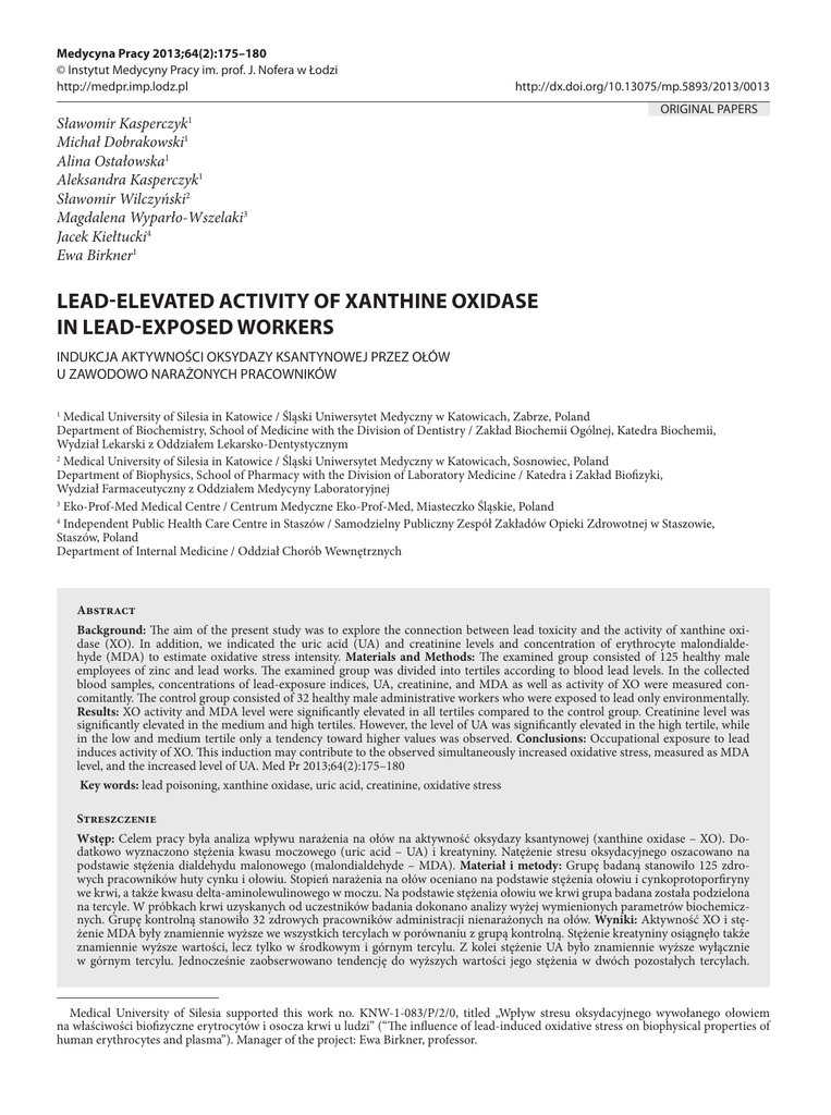 Medycyna Pracy 2013;64(2):175–180 © Instytut Medycyny Pracy im. prof. J. Nofera w Łodzi http://medpr.imp.lodz.pl http://dx.doi.org/10.13075/mp.5893/2013/0013 Sławomir Kasperczyk1 Michał Dobrakowski1 Alina Ostałowska1 Aleksandra Kasperczyk1 Sławomir Wilczyński2 Magdalena Wyparło-Wszelaki3 Jacek Kiełtucki4 Ewa Birkner1 ORIGINAL PAPERS LEAD-ELEVATED ACTIVITY OF XANTHINE OXIDASE IN LEAD-EXPOSED WORKERS INDUKCJA AKTYWNOŚCI OKSYDAZY KSANTYNOWEJ PRZEZ OŁÓW U ZAWODOWO NARAŻONYCH PRACOWNIKÓW Medical University of Silesia in Katowice / Śląski Uniwersytet Medyczny w Katowicach, Zabrze, Poland Department of Biochemistry, School of Medicine with the Division of Dentistry / Zakład Biochemii Ogólnej, Katedra Biochemii, Wydział Lekarski z Oddziałem Lekarsko-Dentystycznym 2 Medical University of Silesia in Katowice / Śląski Uniwersytet Medyczny w Katowicach, Sosnowiec, Poland Department of Biophysics, School of Pharmacy with the Division of Laboratory Medicine / Katedra i Zakład Biofizyki, Wydział Farmaceutyczny z Oddziałem Medycyny Laboratoryjnej 3 Eko-Prof-Med Medical Centre / Centrum Medyczne Eko-Prof-Med, Miasteczko Śląskie, Poland 4 Independent Public Health Care Centre in Staszów / Samodzielny Publiczny Zespół Zakładów Opieki Zdrowotnej w Staszowie, Staszów, Poland Department of Internal Medicine / Oddział Chorób Wewnętrznych 1 Abstract Background: The aim of the present study was to explore the connection between lead toxicity and the activity of xanthine oxidase (XO). In addition, we indicated the uric acid (UA) and creatinine levels and concentration of erythrocyte malondialdehyde (MDA) to estimate oxidative stress intensity. Materials and Methods: The examined group consisted of 125 healthy male employees of zinc and lead works. The examined group was divided into tertiles according to blood lead levels. In the collected blood samples, concentrations of lead-exposure indices, UA, creatinine, and MDA as well as activity of XO were measured concomitantly. The control group consisted of 32 healthy male administrative workers who were exposed to lead only environmentally. Results: XO activity and MDA level were significantly elevated in all tertiles compared to the control group. Creatinine level was significantly elevated in the medium and high tertiles. However, the level of UA was significantly elevated in the high tertile, while in the low and medium tertile only a tendency toward higher values was observed. Conclusions: Occupational exposure to lead induces activity of XO. This induction may contribute to the observed simultaneously increased oxidative stress, measured as MDA level, and the increased level of UA. Med Pr 2013;64(2):175–180 Key words: lead poisoning, xanthine oxidase, uric acid, creatinine, oxidative stress Streszczenie Wstęp: Celem pracy była analiza wpływu narażenia na ołów na aktywność oksydazy ksantynowej (xanthine oxidase – XO). Dodatkowo wyznaczono stężenia kwasu moczowego (uric acid – UA) i kreatyniny. Natężenie stresu oksydacyjnego oszacowano na podstawie stężenia dialdehydu malonowego (malondialdehyde – MDA). Materiał i metody: Grupę badaną stanowiło 125 zdrowych pracowników huty cynku i ołowiu. Stopień narażenia na ołów oceniano na podstawie stężenia ołowiu i cynkoprotoporfiryny we krwi, a także kwasu delta-aminolewulinowego w moczu. Na podstawie stężenia ołowiu we krwi grupa badana została podzielona na tercyle. W próbkach krwi uzyskanych od uczestników badania dokonano analizy wyżej wymienionych parametrów biochemicznych. Grupę kontrolną stanowiło 32 zdrowych pracowników administracji nienarażonych na ołów. Wyniki: Aktywność XO i stężenie MDA były znamiennie wyższe we wszystkich tercylach w porównaniu z grupą kontrolną. Stężenie kreatyniny osiągnęło także znamiennie wyższe wartości, lecz tylko w środkowym i górnym tercylu. Z kolei stężenie UA było znamiennie wyższe wyłącznie w górnym tercylu. Jednocześnie zaobserwowano tendencję do wyższych wartości jego stężenia w dwóch pozostałych tercylach. Medical University of Silesia supported this work no. KNW-1-083/P/2/0, titled „Wpływ stresu oksydacyjnego wywołanego ołowiem na właściwości biofizyczne erytrocytów i osocza krwi u ludzi” (“The influence of lead-induced oxidative stress on biophysical properties of human erythrocytes and plasma”). Manager of the project: Ewa Birkner, professor. 176 S. Kasperczyk et al. Nr 2 Wnioski: Zawodowe narażenie na ołów indukuje wzrost aktywności XO, który może przyczyniać się do nasilenia stresu oksydacyjnego, mierzonego jako stężenie MDA, i powodować wzrost stężenia UA. Med. Pr. 2013;64(2):175–180 Słowa kluczowe: zatrucie ołowiem, oksydaza ksantynowa, kwas moczowy, kreatynina, stres oksydacyjny Corresponding author: Department of Biochemistry, Medical University of Silesia, Jordana 19, 41-808 Zabrze, e-mail: [email protected] Received: 2013, February 7, accepted: 2013, April 5 INTRODUCTION Lead is a pleiotropic toxicant. Health effects at high blood lead levels are demonstrable, while the effects at lower blood levels of lead remain unclear (1). Despite the fact that there is no safe level of exposure to lead, it has been widely used in industry due to its malleability, resistance to corrosion, and low melting point. Lead accumulates in bones, liver, kidneys, and other organs one hour after intestinal absorption. Exposure to lead results in many adverse health effects, including behavioral disorders or the dysfunction of liver, kidneys and many systems of the human body, such as the hematological, the immunological, and the nervous system (2). The mechanisms involved in lead toxicity are poorly understood, nevertheless, it is well-documented that one of the most important toxic effects of lead is oxidative stress. Lead generates reactive oxygen species (ROS), such as superoxide radicals, hydrogen peroxide, or hydroxyl radicals, and wea