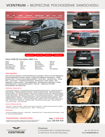 Volvo XC90 D5 Inscription AWD 7-os. Marka: Model: Rok Produkcji: Pojemność silnika : Kolor Nadwozia: Skrzynia biegów: Volvo XC90 2015 1969 cm3 Czarny Automat Przebieg : Moc silnika : Kolor Wnętrza: Rodzaj nadwozia: Ilość drzwi: Rodzaj paliwa: 5360 km 225 KM Brązowy SUV 4/5 Olej napędowy OPIS POJAZDU: Data pierwszej rejestracji: 19.02.2016 Dokument sprzedaży: Faktura Vat 23% Najbogatsza wersja wyposażenia Inscription. Wersja 7-miejscowa Dodatkowe wyposażenie: - Pakiet Business Pack + Premium Sound Bowers&Wilkins - Family Pack - Versatility Pack - Winter Pack - Luxury Seat - 4 strefowa klimatyzacja - Klimatyzacja 3 rzędu siedzeń - Koło dojazdowe - Kamera cofania - Progi podświetlane - Pneumatyczne zawieszenie - Rolety przeciwsłoneczne - Przyciemniane lusterka - Koła 20\" - Odtwarzacz CD CENA KATALOGOWA: 354 590,00 PLN Dodatkowe Wyposażenie ✓20-calowe felgi aluminiowe ✓Automatycznie przyciemniane wewnętrzne lusterko wsteczne ✓Elektrycznie otwierana klapa bagażnika ✓Elektrycznie sterowany fotel kierowcy i pasażera z pamięcią ustawień ✓Elektrycznie sterowany hamulec postojowy ✓Elementy dekoracyjne aluminiowe ✓Kierownica wykończona skórą ✓Klimatyzacja automatyczna sterowana elektronicznie ✓Komputer pokładowy ✓Podgrzewane i wentylowane przednie fotele ✓Regulacja klimatyzacji w drugim rzędzie siedzeń ✓Spryskiwacze ciśnieniowe lamp ✓System bezkluczykowy Keyless Entry ✓System Start/Stop ✓Światła do jazdy dziennej LED ✓Zawieszenie pneumatyczne ✓System monitorowania ciśnienia w oponach ✓System nawigacji satelitarnej ✓Tempomat ✓Czujniki parkowania tył i przód ✓System monitorowania martwego pola - BLIS ✓Podgrzewane dysze spryskiwaczy ✓Tuner radia cyfrowego DAB ✓Reflektory Full LED ✓Drive Mode - regulacja trybów jazdy ✓Czujnik deszczu ✓Napęd AWD ✓Elektryczne szyby ✓Automatyczna skrzynia biegów ✓Skórzana tapicerka ✓Przyciemniane szyby ✓Trzeci rząd siedzeń Systemy Bezpieczeństwa ✓Servotronic ✓System City Safety ✓System kontroli zjazdu ze wzniesienia ✓Poduszka powietrzna kierowcy i pasażera ✓Poduszki przednie boczne ✓Poduszki tylne boczne ✓ISOFIX ✓Centralny zamek Multimedia ✓Kamera wspomagająca parkowanie ✓Gniazdo AUX ✓Gniazdo USB / iPod® ✓Zestaw głośnomówiący Bluetooth ✓Radio CD ✓Zestaw audio Bowers&Wilkins FINANSOWANIE I UBEZPIECZENIA: Przykładowa rata miesięczna, wpłata 20%, okres leasingu/kredytu 48 miesięcy, 10% wykupu. Rata leasingu jest wartością netto bez vat. Rata: 2 030 Cena: 289 900 PLN PLN Niniejsza treść nie stanowi oferty w rozumieniu przepisów Kodeksu Cywilnego oraz opisu towaru ani zapewnienia w rozumieniu art. 4 Ustawy z dnia 27 lipca 2002r o szczególnych warunkach sprzedaży konsumenckiej. Powered by TCPDF (www.tcpdf.org)