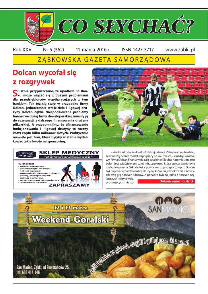 Rok XXV Nr 5 (362) 11 marca 2016 r. ISSN 1427-3717 www.zabki.pl Z ą b k o w s k a G a z e ta S a m o rz ą d o wa Dolcan wycofał się z rozgrywek S łusznie przypuszczano, że upadłość SK Banku może wiązać się z dużymi problemami dla przedsiębiorców współpracujących z tym bankiem. Tak też się stało w przypadku firmy Dolcan, jednocześnie właściciela I ligowej drużyny Dolcan Ząbki. Niespodziewane problemy finansowe dużej firmy deweloperskiej zmusiły ją do rezygnacji z dalszego finansowania drużyny piłkarskiej. A przypomnijmy, że sfinansowanie funkcjonowania I –ligowej drużyny to roczny koszt rzędu kilku milionów złotych. Praktycznie niewiele jest firm, które byłyby w stanie wydatkować takie kwoty na sponsoring. – Wielka szkoda, że doszło do takiej sytuacji. Żałujemy tym bardziej, że w naszej ocenie model współpracy na linii miasto – klub był wzorcowy. Firma Dolcan finansowała całą działalność klubu, natomiast miasto było i jest właścicielem całej infrastruktury, która sukcesywnie była rozbudowywana. Szkoda też z powodów czysto sportowych. Dolcan był naprawdę bardzo dobrą drużyną, która niejednokrotnie zachwyciła swą grą naszych kibiców. A ponadto była to jedna z naszych najlepszych wizytówek, Dokończenie na str. 5 promujących miasto CO SŁYCHAĆ ZAPOWIEDZI www.zabki.pl V semestr działalności Uniwersytet Otwarty dla każdego 16 lutego, w Gimnazjum Nr 1 przy ul. Harcerskiej 9 w Ząbkach odbyła się inauguracja V semestru. Na dwugodzinnym spotkaniu podana została informacja o zaplanowanych wykładach, imprezach oraz wycieczkach i wczasach w okresie wiosenno-letnim. Zainteresowanym został rozdany harmonogram zajęć, z tematami wykładów, z różnych dziedzin nauki, prowadzonych we wtorki, w godzinach 17.00 do 18.30. Opłaty semestralne wynoszą 60 zł + 20 zł wpisowe. Ponadto Uniwersytet prowadzi zajęcia fakultatywne, tj. naukę z podstaw obsługi komputera, naukę języka angielskiego dla zaawansowanych i początkujących, zawsze w poniedziałki w godzinach począwszy od 16.45 (godziny do ustalenia). Opłaty są ulgowe i wynoszą dla członków za cały kurs (tj. do wakacji) komputerowy 100 zł oraz za cały kurs językowy 120 zł. ZAPRASZAMY WSZYSTKICH, którzy dysponują wolną chwilą w tych dniach i godzinach tj. poniedziałki i wtorki, od godziny 16.45., i którzy pragną podwyższyć swoją wiedzę i mają coś do zaoferowania, własną pasję czy pomysły. Jesteśmy otwarci na wszelkiego rodzaju propozycje i inicjatywy obywatelskie. Więcej informacji i bezpośredni kontakt na spotkaniach uniwersyteckich, udzieli P. Jadwiga Suk - prezes S-PUO, tel.510-236-436, lub (22) 776-36-36, e-mail <[email protected]>. „Na pełnym morzu“ to historia trojga rozbitków na tratwie, to historia o starciu jednostki z większością, o wolności wyboru. Dyktaturę, anarchię traktujemy jednoznacznie jako złe, ale czy prawdziwa demokracja zawsze potrafi obronić jednostkę? Sztuki Sławomira Mrożka właściwie nie wymagają specjalnych zabiegów adaptacyjnych – tekst broni się sam. Postacie, jakie autor stworzył w licznych sztukach to personifikacje powszechnych ludzkich cech charakterów, słabostek i wad, które to prowadzą do powstawania absurdów życia codziennego. Nieważne czy „gramy Mrożka“ w czasach socjalizmu czy kapitalizmu, wynaturzenia każdego systemu mają swoje źródło w naturze ludzkiej: w każdej epoce historycznej i ustroju ktoś dąży do dominacji nad innymi. CO SŁYCHAĆ? Wydawca: Urząd Miasta w Ząbkach Redaktor naczelny: Mirosław Oleksiak e-mail: [email protected], tel. 694 759 987 Redakcja: ul. Wojska Polskiego 10, Ząbki, tel. 22 5109 793 Druk: Drukarnia Rajgraf, ul. Mazowiecka 50B, 05-120 Legionowo, tel. 22 784 86 58 Redakcja nie odpowiada za treść ogłoszeń i reklam. Nakład 6000 egz. 2 DYŻURY REDAKCYJNE: red. Mirosław Oleksiak Urząd Miasta pok. nr 28 poniedziałki godz. 16.00–18.00 piątki godz. 8.00–10.00 Zapowiedzi www.zabki.pl CO SŁYCHAĆ ZAPROSZENIE NA SPOTKANIE Z RADNYMI we wtorek, 15 marca 2016 roku, o godz. 18:30 w sali gimnastycznej Prywatnej Szkoły Podstawowej przy ul. Piłsudskiego 95 C w Ząbkach (obok Kauflandu), Planowana tematyka spotkania informacyjnego obejmować będzie: • zmianę planu zagospodarowania przestrzennego (od Skrajnej do Herberta), • zmianę lokalizacji gminnego placu zabaw (z Różanej na Reymonta), • planowane inwestycje w południowych Ząbkach (drogi, szkoła), Zapraszają Radni z rejonu ul. Powstańców i Piłsudskiego Paweł Uściński, Janusz Dąbrowski, Joanna Dąbrowska, Tomasz Szymczak i Artur Wałachowski M i e j s k i O ś r o d e k K u lt u r y z a p r a s z a n a K I E R M A S Z Ś W I ĄT E C Z N Y na którym swoje rękodzieło wystawią twórcy z Ząbek i okolic. Obejrzeć i zakupić będzie można wyroby użytkowe i dekoracyjne, związane z nadchodzącymi świętami i wiosną. Zapraszamy do sali widowiskowej MOK przy ul. Słowackiego 21 (Trybuna Dolcan) w niedzielę 20 marca w godz.1100-1700 Przyjmowanie zeznań podatkowych Druki PIT w Urzędzie Miasta że w Urzędzie za 2015 rok Informujemy, Miasta (I piętro) dostępne są W dniach 21 marca i 11 kwietnia 2016 roku, w godz. od 10:00 do 16:00, w sali konferencyjnej Urzędu Miasta Ząbki odbędą się dyżur pracowników Urzędu Skarbowego w Wołominie. Podczas dyżuru uzyskasz pomoc w złożeniu zeznania podatkowego PIT za 2015 rok. Przychodząc w tym dniu będziesz mógł wysłać swój PIT przez Internet. Przekonasz się, jaki to prosty, szybki i bezpieczny sposób rozliczenia podatkowego. Zabierz ze sobą wszystkie informacje od płatników oraz kwotę przychodu osiągniętego za 2015 rok. Serdecznie zapraszamy! GABINET LEKARSKI ANDRZEJ KACZOREK – – – – – – – Ząbki ul. Niepodległości 1A internista specjalista med. rodzinnej i medycyny pracy badania profilaktyczne pracowników (wstępne, okresowe, kontrolne) badania dla celów sanitarno-e