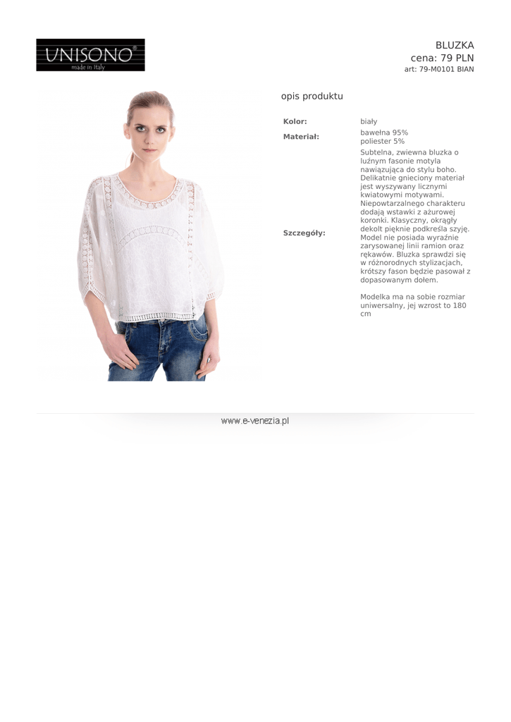 BLUZKA cena: 79 PLN art: 79-M0101 BIAN opis produktu Kolor: biały Materiał: bawełna 95% poliester 5% Szczegóły: Subtelna, zwiewna bluzka o luźnym fasonie motyla nawiązująca do stylu boho. Delikatnie gnieciony materiał jest wyszywany licznymi kwiatowymi motywami. Niepowtarzalnego charakteru dodają wstawki z ażurowej koronki. Klasyczny, okrągły dekolt pięknie podkreśla szyję. Model nie posiada wyraźnie zarysowanej linii ramion oraz rękawów. Bluzka sprawdzi się w różnorodnych stylizacjach, krótszy fason będzie pasował z dopasowanym dołem. Modelka ma na sobie rozmiar uniwersalny, jej wzrost to 180 cm