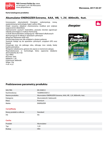 PBS Connect Polska Sp. z o.o. ul. Annopol 3, 03-236 Warszawa www.pbspolska.eu Warszawa, 2017-03-07 Karta katalogowa produktu: Akumulator ENERGIZER Extreme, AAA, HR, 1, 2V, 800mAh, 4szt. Innowacyjne akumulatorki Energizer wykorzystują nową, opatentowaną technologię Super Lattice Alloy Dzięki nowemu składowi chemicznemu możliwe jest większe zagęszczenie składników Zastosowanie czystych materiałów, pozwala również ograniczyć odpady powstające w reakcji chemicznej 4 sztuki akumulatorków zastępują do 1400 baterii alkalicznych Wytrzymują do 6x dłużej w aparatach cyfrowych Mogą być ładowane setki razy Dostarczają dużą moc dla urządzeń o dużym poborze Świetnie nadaje się do aparatów cyfrowych, urządzeń GPS oraz latarek Utrzymuje moc do jednego roku, oferując moc wtedy, kiedy będzie potrzebna Wstępnie naładowane, gotowe do użycia w momencie zakupu Wyprodukowane w technologii, która zapewnia działanie akumulatorka do 5 lat Typ: HR03 Rozmiar: AAA Napięcie: 1,2V Pojemność: 800mAh Waga: 12g 4 szt. w j.s. Podstawowe parametry produktu SKU PBS EN-350012 Kod kreskowy 7638900350012 Nazwa produktu Akumulator ENERGIZER Extreme, AAA, HR, 1,2V, 800mAh, 4szt. Kategoria Akumulatorki i ładowarki Klasa Premium Marka ENERGIZER Certyfikaty Nowy produkt w ofercie Standard Hit Hit Cecha Produkt Akumulator Typ 1,2V Rodzaj HR3 PBS Connect Polska Sp. z o.o. ul. Annopol 3, 03-236 Warszawa www.pbspolska.eu Warszawa, 2017-03-07 Karta katalogowa produktu cd. Akumulator ENERGIZER Extreme, AAA, HR, 1, 2V, 800mAh, 4szt. Podstawowe parametry produktu W ofercie od 2015-07 Wymiary Rozmiar AAA Wymiary (mm) Średnica: 10,5 wysokość: 44,5 Zamiennik Zamiennik EN-416879 Wspólny słownik zamówień CPV 31411000-0 Jednostki logistyczne Opakowanie 1 12 op Opakowanie 2 10296 op