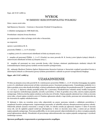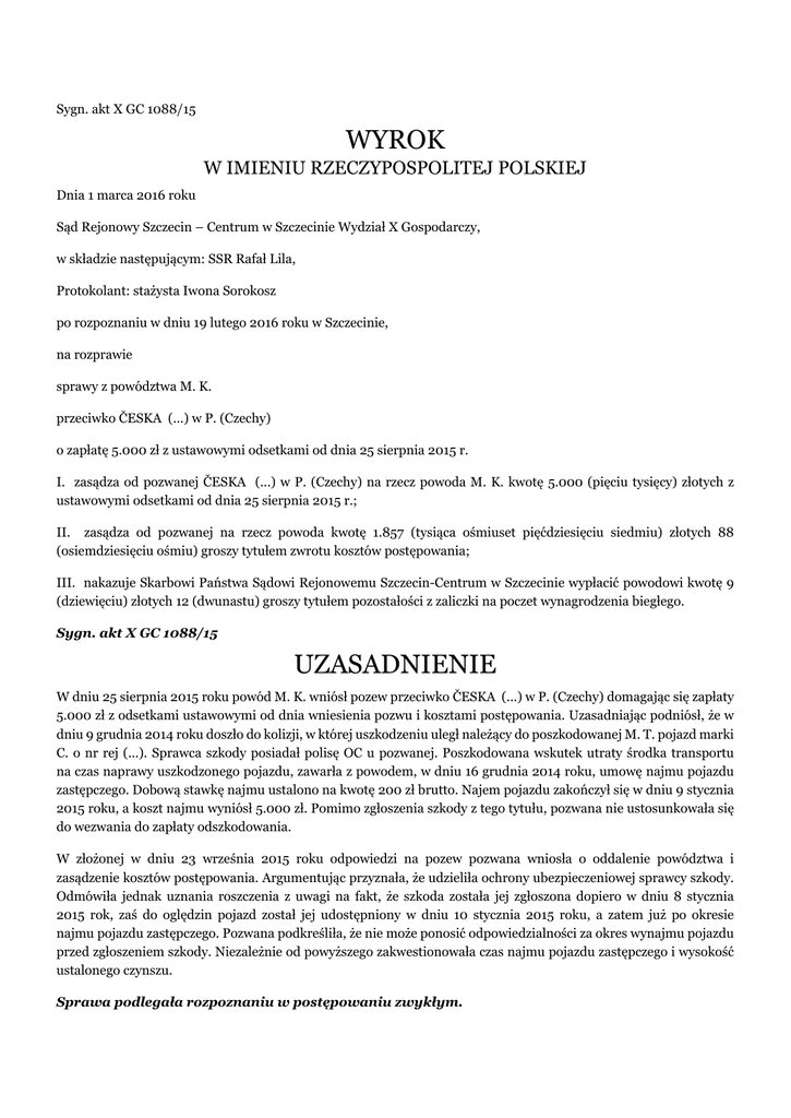 Sygn. akt X GC 1088/15 WYROK W IMIENIU RZECZYPOSPOLITEJ POLSKIEJ Dnia 1 marca 2016 roku Sąd Rejonowy Szczecin – Centrum w Szczecinie Wydział X Gospodarczy, w składzie następującym: SSR Rafał Lila, Protokolant: stażysta Iwona Sorokosz po rozpoznaniu w dniu 19 lutego 2016 roku w Szczecinie, na rozprawie sprawy z powództwa M. K. przeciwko ČESKA (...) w P. (Czechy) o zapłatę 5.000 zł z ustawowymi odsetkami od dnia 25 sierpnia 2015 r. I. zasądza od pozwanej ČESKA (...) w P. (Czechy) na rzecz powoda M. K. kwotę 5.000 (pięciu tysięcy) złotych z ustawowymi odsetkami od dnia 25 sierpnia 2015 r.; II. zasądza od pozwanej na rzecz powoda kwotę 1.857 (tysiąca ośmiuset pięćdziesięciu siedmiu) złotych 88 (osiemdziesięciu ośmiu) groszy tytułem zwrotu kosztów postępowania; III. nakazuje Skarbowi Państwa Sądowi Rejonowemu Szczecin-Centrum w Szczecinie wypłacić powodowi kwotę 9 (dziewięciu) złotych 12 (dwunastu) groszy tytułem pozostałości z zaliczki na poczet wynagrodzenia biegłego. Sygn. akt X GC 1088/15 UZASADNIENIE W dniu 25 sierpnia 2015 roku powód M. K. wniósł pozew przeciwko ČESKA (...) w P. (Czechy) domagając się zapłaty 5.000 zł z odsetkami ustawowymi od dnia wniesienia pozwu i kosztami postępowania. Uzasadniając podniósł, że w dniu 9 grudnia 2014 roku doszło do kolizji, w której uszkodzeniu uległ należący do poszkodowanej M. T. pojazd marki C. o nr rej (...). Sprawca szkody posiadał polisę OC u pozwanej. Poszkodowana wskutek utraty środka transportu na czas naprawy uszkodzonego pojazdu, zawarła z powodem, w dniu 16 grudnia 2014 roku, umowę najmu pojazdu zastępczego. Dobową stawkę najmu ustalono na kwotę 200 zł brutto. Najem pojazdu zakończył się w dniu 9 stycznia 2015 roku, a koszt najmu wyniósł 5.000 zł. Pomimo zgłoszenia szkody z tego tytułu, pozwana nie ustosunkowała się do wezwania do zapłaty odszkodowania. W złożonej w dniu 23 września 2015 roku odpowiedzi na pozew pozwana wniosła o oddalenie powództwa i zasądzenie kosztów postępowania. Argumentując przyznała, że udzieliła ochrony ubezpieczeniowej sprawcy szkody. Odmówiła jednak uznania roszczenia z uwagi na fakt, że szkoda została jej zgłoszona dopiero w dniu 8 stycznia 2015 rok, zaś do oględzin pojazd został jej udostępniony w dniu 10 stycznia 2015 roku, a zatem już po okresie najmu pojazdu zastępczego. Pozwana podkreśliła, że nie może ponosić odpowiedzialności za okres wynajmu pojazdu przed zgłoszeniem szkody. Niezależnie od powyższego zakwestionowała czas najmu pojazdu zastępczego i wysokość ustalonego czynszu. Sprawa podlegała rozpoznaniu w postępowaniu zwykłym. Sąd ustalił następujący stan faktyczny. W dniu 9 grudnia 2014 roku doszło do kolizji w wyniku której uszkodzeniu uległ pojazd marki C. o nr rej. (...), należący do poszkodowanej M. T.. Sprawca kolizji legitymował się umową ubezpieczenia zawartą z pozwaną. bezsporne, a nadto dowód: • dokumenty stanowiące akta szkody – płyta CD k. 25, • dowód rejestracyjny, k. 40-41 • karta pojazdu, k. 42 • zeznania świadka M. T., k. 34-35, Poszkodowana niezwłocznie po zdarzeniu zgłosiła szkodę ubezpieczycielowi z tytułu zawartej umowy autocasco (AC) i wówczas otrzymała pojazd zastępczy. Po około tygodniu ubezpieczyciel poszkodowanej nakazał zwrot wydanego wcześniej pojazdu zastępczego i polecił, żeby szkodę zgłosić do ubezpieczyciela sprawcy – pozwanej – wstępującej na rynku pod firmą (...). Poszkodowana zwróciła się do powoda M. K., którego zidentyfikowała po oznaczeniu firmy, jako przedstawiciela ubezpieczyciela sprawcy szkody (P.) – w celu wynajęcia pojazdu zastępczego. dowód: • zeznania świadka M. T., k. 34-35, W dniu 16 grudnia 2014 roku poszkodowana zawarła z powodem umowę najmu pojazdu zastępczego marki F. (...) o nr rej. (...). Dobową stawkę najmu ustalono na kwotę 200 zł brutto. Pojazd zastępczy był pozwanej niezbędny dla realizacji celów prowadzonej działalności gospodarczej. Tego samego dnia poszkodowana upoważniła powoda do odbioru należnego jej odszkodowania tytułem zwrotu kosztów najmu pojazdu zastępczego. dowód: • umowa najmu pojazdu zastępczego, k. 7v, • protokół wydania pojazdu, k. 8, • oświadczenie, k. 9v, • upoważnienie, k. 10 • zeznania świadka M. T., k. 34-35. W dniu 9 stycznia 2015 roku powód poinformował poszkodowaną o konieczności zwrotu pojazdu zastępczego oraz wyjaśnił, że dalsze korzystanie z pojazdu jest możliwe wyłącznie w przypadku, kiedy koszt najmu pojazdu zastępczego zostanie pokryty bezpośrednio przez poszkodowaną. Tego samego dnia poszkodowana zwróciła pojazd zastępczy. Po 9 stycznia 2015 roku pozwana nie wynajęła innego pojazdu zastępczego. Korzystała z komunikacji miejskiej, taksówek i grzecznościowego udostepnienia auta przez rodzinę. W gospodarstwie domowym M. T. w okresie szkody nie było innego sprawnego pojazdu. Znajdujący się w jej posiadaniu samochód kolekcjonerski M. (auto ponad 30 letnie) z przyczyn technicznych pozostawał unieruchomiony. dowód: • protokół zdawczy, k. 8v, • zeznania świadka M. T., k. 34-35. W dniu 8 stycznia 2015 roku poszkodowana zgłosiła pozwanej fakt wystąpienia szkody, spowodowanej zdarzeniem z dnia 9 grudnia 2014 roku. Pierwsze oględziny pojazdu zostały przeprowadzone w dniu 9 stycznia 2015 roku, a następne w dniach 11 oraz 18 lutego 2015 roku. Naprawa samochodu zakończyła się w dniu 27 lutego 2015 roku. dowód: • zgłoszenie szkody, k. 24, kalkulacje napraw opracowane po oględzinach uszkodzonego samochodu stanowiące elektroniczne akta szkody – płyta CD k. 25. W dniu 9 stycznia 2015 roku poszkodowana zawarła z powodem umowę cesji wierzytelności przysługującej jej wobec pozwanej tytułem kosztów wynajmu pojazdu zastępczego. dowód: • umowa cesji wierzytelności, k. 10v W dniu 20 stycznia 2015 roku powód wystawił poszkodowanej fakturę VAT na kwotę 