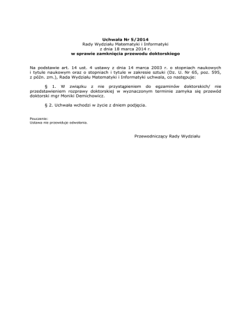 Uchwała Nr 5/2014 Rady Wydziału Matematyki i Informatyki z dnia 18 marca 2014 r. w sprawie zamknięcia przewodu doktorskiego Na podstawie art. 14 ust. 4 ustawy z dnia 14 marca 2003 r. o stopniach naukowych i tytule naukowym oraz o stopniach i tytule w zakresie sztuki (Dz. U. Nr 65, poz. 595, z późn. zm.), Rada Wydziału Matematyki i Informatyki uchwala, co następuje: § 1. W związku z nie przystąpieniem do egzaminów doktorskich/ nie przedstawieniem rozprawy doktorskiej w wyznaczonym terminie zamyka się przewód doktorski mgr Moniki Demichowicz. § 2. Uchwała wchodzi w życie z dniem podjęcia. Pouczenie: Ustawa nie przewiduje odwołania. Przewodniczący Rady Wydziału