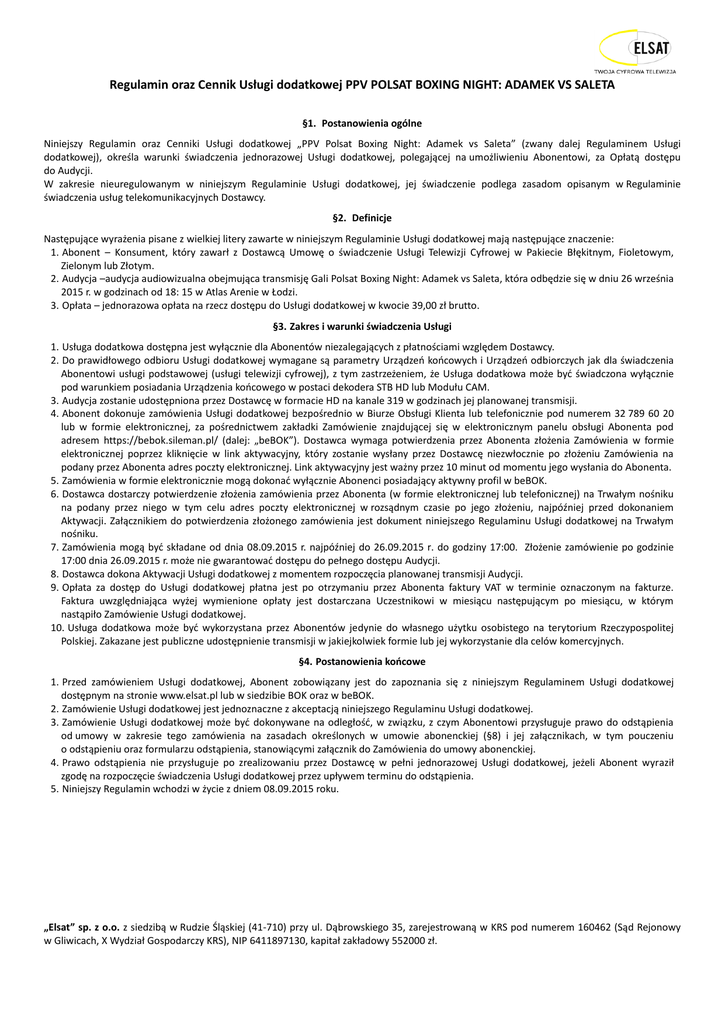 Regulamin oraz Cennik Usługi dodatkowej PPV POLSAT BOXING NIGHT: ADAMEK VS SALETA §1. Postanowienia ogólne Niniejszy Regulamin oraz Cenniki Usługi dodatkowej „PPV Polsat Boxing Night: Adamek vs Saleta” (zwany dalej Regulaminem Usługi dodatkowej), określa warunki świadczenia jednorazowej Usługi dodatkowej, polegającej na umożliwieniu Abonentowi, za Opłatą dostępu do Audycji. W zakresie nieuregulowanym w niniejszym Regulaminie Usługi dodatkowej, jej świadczenie podlega zasadom opisanym w Regulaminie świadczenia usług telekomunikacyjnych Dostawcy. §2. Definicje Następujące wyrażenia pisane z wielkiej litery zawarte w niniejszym Regulaminie Usługi dodatkowej mają następujące znaczenie: 1. Abonent – Konsument, który zawarł z Dostawcą Umowę o świadczenie Usługi Telewizji Cyfrowej w Pakiecie Błękitnym, Fioletowym, Zielonym lub Złotym. 2. Audycja –audycja audiowizualna obejmująca transmisję Gali Polsat Boxing Night: Adamek vs Saleta, która odbędzie się w dniu 26 września 2015 r. w godzinach od 18: 15 w Atlas Arenie w Łodzi. 3. Opłata – jednorazowa opłata na rzecz dostępu do Usługi dodatkowej w kwocie 39,00 zł brutto. §3. Zakres i warunki świadczenia Usługi 1. Usługa dodatkowa dostępna jest wyłącznie dla Abonentów niezalegających z płatnościami względem Dostawcy. 2. Do prawidłowego odbioru Usługi dodatkowej wymagane są parametry Urządzeń końcowych i Urządzeń odbiorczych jak dla świadczenia Abonentowi usługi podstawowej (usługi telewizji cyfrowej), z tym zastrzeżeniem, że Usługa dodatkowa może być świadczona wyłącznie pod warunkiem posiadania Urządzenia końcowego w postaci dekodera STB HD lub Modułu CAM. 3. Audycja zostanie udostępniona przez Dostawcę w formacie HD na kanale 319 w godzinach jej planowanej transmisji. 4. Abonent dokonuje zamówienia Usługi dodatkowej bezpośrednio w Biurze Obsługi Klienta lub telefonicznie pod numerem 32 789 60 20 lub w formie elektronicznej, za pośrednictwem zakładki Zamówienie znajdującej się w elektronicznym panelu obsługi Abonenta pod adresem https://bebok.sileman.pl/ (dalej: „beBOK”). Dostawca wymaga potwierdzenia przez Abonenta złożenia Zamówienia w formie elektronicznej poprzez kliknięcie w link aktywacyjny, który zostanie wysłany przez Dostawcę niezwłocznie po złożeniu Zamówienia na podany przez Abonenta adres poczty elektronicznej. Link aktywacyjny jest ważny przez 10 minut od momentu jego wysłania do Abonenta. 5. Zamówienia w formie elektronicznie mogą dokonać wyłącznie Abonenci posiadający aktywny profil w beBOK. 6. Dostawca dostarczy potwierdzenie złożenia zamówienia przez Abonenta (w formie elektronicznej lub telefonicznej) na Trwałym nośniku na podany przez niego w tym celu adres poczty elektronicznej w rozsądnym czasie po jego złożeniu, najpóźniej przed dokonaniem Aktywacji. Załącznikiem do potwierdzenia złożonego zamówienia jest dokument niniejszego Regulaminu Usługi dodatkowej na Trwałym nośniku. 7. Zamówienia mogą być składane od dnia 08.09.2015 r. najpóźniej do 26.09.2015 r. do godziny 17:00. Złożenie zamówienie po godzinie 17:00 dnia 26.09.2015 r. może nie gwarantować dostępu do pełnego dostępu Audycji. 8. Dostawca dokona Aktywacji Usługi dodatkowej z momentem rozpoczęcia planowanej transmisji Audycji. 9. Opłata za dostęp do Usługi dodatkowej płatna jest po otrzymaniu przez Abonenta faktury VAT w terminie oznaczonym na fakturze. Faktura uwzględniająca wyżej wymienione opłaty jest dostarczana Uczestnikowi w miesiącu następującym po miesiącu, w którym nastąpiło Zamówienie Usługi dodatkowej. 10. Usługa dodatkowa może być wykorzystana przez Abonentów jedynie do własnego użytku osobistego na terytorium Rzeczypospolitej Polskiej. Zakazane jest publiczne udostępnienie transmisji w jakiejkolwiek formie lub jej wykorzystanie dla celów komercyjnych. §4. Postanowienia końcowe 1. Przed zamówieniem Usługi dodatkowej, Abonent zobowiązany jest do zapoznania się z niniejszym Regulaminem Usługi dodatkowej dostępnym na stronie www.elsat.pl lub w siedzibie BOK oraz w beBOK. 2. Zamówienie Usługi dodatkowej jest jednoznaczne z akceptacją niniejszego Regulaminu Usługi dodatkowej. 3. Zamówienie Usługi dodatkowej może być dokonywane na odległość, w związku, z czym Abonentowi przysługuje prawo do odstąpienia od umowy w zakresie tego zamówienia na zasadach określonych w umowie abonenckiej (§8) i jej załącznikach, w tym pouczeniu o odstąpieniu oraz formularzu odstąpienia, stanowiącymi załącznik do Zamówienia do umowy abonenckiej. 4. Prawo odstąpienia nie przysługuje po zrealizowaniu przez Dostawcę w pełni jednorazowej Usługi dodatkowej, jeżeli Abonent wyraził zgodę na rozpoczęcie świadczenia Usługi dodatkowej przez upływem terminu do odstąpienia. 5. Niniejszy Regulamin wchodzi w życie z dniem 08.09.2015 roku. „Elsat” sp. z o.o. z siedzibą w Rudzie Śląskiej (41-710) przy ul. Dąbrowskiego 35, zarejestrowaną w KRS pod numerem 160462 (Sąd Rejonowy w Gliwicach, X Wydział Gospodarczy KRS), NIP 6411897130, kapitał zakładowy 552000 zł.