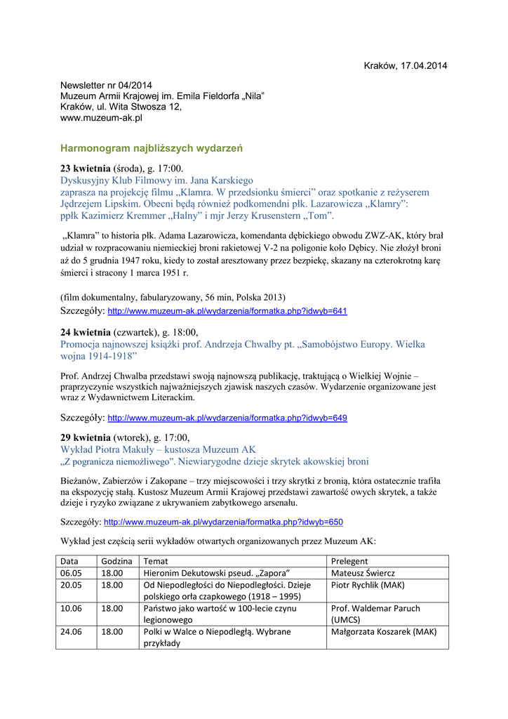 Kraków, 17.04.2014 Newsletter nr 04/2014 Muzeum Armii Krajowej im. Emila Fieldorfa „Nila” Kraków, ul. Wita Stwosza 12, www.muzeum-ak.pl Harmonogram najbliższych wydarzeń 23 kwietnia (środa), g. 17:00. Dyskusyjny Klub Filmowy im. Jana Karskiego zaprasza na projekcję filmu „Klamra. W przedsionku śmierci” oraz spotkanie z reżyserem Jędrzejem Lipskim. Obecni będą również podkomendni płk. Lazarowicza „Klamry”: ppłk Kazimierz Kremmer „Halny” i mjr Jerzy Krusenstern „Tom”. „Klamra” to historia płk. Adama Lazarowicza, komendanta dębickiego obwodu ZWZ-AK, który brał udział w rozpracowaniu niemieckiej broni rakietowej V-2 na poligonie koło Dębicy. Nie złożył broni aż do 5 grudnia 1947 roku, kiedy to został aresztowany przez bezpiekę, skazany na czterokrotną karę śmierci i stracony 1 marca 1951 r. (film dokumentalny, fabularyzowany, 56 min, Polska 2013) Szczegóły: http://www.muzeum-ak.pl/wydarzenia/formatka.php?idwyb=641 24 kwietnia (czwartek), g. 18:00, Promocja najnowszej książki prof. Andrzeja Chwalby pt. „Samobójstwo Europy. Wielka wojna 1914-1918” Prof. Andrzej Chwalba przedstawi swoją najnowszą publikację, traktującą o Wielkiej Wojnie – praprzyczynie wszystkich najważniejszych zjawisk naszych czasów. Wydarzenie organizowane jest wraz z Wydawnictwem Literackim. Szczegóły: http://www.muzeum-ak.pl/wydarzenia/formatka.php?idwyb=649 29 kwietnia (wtorek), g. 17:00, Wykład Piotra Makuły – kustosza Muzeum AK „Z pogranicza niemożliwego”. Niewiarygodne dzieje skrytek akowskiej broni Bieżanów, Zabierzów i Zakopane – trzy miejscowości i trzy skrytki z bronią, która ostatecznie trafiła na ekspozycję stałą. Kustosz Muzeum Armii Krajowej przedstawi zawartość owych skrytek, a także dzieje i ryzyko związane z ukrywaniem zabytkowego arsenału. Szczegóły: http://www.muzeum-ak.pl/wydarzenia/formatka.php?idwyb=650 Wykład jest częścią serii wykładów otwartych organizowanych przez Muzeum AK: Data 06.05 20.05 Godzina 18.00 18.00 10.06 18.00 24.06 18.00 Temat Hieronim Dekutowski pseud. „Zapora” Od Niepodległości do Niepodległości. Dzieje polskiego orła czapkowego (1918 – 1995) Państwo jako wartość w 100-lecie czynu legionowego Polki w Walce o Niepodległą. Wybrane przykłady Prelegent Mateusz Świercz Piotr Rychlik (MAK) Prof. Waldemar Paruch (UMCS) Małgorzata Koszarek (MAK) Wydarzenia w Muzeum Armii Krajowej Znów najlepsze !!! Po raz kolejny Muzeum Armii Krajowej zwyciężyło w plebiscycie na najlepsze krakowskie muzeum. Czytelnicy portalu Naszemiasto.pl wybierali spośród 55 propozycji. Muzeum Armii Krajowej zyskało największe uznanie, otrzymując 6837 głosów. Wyniki głosowania: http://krakow.naszemiasto.pl/plebiscyt/wybieramy-najlepsze-muzeum-wkrakowie-glosowanie,1469,t,id.html Muzeum Armii Krajowej w Krakowie Ekspozycję stałą oraz wystawy czasowe w Muzeum AK można zwiedzać od wtorku do niedzieli w godzinach 11:00 – 18:00, w niedziele – wstęp wolny. W okresie świątecznym muzeum nieczynne od 19 kwietnia (sobota) do 21 kwietnia (poniedziałek). Muzeum Armii Krajowej w Krakowie im. Generała Emila Fieldorfa „Nila” ul. Wita Stwosza 12, 31-511 Kraków, e-mail: [email protected] Zdrowych, pogodnych i rodzinnych Świąt Zmartwychwstania Pańskiego życzy dyrekcja i pracownicy Muzeum Armii Krajowej