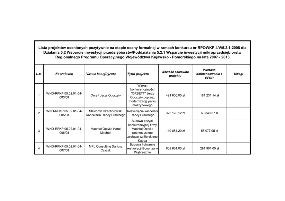 Lista projektów ocenionych pozytywnie na etapie oceny formalnej w ramach konkursu nr RPOWKP 4/V/5.2.1-2008 dla Działania 5.2 Wsparcie inwestycji przedsiębiorstw/Poddziałania 5.2.1 Wsparcie inwestycji mikroprzedsiębiorstw Regionalnego Programu Operacyjnego Województwa Kujawsko - Pomorskiego na lata 2007 - 2013 L.p. Nr wniosku 1 WND-RPKP.05.02.01-04003/08 2 WND-RPKP.05.02.01-04005/08 Nazwa beneficjenta Orsett Jerzy Ogorzały Tytuł projektu Wzrost konkurencyjności "ORSETT" Jerzy Ogorzały poprzez modernizację parku maszynowego Sławomir Czachorowski Rozwinięcie kancelarii Kancelaria Radcy Prawnego Radcy Prawnego 3 WND-RPKP.05.02.01-04006/08 Machtel Optyka Karol Machtel 4 WND-RPKP.05.02.01-04007/08 MPL Consulting Dariusz CzyŜak Budowa pozycji konkurencyjnej firmy Machtel Optyka poprzez zakup zestawu szlifierskiego Kappa Budowa i otwarcie restauracji Bonanza w Wąbrzeźnie Wartość całkowita projektu Wartość dofinansowania z EFRR 421 600,00 zł 181 231,14 zł 323 178,12 zł 63 340,37 zł 119 084,20 zł 58 077,95 zł 609 634,00 zł 291 901,05 zł Uwagi 5 6 7 8 9 WND-RPKP.05.02.01-04009/08 zakup nowych "Watergaz" Zakład Instalacji środków trwałych Przemysłowych i Konstrukcji celem uruchomienia nowych usług Metalowych Górnikiewicz Michał ogólnobudowlanych w firmie WATERGAZ 287 780,00 zł 139 051,50 zł WND-RPKP.05.02.01-04011/08 PPHU "EVENTUS" Arkadiusz Kalinski Zakup urządzeń w celu unowoczesnienia i wprowadzenia nowych usług budowlanych 610 000,00 zł 255 000,00 zł Marian Kalinski Zakup urządzeń w celu unowocześ nienia i wprowadzenia nowych usług wodnokanalizacyjnych 610 000,00 zł 255 000,00 zł Prywatny Gainet Stoamtologiczny "AMODENT" lek. stom. Anna Maria Oleksiejuk Zakup specjalistycznego wyposaŜenia dla Gabinetu Stomatologicznego AMO-DENT w Toruniu 100 700,00 zł 51 357,00 zł PPHU GFT Inteligentny dom firmy GFT - oszczędne, bezpieczne, komfortowe i nowoczesne rozwiązania dla obiekrtów uŜytkowych 441 765,01 zł 246 926,78 zł WND-RPKP.05.02.01-04012/08 WND-RPKP.05.02.01-04013/08 WND-RPKP.05.02.01-04017/08 10 WND-RPKP.05.02.01-04019/08 STODREWEK SC Włodzimierz Polit, Marek Polit 11 WND-RPKP.05.02.01-04020/08 Auto-BŁYSK Myjnia Samochodowa Karolina Bączek 12 13 WND-RPKP.05.02.01-04021/08 WND-RPKP.05.02.01-04022/08 Wzrost konkurencyjności firmy STODREWEK S.C. poprzez inwestycję w gospodarkę magazynową Wzrost konkurencyjności przedsiębiorstwa poprzez zakup myjni automatycznej 280 600,00 zł 97 750,00 zł 153 720,00 zł 74 970,00 zł Wprowadzenie nowych i udoskonalonych usług do oferty CARTUR S.C. dzięki zakupowi dowaŜarki, testera i innych urządzeń. 267 180,00 zł 111 180,00 zł Poprzez inwestycje w specjalistyczny sprzęt do podniesienia Gabinet Stomatologiczny konkurencyjności i Anna Małgorzata Miszewska innowacyjności świadczonych usług stomatologicznych na bydgoskim rynku. 178 099,91 zł 101 323,40 zł CARTUR SC Jarosław Piechowski, Piotr Mulle 14 15 WND-RPKP.05.02.01-04023/08 WND-RPKP.05.02.01-04024/08 16 WND-RPKP.05.02.01-04025/08 17 WND-RPKP.05.02.01-04026/08 Podniesienie konkurencyjności gabinetu stomatologicznego GraŜyna Matczak poprzez inwestycje w nowoczeny sprzęt medyczny i zwiększenie zatrudnienia 209 000,00 zł 120 802,00 zł Poprzez innowacyjne rozwiązania w rehabilitacji do wzrostu Sielski Łukasz Piotr Centrum konkurencyjności i Rehabilitacji Funkcjonalnej atrakcyjności usług Centrum Rehabilitacji Funkcjonalnej na regionalnym rynku. 149 000,00 zł 84 855,50 zł 216 550,00 zł 90 015,00 zł 184 220,00 zł 89 845,00 zł Gabinet Stomatologiczny GraŜyna Matczak Unowoczesnienie oferty zakładu produkcyjnego firmy TECHMET w Lisim PPHU TECHMET Daniel Ogonie poprzez Łukaszczyk zakup maszyn, urządzeń technologicznych i oprogramowania. Poprawa konkurencyjności przedsiębiorstwa "Prace Ziemne Prace ziemne Zieliński Józef Zieliński Józef" poprzez zakup koparko-ładowarki. 18 19 WND-RPKP.05.02.01-04031/08 WND-RPKP.05.02.01-04032/08 PHU "HORT-WALD" Uruchomienie ekologicznej pralni chemicznej przez firmę PHU "HORTWALD" w Nakle nad Notecią 216 550,00 zł 105 612,50 zł MAX SYSTEM Wojciech Siarnik Uruchomienie pierwszej w województwie kujawsko-pomorskim produkcji blachodachówki o wysokim profilu 34 mm przez firmę MAX SYSTEM w Frydrychowie poprzez zakup nowoczesnej lini produkcyjnej. 606 340,00 zł 257 694,50 zł 610 000,00 zł 206 550,00 zł 20 WND-RPKP.05.02.01-04033/08 Megadyne CE Janusz Rak Rozwój i unowocześnienie firmy "Megadyne CE" z Bydgoszczy, poprzez uruchomienie produkcji małych pasowych kół zębatych 21 WND-RPKP.05.02.01-04034/08 Euromeble Jarosław Urbański Budowa hali montaŜowej szansą na rozwój firmy Euromeble 608 934,94 zł 203 522,72 zł 22 WND-RPKP.05.02.01-04039/08 Prywatny Gabinet Lekarski Urszula Dąbek Swiadczenie nowych usług medycznych poprzez inwestycje 494 210,00 zł 231 043,18 zł 23 WND-RPKP.05.02.01-04040/08 24 WND-RPKP.05.02.01-04041/08 25 WND-RPKP.05.02.01-04043/08 Uruchomienie w Grudziądzu biura Biuro Geodezji Waldemar T. terenowego firmy Czarnecki Biuro Geodezji Waldemar T. Czarnecki Zakup uŜywanej koparki kołowej do Zakład usług rolniczych świadczenia usług w Zbigniew Nogalski zakresie prac ziemnych i budowlanych 303 292,00 zł 130 067,00 zł 207 400,00 zł 72 250,00 zł "Kuźnia" OberŜa Polska Jolanta Grodzicka Rozbudowa restauracji "Kuźnia" o salę tanecznobankietową i zaplecze wraz z wyposaŜeniem i sprzętem gastro 607 560,00 zł 296 310,00 zł Gondek Gondek Zbigniew Profesjonalna technika estradowa w Agencji Koncertowej Gondek w Bydgoszczy 610 000,00 zł 297 500,00 zł 611 220,00 zł 297 500,00 zł 610 000,00 zł 269 650,00 zł 26 WND-RPKP.05.02.01-04050/08 27 WND-RPKP.05.02.01-04051/08 Gondek Gondek Zbigniew PotęŜna moc dźwięku najwyŜszej jakości Agencji koncertowej Gondek Bydgoszcz 28 WND-RPKP.05.02.01-04052/08 "Anemon" Anna Łoś Rozbudowa farmy wiatrowej w miejscowości Zosin 29 WND-RPKP.05.02.01-04056/08 Transkop Drozdrowski Grzegorz 30 WND-RPKP.0