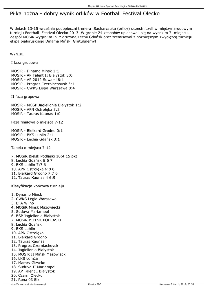 Miejski Ośrodek Sportu i Rekreacji w Bielsku Podlaskim Piłka nożna - dobry wynik orlików w Football Festival Olecko W dniach 13-15 września podopieczni trenera Sacharczuka (orlicy) uczestniczyli w międzynarodowym turnieju Football Festival Olecko 2013. W gronie 24 zespołów uplasowali się na wysokim 7 miejscu. Zespół MOSiR wygrał m.in. z drużyną Lechii Gdańsk oraz zremisował z późniejszym zwycięzcą turnieju ekipą białoruskiego Dinama Mińsk. Gratulujemy! WYNIKI I faza grupowa MOSiR MOSiR MOSiR MOSiR MOSiR - Dinamo Mińsk 1:1 AP Talent II Białystok 5:0 AP 2012 Suwałki 8:1 Progres Czerniachovsk 3:1 CWKS Legia Warszawa 0:4 II faza grupowa MOSiR - MOSP Jagiellonia Białystok 1:2 MOSiR - APN Ostrołęka 3:2 MOSiR - Tauras Kaunas 1:0 Faza finałowa o miejsca 7-12 MOSiR - Biełkard Grodno 0:1 MOSiR - BKS Lublin 2:1 MOSiR - Lechia Gdańsk 3:1 Tabela o miejsca 7-12 7. MOSiR Bielsk Podlaski 10:4 15 pkt 8. Lechia Gdańsk 6:6 7 9. BKS Lublin 7:7 6 10. APN Ostrołęka 6:8 6 11. Biełkard Grodno 7:7 6 12. Tauras Kaunas 4 6:9 Klasyfikacja końcowa turnieju 1. Dynamo Mińsk 2. CWKS Legia Warszawa 3. BFA Wilno 4. MOSiR Mińsk Mazowiecki 5. Suduva Mariampol 6. BSP Jagiellonia Białystok 7. MOSiR BIELSK PODLASKI 8. Lechia Gdańsk 9. BKS Lublin 10. APN Ostrołęka 11. Biełkard Grodno 12. Tauras Kaunas 13. Progres Czerniachovsk 14. Jagiellonia Białystok 15. MOSiR II Mińsk Mazowiecki 16. ŁKS Łomża 17. Mamry Gizycko 18. Suduva II Mariampol 19. AP Talent I Białystok 20. Czarni Olecko 21. Rona 03 Ełk http://www.mosirbielsk.nazwa.pl Kreator PDF Utworzono 6 March, 2017, 23:53 Miejski Ośrodek Sportu i Rekreacji w Bielsku Podlaskim 22. AP Talent 04 Białystok 23. AP 2012 Suwałki 24. AP Talent II Białystok Więcej o turnieju z poniższym załączniku. http://www.mosirbielsk.nazwa.pl Kreator PDF Utworzono 6 March, 2017, 23:53