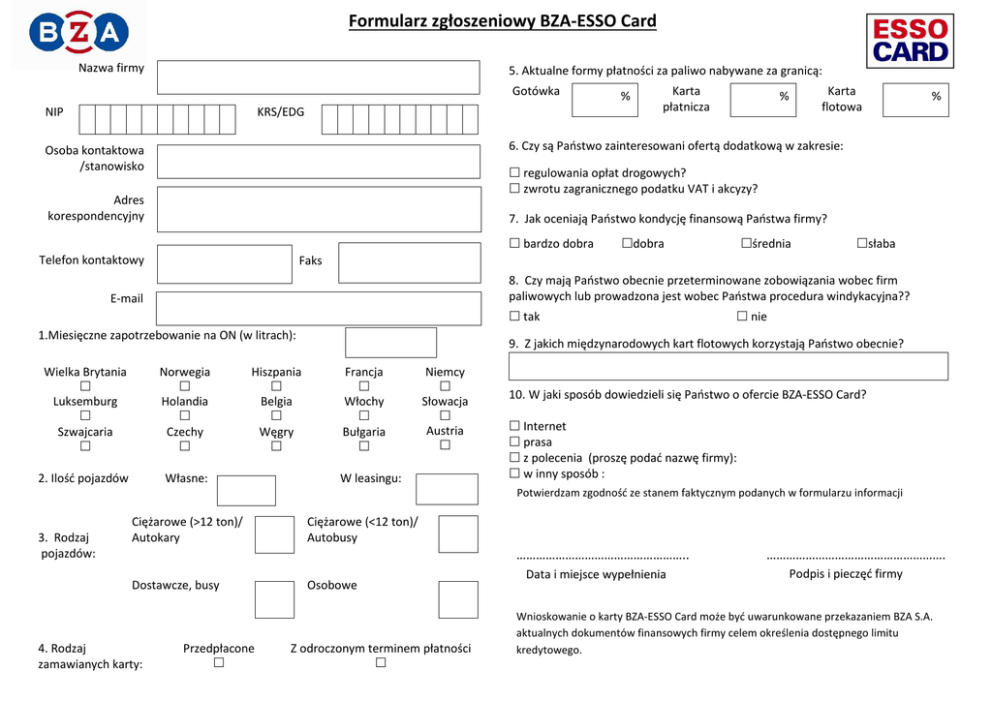 Formularz zgłoszeniowy BZA-ESSO Card Nazwa firmy 5. Aktualne formy płatności za paliwo nabywane za granicą: Gotówka NIP KRS/EDG % Karta płatnicza Karta flotowa % % 6. Czy są Państwo zainteresowani ofertą dodatkową w zakresie: Osoba kontaktowa /stanowisko regulowania opłat drogowych? zwrotu zagranicznego podatku VAT i akcyzy? Adres korespondencyjny 7. Jak oceniają Państwo kondycję finansową Państwa firmy? bardzo dobra Telefon kontaktowy dobra średnia słaba Faks 8. Czy mają Państwo obecnie przeterminowane zobowiązania wobec firm paliwowych lub prowadzona jest wobec Państwa procedura windykacyjna?? E-mail tak 1.Miesięczne zapotrzebowanie na ON (w litrach): nie 9. Z jakich międzynarodowych kart flotowych korzystają Państwo obecnie? Wielka Brytania Norwegia Hiszpania Francja Niemcy Luksemburg Holandia Belgia Włochy Słowacja Szwajcaria Czechy Węgry Bułgaria Austria 2. Ilość pojazdów Własne: W leasingu: 10. W jaki sposób dowiedzieli się Państwo o ofercie BZA-ESSO Card? Internet prasa z polecenia (proszę podać nazwę firmy): w inny sposób : Potwierdzam zgodność ze stanem faktycznym podanych w formularzu informacji 3. Rodzaj pojazdów: Ciężarowe (>12 ton)/ Autokary Ciężarowe (<12 ton)/ Autobusy …………………………………………….. Dostawcze, busy 4. Rodzaj zamawianych karty: Przedpłacone Osobowe Z odroczonym terminem płatności Data i miejsce wypełnienia ………………………………………………. Podpis i pieczęć firmy Wnioskowanie o karty BZA-ESSO Card może być uwarunkowane przekazaniem BZA S.A. aktualnych dokumentów finansowych firmy celem określenia dostępnego limitu kredytowego.