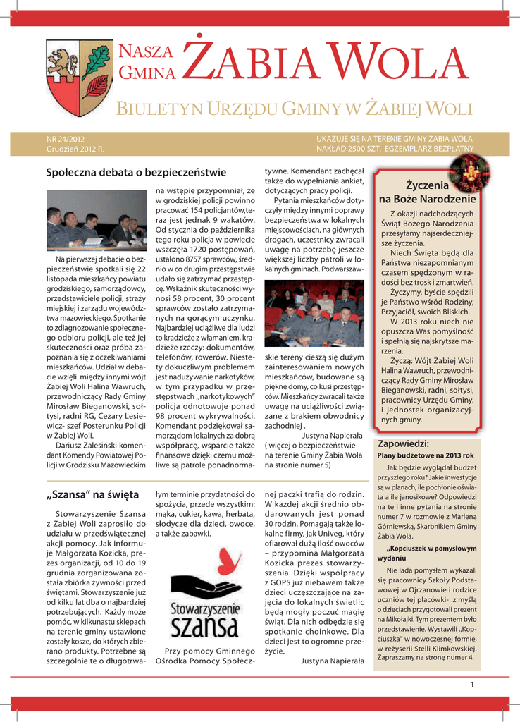 NASZA GMINA ŻABIA WOLA BIULETYN URZĘDU GMINY W ŻABIEJ WOLI UKAZUJE SIĘ NA TERENIE GMINY ŻABIA WOLA NAKŁAD 2500 SZT. EGZEMPLARZ BEZPŁATNY PŁATNY NR 24/2012 Grudzień 2012 R. Społeczna debata o bezpieczeństwie Na pierwszej debacie o bezpieczeństwie spotkali się 22 listopada mieszkańcy powiatu grodziskiego, samorządowcy, przedstawiciele policji, straży miejskiej i zarządu województwa mazowieckiego. Spotkanie to zdiagnozowanie społecznego odbioru policji, ale też jej skuteczności oraz próba zapoznania się z oczekiwaniami mieszkańców. Udział w debacie wzięli między innymi wójt Żabiej Woli Halina Wawruch, przewodniczący Rady Gminy Mirosław Bieganowski, sołtysi, radni RG, Cezary Lesiewicz- szef Posterunku Policji w Żabiej Woli. Dariusz Zalesiński komendant Komendy Powiatowej Policji w Grodzisku Mazowieckim ,,Szansa” na święta Stowarzyszenie Szansa z Żabiej Woli zaprosiło do udziału w przedświątecznej akcji pomocy. Jak informuje Małgorzata Kozicka, prezes organizacji, od 10 do 19 grudnia zorganizowana została zbiórka żywności przed świętami. Stowarzyszenie już od kilku lat dba o najbardziej potrzebujących. Każdy może pomóc, w kilkunastu sklepach na terenie gminy ustawione zostały kosze, do których zbierano produkty. Potrzebne są szczególnie te o długotrwa- na wstępie przypomniał, że w grodziskiej policji powinno pracować 154 policjantów,teraz jest jednak 9 wakatów. Od stycznia do października tego roku policja w powiecie wszczęła 1720 postępowań, ustalono 8757 sprawców, średnio w co drugim przestępstwie udało się zatrzymać przestępcę. Wskaźnik skuteczności wynosi 58 procent, 30 procent sprawców zostało zatrzymanych na gorącym uczynku. Najbardziej uciążliwe dla ludzi to kradzieże z włamaniem, kradzieże rzeczy: dokumentów, telefonów, rowerów. Niestety dokuczliwym problemem jest nadużywanie narkotyków, w tym przypadku w przestępstwach ,,narkotykowych” policja odnotowuje ponad 98 procent wykrywalności. Komendant podziękował samorządom lokalnych za dobrą współpracę, wsparcie także finansowe dzięki czemu możliwe są patrole ponadnorma- łym terminie przydatności do spożycia, przede wszystkim: mąka, cukier, kawa, herbata, słodycze dla dzieci, owoce, a także zabawki. Przy pomocy Gminnego Ośrodka Pomocy Społecz- tywne. Komendant zachęcał także do wypełniania ankiet, dotyczących pracy policji. Pytania mieszkańców dotyczyły między innymi poprawy bezpieczeństwa w lokalnych miejscowościach, na głównych drogach, uczestnicy zwracali uwagę na potrzebę jeszcze większej liczby patroli w lokalnych gminach. Podwarszaw- skie tereny cieszą się dużym zainteresowaniem nowych mieszkańców, budowane są piękne domy, co kusi przestępców. Mieszkańcy zwracali także uwagę na uciążliwości związane z brakiem obwodnicy zachodniej . Justyna Napierała ( więcej o bezpieczeństwie na terenie Gminy Żabia Wola na stronie numer 5) nej paczki trafią do rodzin. W każdej akcji średnio obdarowanych jest ponad 30 rodzin. Pomagają także lokalne firmy, jak Univeg, który ofiarował dużą ilość owoców – przypomina Małgorzata Kozicka prezes stowarzyszenia. Dzięki współpracy z GOPS już niebawem także dzieci uczęszczające na zajęcia do lokalnych świetlic będą mogły poczuć magię świąt. Dla nich odbędzie się spotkanie choinkowe. Dla dzieci jest to ogromne przeżycie. Justyna Napierała Życzenia a na Boże Narodzenie d i Z okazji nadchodzących Świąt Bożego Narodzenia przesyłamy najserdeczniejsze życzenia. Niech Święta będą dla Państwa niezapomnianym czasem spędzonym w radości bez trosk i zmartwień. Życzymy, byście spędzili je Państwo wśród Rodziny, Przyjaciół, swoich Bliskich. W 2013 roku niech nie opuszcza Was pomyślność i spełnią się najskrytsze marzenia. Życzą: Wójt Żabiej Woli Halina Wawruch, przewodniczący Rady Gminy Mirosław Bieganowski, radni, sołtysi, pracownicy Urzędu Gminy. i jednostek organizacyjnych gminy. Zapowiedzi: Plany budżetowe na 2013 rok Jak będzie wyglądał budżet przyszłego roku? Jakie inwestycje są w planach, ile pochłonie oświata a ile janosikowe? Odpowiedzi na te i inne pytania na stronie numer 7 w rozmowie z Marleną Górniewską, Skarbnikiem Gminy Żabia Wola. ,,Kopciuszek w pomysłowym wydaniu Nie lada pomysłem wykazali się pracownicy Szkoły Podstawowej w Ojrzanowie i rodzice uczniów tej placówki- z myślą o dzieciach przygotowali prezent na Mikołajki. Tym prezentem było przedstawienie. Wystawili ,,Kopciuszka” w nowoczesnej formie, w reżyserii Stelli Klimkowskiej. Zapraszamy na stronę numer 4. 1 Witam serdecznie mieszkańców naszej gminy i gości w tym przedświątecznym czasie. Dla samorządu grudzień to miesiąc zamykania budżetu, bilansowania roku i planów na przyszły-2013. Mijający był dla nas korzystny, zwłaszcza ostatnie miesiące, podpisaliśmy bowiem umowę na dofinansowanie projektu kanalizacji. Tyle lat zabiegaliśmy najpierw wspólnie z innymi gminami, później sami o te pieniądze. Ten projekt finansowo bardzo nas obciąży. Cieszymy się z jego realizacji, warto, by Wam drodzy mieszkańcy żyło się bardziej komfortowo. Cały czas staramy się korzystać z dodatkowych źródeł pozyskiwania funduszy, jak chociażby przez Lokalną Grupę Działania Ziemia Chełmońskiego. 60 lat parafii w Kuklówce Parafia pod wezwaniem Matki Boskiej Częstochowskiej w Kuklówce ma sześćdziesiąt lat. Wyjątkow y jubileusz parafii, do której należą także wierni z gminy Żabia Wola stał się okazją do świętowania. Gośćmi specjalnymi uroczystości byli: Kardynał Kazimierz Nycz Metropolita Warszawski oraz ksiądz prałat Eugeniusz Dziedzic proboszcz parafii pod wezwaniem Świętej Anny w Grodzisku Mazowieckim. Pomysł powołania parafii w Kuklówce jak czytamy na stronie internetowej parafii zrodził się wiosną 1950 roku, podczas Mszy Świętej odprawianej dla mieszkańców