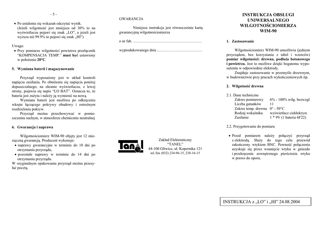 -5GWARANCJA • Po ustaleniu się wskazań odczytać wynik. (Jeżeli wilgotność jest mniejsza od 30% to na wyświetlaczu pojawi się znak „LO”, a jeżeli jest wyższa niż 99.9% to pojawi się znak „HI”) Uwaga: • Przy pomiarze wilgotności powietrza przełącznik “KOMPENSACJA TEMP.” musi być ustawiony w położeniu 20°C. Niniejsza instrukcja jest równocześnie kartą gwarancyjną wilgotnościomierza o nr fab. ……………………………………………… 1. Zastosowanie wyprodukowanego dnia ...…………………………… Wilgotnościomierz WIM-90 umożliwia (jednym przyrządem, bez korzystania z tabel i wzorców) pomiar wilgotności: drewna, podłoża betonowego i powietrza. Jest to możliwe dzięki bogatemu wyposażeniu w odpowiednie elektrody. Znajduje zastosowanie w przemyśle drzewnym, w budownictwie przy pracach wykończeniowych itp. 5. Wymiana baterii i magazynowanie Przyrząd wyposażony jest w układ kontroli napięcia zasilania. Po obniżeniu się napięcia poniżej dopuszczalnego, na ekranie wyświetlacza, z lewej strony, pojawia się napis “LO BAT”. Oznacza to, że bateria jest zużyta i należy ją wymienić na nową. Wymiana baterii jest możliwa po odkręceniu wkrętu łączącego pokrywy obudowy i ostrożnym rozdzieleniu pokryw. Przyrząd można przechowywać w pomieszczeniu suchym, w atmosferze chemicznie neutralnej 2. Wilgotność drewna 2.1. Dane techniczne Zakres pomiarowy Liczba gatunków Zakres temp. drewna Rodzaj wskaźnika Zasilanie 6% - 100% wilg. bezwzgl 11 0° - 50°C wyświetlacz ciekłokryst. 1 * 9V (1 bateria 6F22) 2.2. Przygotowanie do pomiaru 6. Gwarancja i naprawa Wilgotnościomierz WIM-90 objęty jest 12 miesięczną gwarancją. Producent wykonuje: • naprawy gwarancyjne w terminie do 10 dni po otrzymaniu przyrządu, • pozostałe naprawy w terminie do 14 dni po otrzymaniu przyrządu. W oryginalnym opakowaniu przyrząd można przesyłać pocztą. INSTRUKCJA OBSŁUGI UNIWERSALNEGO WILGOTNOŚCIOMIERZA WIM-90 Zakład Elektroniczny “TANEL” 44-100 Gliwice, ul. Kopernika 121 tel./fax (032) 234-96-15, 238-16-15 • Przed pomiarem należy połączyć przyrząd z elektrodą. Służy do tego celu przewód zakończony wtykiem BNC. Pewność połączenia uzyskuje się przez wsunięcie wtyku w gniazdo i przekręcenie zewnętrznego pierścienia wtyku w prawo do oporu. INSTRUKCJA z „LO” i „HI” 24.08.2004 -2• Wybrać przełącznikiem “WILG. DREWNA” odpowiedni gatunek drewna, a przełącznikiem “KOMPENSACJA TEMP.” zmierzoną (lub oszacowaną) temperaturę drewna. 2.3. Pomiar wilgotności drewna Pomiaru dokonuje się następująco: • Wbić elektrody w drewno. Linia łącząca igły elektrody powinna być prostopadła do włókien (pomiar rezystancji w poprzek włókien). • Nacisnąć przycisk zasilania znajdujący się obok gniazda BNC. • Odczytać wynik. (Jeżeli wilgotność jest mniejsza od 6% to na wyświetlaczu pojawi się znak „LO”, a jeżeli jest wyższa niż 99.9% to pojawi się znak „HI”) 3. Wilgotność betonu (podłoża) 3.1. Dane techniczne Pomiar wilgotności podłoża betonowego oparty jest na pomiarze rezystancji i spełnia wymagania brytyjskiej normy BS.5352;1983. Zakres pomiarowy 1% - 10% Dokładność w zakresie 0% - 5% 0.5% powyżej 5% 1% - 1.5% Charakterystyki rezystancyjne dobrane zostały doświadczalnie. -33.2. Przygotowanie do pomiaru Przed pomiarem należy wywiercić w podłożu dwa otwory o średnicy φ 10 mm i głębokości 40 mm. Odległość między otworami winna wynosić 10 cm. Następnie w otwory włożyć elektrody (śruby rozporowe) i poprzez dokręcenie nakrętki unieruchomić elektrody w otworach. Moment obrotowy dokręcania nakrętki zależy od stopnia związania podłoża. Im podłoże starsze (silniej związane) tym moment może być większy. W żadnym przypadku nie należy doprowadzić do skruszenia się betonu. Zaleca się dokonać pomiaru w kilku miejscach badanego podłoża. 3.3 Pomiar wilgotności podłoża Pomiaru dokonuje się następująco: • Za pomocą przewodu z uchwytami przyłączyć elektrody do przyrządu. • Ustawić przełącznik gatunku w położenie “WILG. BETONU”. • Ustawić przełącznik temperatury w położenie 20°C. • Nacisnąć przycisk zasilania • Odczytać wynik. (Jeżeli wilgotność jest wyższa niż 10% to na wyświetlaczu pojawi się znak „HI”) Uwagi: • Przy pomiarze wilgotności podłoża przełącznik “KOMPENSACJA TEMP.” musi być ustawiony w położeniu 20°C. -4- • Przy dużych wilgotnościach (powyżej 6 - 7%) wynik pomiaru może “pływać” tzn. systematycznie zmniejszać wskazania. Za ostateczny wynik pomiaru należy wtedy przyjąć wynik zaobserwowany po ok. 1.5 min od chwili załączenia zasilania. 4. Wilgotność powietrza 4.1. Dane techniczne Pomiar wilgotności powietrza realizowany jest sensorem chemicznym (związki celulozy). Umożliwia orientacyjny pomiar wilgotności powietrza w pomieszczeniach magazynowych, halach produkcyjnych itp. Zakres pomiarowy Dokładność 30% - 90% wilg. wzgl. 3% - 4% 4.2. Przygotowanie do pomiaru Umieścić sensor SC1 w pomieszczeniu, w którym chcemy mierzyć wilgotność co najmniej 8 godzin przed pomiarem. 4.3. Pomiar wilgotności W celu dokonania pomiaru należy: • Przyłączyć sensor SC1 do przyrządu. • Ustawić przełącznik gatunku w położenie “WILG. POWIETRZA”. • Ustawić przełącznik temperatury w położenie 20°C. • Załączyć zasilanie.