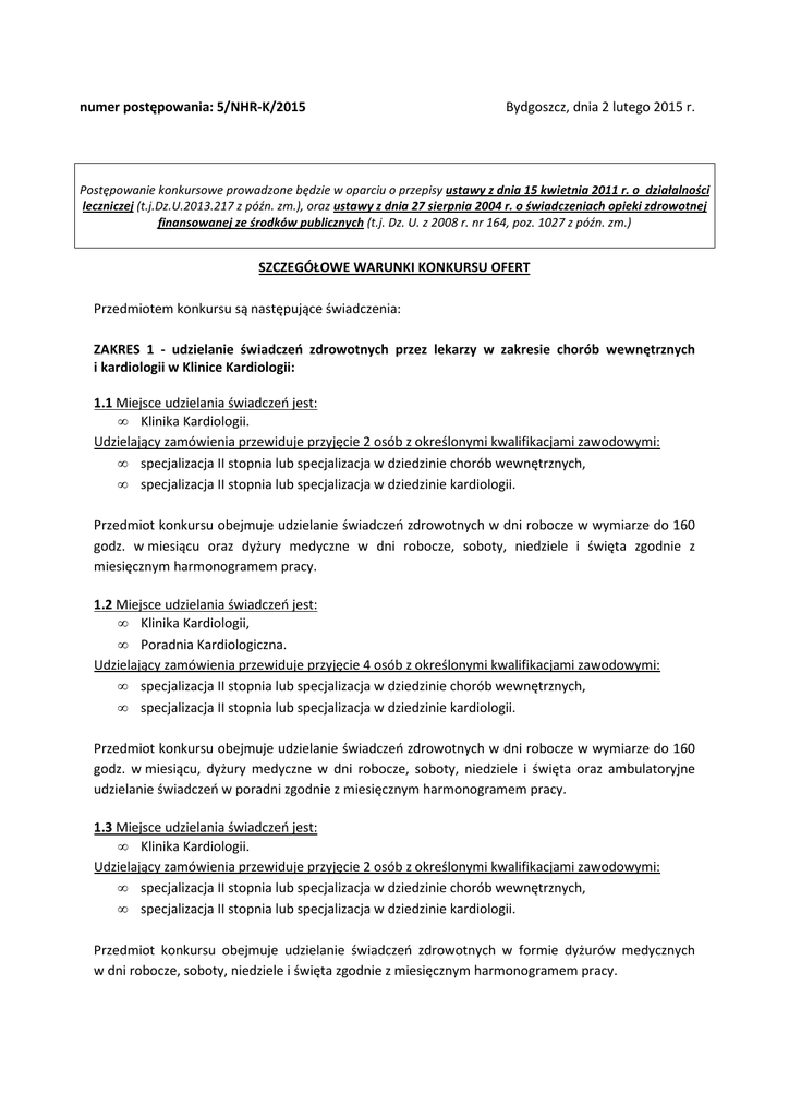numer postępowania: 5/NHR-K/2015 Bydgoszcz, dnia 2 lutego 2015 r. Postępowanie konkursowe prowadzone będzie w oparciu o przepisy ustawy z dnia 15 kwietnia 2011 r. o działalności leczniczej (t.j.Dz.U.2013.217 z późn. zm.), oraz ustawy z dnia 27 sierpnia 2004 r. o świadczeniach opieki zdrowotnej finansowanej ze środków publicznych (t.j. Dz. U. z 2008 r. nr 164, poz. 1027 z późn. zm.) SZCZEGÓŁOWE WARUNKI KONKURSU OFERT Przedmiotem konkursu są następujące świadczenia: ZAKRES 1 - udzielanie świadczeń zdrowotnych przez lekarzy w zakresie chorób wewnętrznych i kardiologii w Klinice Kardiologii: 1.1 Miejsce udzielania świadczeń jest: • Klinika Kardiologii. Udzielający zamówienia przewiduje przyjęcie 2 osób z określonymi kwalifikacjami zawodowymi: • specjalizacja II stopnia lub specjalizacja w dziedzinie chorób wewnętrznych, • specjalizacja II stopnia lub specjalizacja w dziedzinie kardiologii. Przedmiot konkursu obejmuje udzielanie świadczeń zdrowotnych w dni robocze w wymiarze do 160 godz. w miesiącu oraz dyżury medyczne w dni robocze, soboty, niedziele i święta zgodnie z miesięcznym harmonogramem pracy. 1.2 Miejsce udzielania świadczeń jest: • Klinika Kardiologii, • Poradnia Kardiologiczna. Udzielający zamówienia przewiduje przyjęcie 4 osób z określonymi kwalifikacjami zawodowymi: • specjalizacja II stopnia lub specjalizacja w dziedzinie chorób wewnętrznych, • specjalizacja II stopnia lub specjalizacja w dziedzinie kardiologii. Przedmiot konkursu obejmuje udzielanie świadczeń zdrowotnych w dni robocze w wymiarze do 160 godz. w miesiącu, dyżury medyczne w dni robocze, soboty, niedziele i święta oraz ambulatoryjne udzielanie świadczeń w poradni zgodnie z miesięcznym harmonogramem pracy. 1.3 Miejsce udzielania świadczeń jest: • Klinika Kardiologii. Udzielający zamówienia przewiduje przyjęcie 2 osób z określonymi kwalifikacjami zawodowymi: • specjalizacja II stopnia lub specjalizacja w dziedzinie chorób wewnętrznych, • specjalizacja II stopnia lub specjalizacja w dziedzinie kardiologii. Przedmiot konkursu obejmuje udzielanie świadczeń zdrowotnych w formie dyżurów medycznych w dni robocze, soboty, niedziele i święta zgodnie z miesięcznym harmonogramem pracy. ZAKRES 2 - udzielanie świadczeń zdrowotnych przez lekarzy w zakresie chorób wewnętrznych, kardiologii oraz kardiologii inwazyjnej w Klinice Kardiologii: Miejsce udzielania świadczeń jest: • Klinika Kardiologii. Udzielający zamówienia przewiduje przyjęcie 2 osób z określonymi kwalifikacjami zawodowymi: • specjalizacja II stopnia lub specjalizacja w dziedzinie chorób wewnętrznych, • specjalizacja II stopnia lub specjalizacja w dziedzinie kardiologii lub w trakcie specjalizacji w dziedzinie kardiologii. Przedmiot konkursu obejmuje udzielanie świadczeń zdrowotnych w dni robocze w wymiarze do 160 godz. w miesiącu, dyżury medyczne w dni robocze, soboty, niedziele i święta oraz zabezpieczenie kliniki w ramach gotowości tzw. „dyżuru pod telefonem” zgodnie z miesięcznym harmonogramem pracy. ZAKRES 3 - udzielanie świadczeń zdrowotnych przez lekarzy w zakresie chorób wewnętrznych oraz kardiologii inwazyjnej w Klinice Kardiologii: Miejsce udzielania świadczeń jest: • Klinika Kardiologii. Udzielający zamówienia przewiduje przyjęcie 2 osób z określonymi kwalifikacjami zawodowymi: • specjalizacja II stopnia lub specjalizacja w dziedzinie chorób wewnętrznych, • specjalizacja II stopnia lub specjalizacja w dziedzinie kardiologii lub w trakcie specjalizacji w dziedzinie kardiologii. Przedmiot konkursu obejmuje udzielanie świadczeń zdrowotnych w formie dyżurów medycznych w dni robocze, soboty, niedziele i święta oraz zabezpieczenie kliniki w ramach gotowości tzw. „dyżuru pod telefonem” zgodnie z miesięcznym harmonogramem pracy. ZAKRES 4 - udzielanie świadczeń zdrowotnych przez lekarzy w zakresie chorób wewnętrznych, kardiologii oraz elektroterapii serca w Klinice Kardiologii: 4.1. Miejsce udzielania świadczeń jest: • Klinika Kardiologii. Udzielający zamówienia przewiduje przyjęcie 1 osoby z określonymi kwalifikacjami zawodowymi: • specjalizacja II stopnia lub specjalizacja w dziedzinie chorób wewnętrznych, • specjalizacja II stopnia lub specjalizacja w dziedzinie kardiologii. Przedmiot konkursu obejmuje udzielanie świadczeń zdrowotnych w ramach wykonywania procedur wysokospecjalistycznych w klinice oraz w formie dyżurów medycznych w dni robocze, soboty, niedziele i święta zgodnie z miesięcznym harmonogramem pracy. 4.2. Miejsce udzielania świadczeń jest: • Klinika Kardiologii, • Poradnia Kardiologiczna. Udzielający zamówienia przewiduje przyjęcie 3 osób z określonymi kwalifikacjami zawodowymi: • • specjalizacja II stopnia lub specjalizacja w dziedzinie chorób wewnętrznych, specjalizacja II stopnia lub specjalizacja w dziedzinie kardiologii lub w trakcie specjalizacji w dziedzinie kardiologii. Przedmiot konkursu obejmuje udzielanie świadczeń zdrowotnych w ramach wykonywania procedur wysokospecjalistycznych w klinice oraz w formie dyżurów medycznych w dni robocze, soboty, niedziele i święta a także ambulatoryjne udzielanie świadczeń w poradni zgodnie z miesięcznym harmonogramem pracy. 4.3. Miejsce udzielania świadczeń jest: • Klinika Kardiologii, • Poradnia Kardiologiczna. Udzielający zamówienia przewiduje przyjęcie 1 osoby z określonymi kwalifikacjami zawodowymi: • specjalizacja II stopnia lub specjalizacja w dziedzinie chorób wewnętrznych, • specjalizacja II stopnia lub specjalizacja w dziedzinie kardiologii. Przedmiot konkursu obejmuje udzielanie świadczeń zdrowotnych w ramach wykonywania procedur wysokospecjalistycznych w klinice w dni robocze w wymiarze do 160 godz. w miesiącu oraz w formie dyżurów medycznych w dni robocze, soboty, niedziele i święta a także ambulatoryjne udzielanie świadczeń w poradni zgodnie z miesięcznym harmon