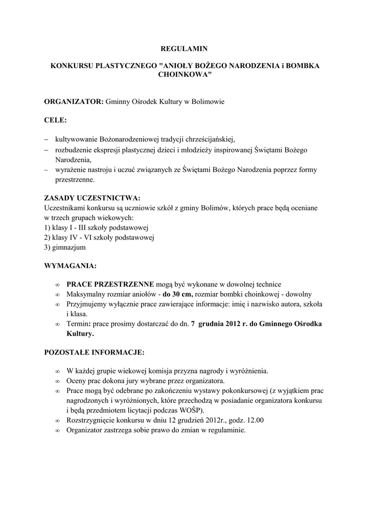 REGULAMIN KONKURSU PLASTYCZNEGO "ANIOŁY BOŻEGO NARODZENIA i BOMBKA CHOINKOWA" ORGANIZATOR: Gminny Ośrodek Kultury w Bolimowie CELE: − kultywowanie Bożonarodzeniowej tradycji chrześcijańskiej, − rozbudzenie ekspresji plastycznej dzieci i młodzieży inspirowanej Świętami Bożego Narodzenia, − wyrażenie nastroju i uczuć związanych ze Świętami Bożego Narodzenia poprzez formy przestrzenne. ZASADY UCZESTNICTWA: Uczestnikami konkursu są uczniowie szkół z gminy Bolimów, których prace będą oceniane w trzech grupach wiekowych: 1) klasy I - III szkoły podstawowej 2) klasy IV - VI szkoły podstawowej 3) gimnazjum WYMAGANIA: • • • • PRACE PRZESTRZENNE mogą być wykonane w dowolnej technice Maksymalny rozmiar aniołów - do 30 cm, rozmiar bombki choinkowej - dowolny Przyjmujemy wyłącznie prace zawierające informacje: imię i nazwisko autora, szkoła i klasa. Termin: prace prosimy dostarczać do dn. 7 grudnia 2012 r. do Gminnego Ośrodka Kultury. POZOSTAŁE INFORMACJE: • • • • • W każdej grupie wiekowej komisja przyzna nagrody i wyróżnienia. Oceny prac dokona jury wybrane przez organizatora. Prace mogą być odebrane po zakończeniu wystawy pokonkursowej (z wyjątkiem prac nagrodzonych i wyróżnionych, które przechodzą w posiadanie organizatora konkursu i będą przedmiotem licytacji podczas WOŚP). Rozstrzygnięcie konkursu w dniu 12 grudzień 2012r., godz. 12.00 Organizator zastrzega sobie prawo do zmian w regulaminie. REGULAMIN KONKURSU PLASTYCZNEGO "ŁAŃCUCH CHOINKOWY" ORGANIZATOR: Gminny Ośrodek Kultury w Bolimowie CELE: − rozbudzenie ekspresji plastycznej dzieci i młodzieży inspirowanej Świętami Bożego Narodzenia, − wyrażenie nastroju i uczuć związanych ze Świętami Bożego Narodzenia poprzez formy przestrzenne, − podkreślenia znaczenia pracy zespołowej. Temat konkursu: wykonanie najdłuższego łańcucha choinkowego 1. Technika wykonania prac dowolna 2. Uczestnicy konkursu: uczniowie przedszkoli i zerówek z terenu gminyBolimów 3. Praca zbiorowa 4. Każda grupa może przekazać na konkurs tylko jednen łańcuch 5. Prace należy złożyć w GOK do dnia 7 grudnia 2012 r. wraz z imienną listą wykonawców łańcucha. 6. Wszyscy wykonawcy łańcucha choinkowego otrzymają słodkie upominki, a zwycięska grupa nagrody i dyplomy. 7. Podsumowanie konkursu nastąpi w dniu 12.12.2012 r. o godz.12. 8. Prace przekazane na konkurs przechodzą na własność organizatora. 9. Wszystkie sprawy nie ujęte w regulaminie rozstrzyga organizator. REGULAMIN KONKURSU POETYCKIEGO "WIERSZ NA BOŻE NARODZENIE" ORGANIZATOR: Gminna Biblioteka Publiczna w Bolimowie CEL: rozwój twórczości literackiej dzieci i młodzieży, związanej z tematyką Świąt Bożego Narodzenia oraz pielęgnowanie tradycji bożonarodzeniowych ZASADY UCZESTNICTWA: 1. Do udziału w konkursie zapraszamy uczniów klas IV- VI ze szkół podstawowych oraz gimnazjum 2. Konkurs zostanie przeprowadzony z podziałem na grupy wiekowe: - grupa I – klasa IV – VI - grupa II – gimnazjum WYMAGANIA: 1. Każdy autor może zgłosić 1 wiersz mieszczący się maksymalnie na 1 stronie A4 napisany czcionką 12 Times New Roman, odstęp pomiędzy wierszami 1,5. 2. Autorzy udzielają zgody organizatorowi na wielokrotne wykorzystanie przysłanych wierszy w różnych publikacjach 3. Do konkursu można zgłaszać tylko wiersze nigdzie nie publikowane, samodzielnie napisane 4. Utwór należy przekazać do GOK-u wydrukowany oraz koniecznie przesłać na e-mail [email protected] do 7 grudnia 2012 r. 5. Przyjmujemy wyłącznie prace zawierające informacje: imię i nazwisko autora, szkoła i klasa POZOSTAŁE INFORMACJE: 1. Uroczyste ogłoszenie wyników i wręczenie nagród nastąpi 12 grudnia 2012 r. o godz. 12.00 w GOK. 2. Prace nagrodzone zostaną zamieszczone na stronie www.gokbolimow.pl 3. Laureaci konkursu otrzymają dyplomy oraz drobne upominki rzeczowe 4. Oceny przysłanych wierszy dokona jury powołane przez organizatora. 5. Nadesłanie prac oznacza akceptację warunków konkursu i regulaminu 6. Organizator zastrzega sobie prawo do zmian w regulaminie