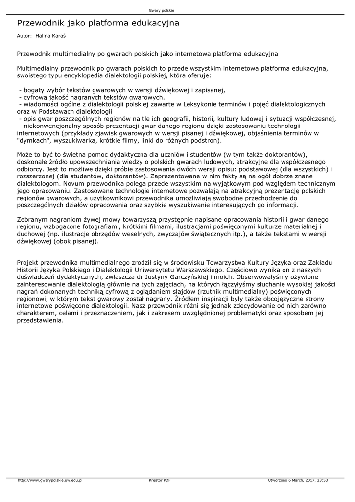 Gwary polskie Przewodnik jako platforma edukacyjna Autor: Halina Karaś Przewodnik multimedialny po gwarach polskich jako internetowa platforma edukacyjna Multimedialny przewodnik po gwarach polskich to przede wszystkim internetowa platforma edukacyjna, swoistego typu encyklopedia dialektologii polskiej, która oferuje: - bogaty wybór tekstów gwarowych w wersji dźwiękowej i zapisanej, - cyfrową jakość nagranych tekstów gwarowych, - wiadomości ogólne z dialektologii polskiej zawarte w Leksykonie terminów i pojęć dialektologicznych oraz w Podstawach dialektologii - opis gwar poszczególnych regionów na tle ich geografii, historii, kultury ludowej i sytuacji współczesnej, - niekonwencjonalny sposób prezentacji gwar danego regionu dzięki zastosowaniu technologii internetowych (przykłady zjawisk gwarowych w wersji pisanej i dźwiękowej, objaśnienia terminów w "dymkach", wyszukiwarka, krótkie filmy, linki do różnych podstron). Może to być to świetna pomoc dydaktyczna dla uczniów i studentów (w tym także doktorantów), doskonałe źródło upowszechniania wiedzy o polskich gwarach ludowych, atrakcyjne dla współczesnego odbiorcy. Jest to możliwe dzięki próbie zastosowania dwóch wersji opisu: podstawowej (dla wszystkich) i rozszerzonej (dla studentów, doktorantów). Zaprezentowane w nim fakty są na ogół dobrze znane dialektologom. Novum przewodnika polega przede wszystkim na wyjątkowym pod względem technicznym jego opracowaniu. Zastosowane technologie internetowe pozwalają na atrakcyjną prezentację polskich regionów gwarowych, a użytkownikowi przewodnika umożliwiają swobodne przechodzenie do poszczególnych działów opracowania oraz szybkie wyszukiwanie interesujących go informacji. Zebranym nagraniom żywej mowy towarzyszą przystępnie napisane opracowania historii i gwar danego regionu, wzbogacone fotografiami, krótkimi filmami, ilustracjami poświęconymi kulturze materialnej i duchowej (np. ilustracje obrzędów weselnych, zwyczajów świątecznych itp.), a także tekstami w wersji dźwiękowej (obok pisanej). Projekt przewodnika multimedialnego zrodził się w środowisku Towarzystwa Kultury Języka oraz Zakładu Historii Języka Polskiego i Dialektologii Uniwersytetu Warszawskiego. Częściowo wynika on z naszych doświadczeń dydaktycznych, zwłaszcza dr Justyny Garczyńskiej i moich. Obserwowałyśmy ożywione zainteresowanie dialektologią głównie na tych zajęciach, na których łączyłyśmy słuchanie wysokiej jakości nagrań dokonanych techniką cyfrową z oglądaniem slajdów (rzutnik multimedialny) poświęconych regionowi, w którym tekst gwarowy został nagrany. Źródłem inspiracji były także obcojęzyczne strony internetowe poświęcone dialektologii. Nasz przewodnik różni się jednak zdecydowanie od nich zarówno charakterem, celami i przeznaczeniem, jak i zakresem uwzględnionej problematyki oraz sposobem jej przedstawienia. http://www.gwarypolskie.uw.edu.pl Kreator PDF Utworzono 6 March, 2017, 23:53