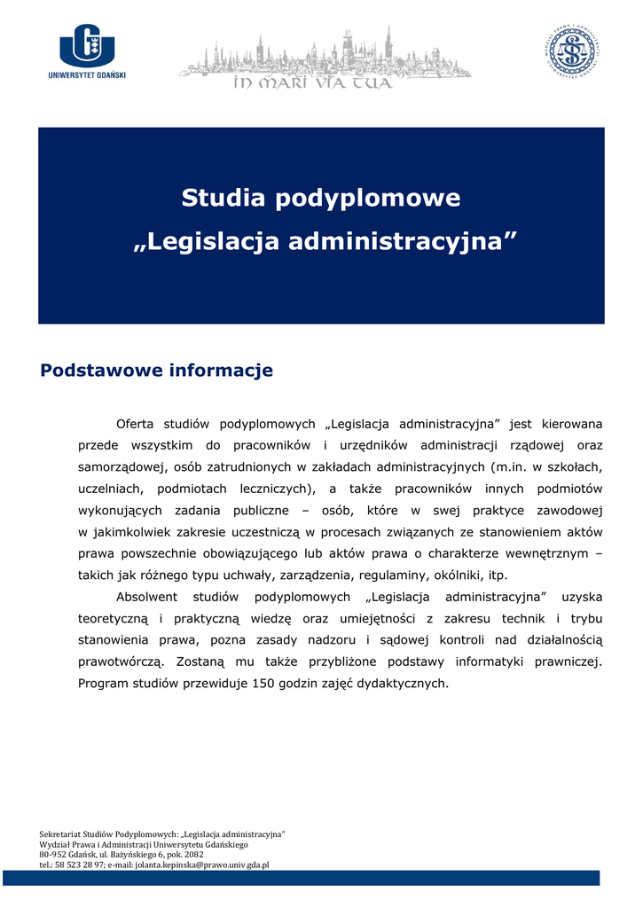 Studia podyplomowe „Legislacja administracyjna” Podstawowe informacje Oferta studiów podyplomowych „Legislacja administracyjna” jest kierowana przede wszystkim do pracowników i urzędników administracji rządowej oraz samorządowej, osób zatrudnionych w zakładach administracyjnych (m.in. w szkołach, uczelniach, podmiotach wykonujących zadania leczniczych), publiczne – a także osób, pracowników które w swej innych podmiotów praktyce zawodowej w jakimkolwiek zakresie uczestniczą w procesach związanych ze stanowieniem aktów prawa powszechnie obowiązującego lub aktów prawa o charakterze wewnętrznym – takich jak różnego typu uchwały, zarządzenia, regulaminy, okólniki, itp. Absolwent studiów podyplomowych „Legislacja administracyjna” uzyska teoretyczną i praktyczną wiedzę oraz umiejętności z zakresu technik i trybu stanowienia prawa, pozna zasady nadzoru i sądowej kontroli nad działalnością prawotwórczą. Zostaną mu także przybliżone podstawy informatyki prawniczej. Program studiów przewiduje 150 godzin zajęć dydaktycznych. Sekretariat Studiów Podyplomowych: „Legislacja administracyjna” Wydział Prawa i Administracji Uniwersytetu Gdańskiego 80-952 Gdańsk, ul. Bażyńskiego 6, pok. 2082 tel.: 58 523 28 97; e-mail: [email protected] Program studiów Blok I. Zagadnienia wstępne 1. Podstawowe pojęcia i prawne konstrukcje legislacji administracyjnej 2. Źródła prawa w obowiązującym porządku prawno-konstytucyjnym 3. Zasada prawidłowej legislacji i inne konstytucyjne dyrektywy stanowienia prawa Blok II. Kompetencje prawotwórcze podmiotów administracji publicznej 4. Pojęcie kompetencji i upoważnień prawotwórczych. Podmioty administracji publicznej o kompetencjach prawotwórczych 5. Współudział podmiotów spoza systemu władzy publicznej w tworzeniu prawa 6. Lobbing jako szczególna postać współudziału podmiotów spoza systemu władzy publicznej w tworzeniu prawa 7. Konsekwencje zmiany lub uchylenia przepisu upoważaniającego do stanowienia prawa 8. Odpowiedzialność cywilnoprawna za szkody powstałe w związku z realizacją kompetencji prawotwórczych podmiotów administracji publicznej oraz w związku z zaniechaniem realizacji kompetencji prawotwórczych Blok III. Technika prawodawcza 9. 10. 11. 12. 13. Wprowadzenie do metodyki prac prawodawczych Reguły języka prawnego Zasady Techniki Prawodawczej Redagowanie tekstu aktu prawnego Ocena skutków regulacji Blok IV. Ogłaszanie i notyfikacja aktów prawnych 14. Pojęcie ogłaszania prawa; prawna regulacja ogłaszania prawa; zasady redagowania i wydawania publikatorów urzędowych; sprostowania błędów 15. Obowiązki notyfikacyjne organów państw członkowskich Unii Europejskiej Blok V. Sporządzanie typowych aktów prawnych przez podmioty administracji publicznej 16. 17. 18. 19. Akty w sprawie współdziałania Akty erygujące, statuty, regulaminy organizacyjne Wytyczne Przepisy porządkowe Sekretariat Studiów Podyplomowych: „Legislacja administracyjna” Wydział Prawa i Administracji Uniwersytetu Gdańskiego 80-952 Gdańsk, ul. Bażyńskiego 6, pok. 2082 tel.: 58 523 28 97; e-mail: [email protected] 20. 21. 22. 23. 24. Przepisy finansowe, akty budżetowe Akty planowania pozafinansowego Strategie i programy Akty w sprawach majątkowych i dotyczące zasad zarządu mieniem Akty w sprawie zasad i trybu korzystania z obiektów i urządzeń użyteczności publicznej 25. Akty prawa zakładowego 26. Wybrane przepisy wykonawcze 27. Kodeksy etyki Blok VI. Nadzór nad prawotwórczą działalnością administracji 28. Nadzór „zewnętrzny” 29. Nadzór „wewnętrzny” Blok VII. Sądowa kontrola aktów legislacji administracyjnej 30. Kontrola aktów prawotwórczych stanowionych przez podmioty administracji publicznej sprawowana przez sądy administracyjne 31. Pisma procesowe w sprawach z zakresu sądowoadministracyjnej kontroli aktów prawotwórczych stanowionych przez podmioty administracji publicznej 32. Trybunał Konstytucyjny wobec aktów stanowienia prawa terenowych podmiotów administracji publicznej Blok VIII Informatyka prawnicza (wybrane zagadnienia) 33. Systemy informacji prawnej jako źródła informacji w procesie legislacyjnym 34. Bazy „aktów własnych” w administracji publicznej Blok IX Podsumowanie 35. Podsumowanie – wnioski końcowe Sekretariat Studiów Podyplomowych: „Legislacja administracyjna” Wydział Prawa i Administracji Uniwersytetu Gdańskiego 80-952 Gdańsk, ul. Bażyńskiego 6, pok. 2082 tel.: 58 523 28 97; e-mail: [email protected] Zajęcia Studia podyplomowe „Legislacja administracyjna” są prowadzone w formie niestacjonarnej w wymiarze 150 godzin przez dwa semestry w soboty w godzinach od 9:00 do 15:00. Pierwsze zajęcia są planowane na dzień 5 marca 2016 roku. Zajęcia będą prowadzone w formie wykładów i konwersatoriów z wykorzystaniem dorobku doktryny oraz orzecznictwa Trybunału Konstytucyjnego, Naczelnego Sądu Administracyjnego i wojewódzkich sądów administracyjnych, a także w formie warsztatów, w czasie których słuchacze będą analizować przypadki aktów prawnych poddanych kontroli organów nadzoru i sądów administracyjnych oraz sporządzać projekty aktów prawnych oraz pism procesowych w postępowaniach dotyczących nadzoru i kontroli prawotwórczej działalności terenowych podmiotów administracji publicznej. Koszty Opłata za uczestnictwo w studiach podyplomowych „Legislacja administracyjna” wynosi 4.150 złotych (2.075 zł za semestr) – płatne w kwocie 2.075 zł do 29 lutego 2016 r. (za I semestr) oraz 2.075 zł do 30 września 2016 r. (za II semestr). Kadra Zajęcia w ramach studiów podyplomowych „Legislacja administracyjna” będą prowadzone przez pracowników i współpracowników Wydziału Prawa i Administracji Uniwersytetu Gdańskiego, w tym osoby łączące pracę naukowo-dydaktyczną z praktyką prawniczą i administracyjną. Kontakt Jolanta Kępińska, pok. 2082 Sekretariat
