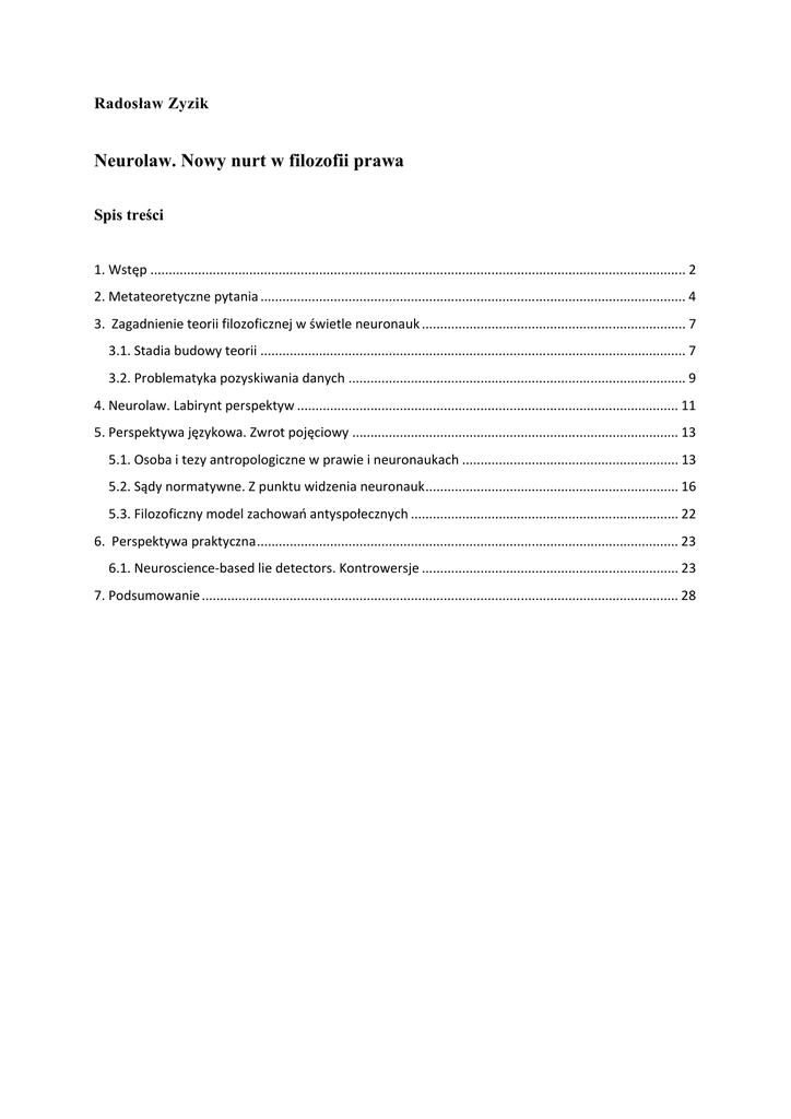 Radosław Zyzik Neurolaw. Nowy nurt w filozofii prawa Spis treści 1. Wstęp .................................................................................................................................................. 2 2. Metateoretyczne pytania .................................................................................................................... 4 3. Zagadnienie teorii filozoficznej w świetle neuronauk ........................................................................ 7 3.1. Stadia budowy teorii .................................................................................................................... 7 3.2. Problematyka pozyskiwania danych ............................................................................................ 9 4. Neurolaw. Labirynt perspektyw ........................................................................................................ 11 5. Perspektywa językowa. Zwrot pojęciowy ......................................................................................... 13 5.1. Osoba i tezy antropologiczne w prawie i neuronaukach ........................................................... 13 5.2. Sądy normatywne. Z punktu widzenia neuronauk ..................................................................... 16 5.3. Filozoficzny model zachowań antyspołecznych ......................................................................... 22 6. Perspektywa praktyczna ................................................................................................................... 23 6.1. Neuroscience-based lie detectors. Kontrowersje ...................................................................... 23 7. Podsumowanie .................................................................................................................................. 28 1. Wstęp Próby łączenia prawa i nauk neurokognitywnych na pierwszy rzut oka mogą wydawać się przedsięwzięciem nie tyle odważnym, co wręcz brawurowym. Poszukiwanie odpowiedzi na pytania z zakresu nauk prawnych i prawno-filozoficznych w neuronaukach, wymaga syntezy nie tylko dwóch różnych dziedzin wiedzy, ale również dwóch różnych sposobów uprawiania nauki. Do niedawna jeszcze panowała opinia, że przedstawiciele nauk humanistycznych (the arts) nie mogą w swych analizach posługiwać się wynikami badań prowadzonych w naukach przyrodniczych (science). Tego rodzaju przekonanie traci jednak (na szczęście) coraz bardziej na znaczeniu. Filozofowie, a także teoretycy różnych dziedzin, coraz częściej w swych intelektualnych wojażach, zapuszczają się na tereny dotychczas zarezerwowane dla członków kasty przyrodników. W miejscu starego, pojawia się tutaj jednak inny problem, mianowicie normatywna natura prawa uodparnia w pewnym stopniu tę dziedzinę wiedzy (praktyki) na zmiany zachodzące w naukach, których twierdzenia są ściśle deskryptywne. Oczywiście, na gruncie prawa mamy do czynienia z normatywnym charakterem twierdzeń, jednakże cały system prawa (łącznie z doktryną, judykaturą etc.) zakłada pewne tezy deskryptywne. I to właśnie one mogą zmieniać się pod wpływem rozwoju neuronauk. To zagadnienie jest jednak na tyle obszerne, że nie będzie przedmiotem precyzyjnej refleksji w tej pracy, chociaż zostanie w pewnym stopniu przedyskutowane w dalszej części. Wiek XX nazwany jest wiekiem fizyki, wiek XXI zapewne zwany będzie wiekiem biologii. To właśnie biologia (bardzo szeroko pojęta) poczyniła w ostatnich dwudziestu latach najbardziej spektakularne postępy. W ramach biologii możemy wyróżnić neurobiologię, z kolei w ramach neurobiologii, wyróżniamy szereg bardziej szczegółowych dyscyplin, jedną z których są nauki neurokognitywne (cognitive neurosciences)1. Mają one za swój przedmiot m.in.: uwagę (attention), język, pamięć, motywacje, sposoby postrzegania, podstawy zachowań społecznych, a przede wszystkim podstawy podejmowania decyzji. Oferują one - filozofom prawa w pierwszej kolejności, ale także prawnikom praktykom - nowe perspektywy, z których analizować będzie można teoretyczne i praktyczne problemy nauk prawnych. 1 W dalszej części pracy, ze względów metodologicznych, będę posługiwał się pojęciem “neuronauk” w znaczeniu nauk neurokognitywnych. 2 Niektórzy z przedstawicieli prawa i etyki zaczynają mówić wprost o początku naturalizacji2 nauk normatywnych. Ten daleko posunięty optymizm (optymizmem wszakże jest zakładanie, że zbliżamy się do ideału pewności wiedzy przyrodniczej), nie jest pozbawiony podstaw. Zwłaszcza dzisiaj, gdy coraz większa grupa naukowców, prawników praktyków i filozofów dostrzega potencjalnie duże możliwości płynące z powstania tzw. neurolaw – czyli interdyscyplinarnej dziedziny badań, która skupia się na systematycznej analizie możliwego wpływu wyników badań neuronauk na nauki prawne. Neurolaw wpisuje się w szerszy nurt interdyscyplinarnych badań nad prawem, który współtworzą m.in. socjologia prawa, ekonomiczna analiza prawa, critical legal studies, szkoła psychologiczna. Sama idea sięgania do innych dziedzin wiedzy nie jest więc czymś zupełnie nowym. Z tą różnicą, że w przypadku neurolaw nie odwołujemy się do psychologii czy ekonomii, ale do neuronauk. Dlatego także przyjmuje się zwykle, że ma ono (przynajmniej) jedną przewagę nad powyższymi interdyscyplinarnymi stanowiskami, mianowicie jest najmocniej związane z science. Dziedziną ludzkiej wiedzy, o której można bez najmniejszych wątpliwości powiedzieć, że poczyniła najbardziej spektakularne postępy i spełniła wiele z pokładanych w nią nadziei. Celem niniejszego tekstu będzie więc zaprezentowanie problematyki związanej z neurolaw. Po pierwsze, zostaną przedstawione kwestie metateoretyczne wynikające z łączenia prawa i neuronauk. Ta ogólna refleksja jest o tyle potrzebna, o ile zarysuje nam horyzont ogólnych problemów, z