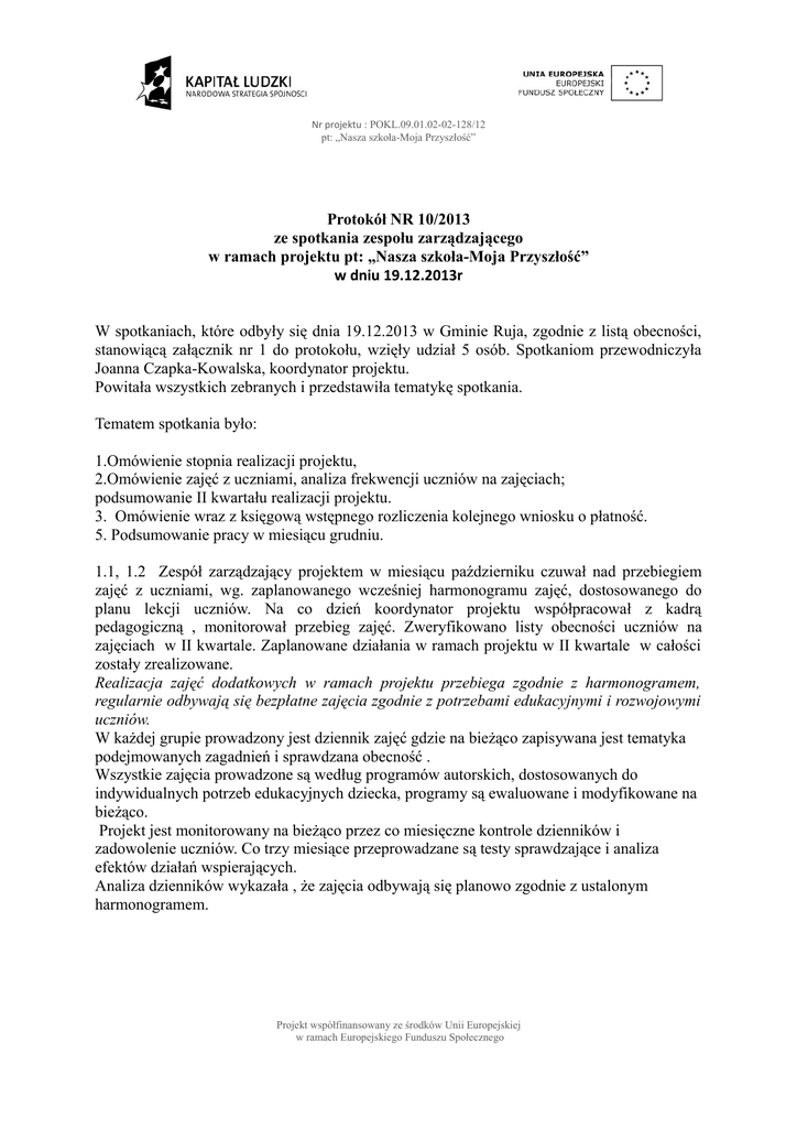 Nr projektu : POKL.09.01.02-02-128/12 pt: „Nasza szkoła-Moja Przyszłość” Protokół NR 10/2013 ze spotkania zespołu zarządzającego w ramach projektu pt: „Nasza szkoła-Moja Przyszłość” w dniu 19.12.2013r W spotkaniach, które odbyły się dnia 19.12.2013 w Gminie Ruja, zgodnie z listą obecności, stanowiącą załącznik nr 1 do protokołu, wzięły udział 5 osób. Spotkaniom przewodniczyła Joanna Czapka-Kowalska, koordynator projektu. Powitała wszystkich zebranych i przedstawiła tematykę spotkania. Tematem spotkania było: 1.Omówienie stopnia realizacji projektu, 2.Omówienie zajęć z uczniami, analiza frekwencji uczniów na zajęciach; podsumowanie II kwartału realizacji projektu. 3. Omówienie wraz z księgową wstępnego rozliczenia kolejnego wniosku o płatność. 5. Podsumowanie pracy w miesiącu grudniu. 1.1, 1.2 Zespół zarządzający projektem w miesiącu październiku czuwał nad przebiegiem zajęć z uczniami, wg. zaplanowanego wcześniej harmonogramu zajęć, dostosowanego do planu lekcji uczniów. Na co dzień koordynator projektu współpracował z kadrą pedagogiczną , monitorował przebieg zajęć. Zweryfikowano listy obecności uczniów na zajęciach w II kwartale. Zaplanowane działania w ramach projektu w II kwartale w całości zostały zrealizowane. Realizacja zajęć dodatkowych w ramach projektu przebiega zgodnie z harmonogramem, regularnie odbywają się bezpłatne zajęcia zgodnie z potrzebami edukacyjnymi i rozwojowymi uczniów. W każdej grupie prowadzony jest dziennik zajęć gdzie na bieżąco zapisywana jest tematyka podejmowanych zagadnień i sprawdzana obecność . Wszystkie zajęcia prowadzone są według programów autorskich, dostosowanych do indywidualnych potrzeb edukacyjnych dziecka, programy są ewaluowane i modyfikowane na bieżąco. Projekt jest monitorowany na bieżąco przez co miesięczne kontrole dzienników i zadowolenie uczniów. Co trzy miesiące przeprowadzane są testy sprawdzające i analiza efektów działań wspierających. Analiza dzienników wykazała , że zajęcia odbywają się planowo zgodnie z ustalonym harmonogramem. Projekt współfinansowany ze środków Unii Europejskiej w ramach Europejskiego Funduszu Społecznego Nr projektu : POKL.09.01.02-02-128/12 pt: „Nasza szkoła-Moja Przyszłość” Analiza efektów działań pedagogicznych wykazała, że: W II kwartale realizacji projektu zrealizowano: - 116 godzin zajęć dydaktyczno-wyrównawczych -38 godzin zajęć terapii pedagogicznej - 19 godzin warsztatów z pedagogiem - 38 godzin zajęć korekcyjno-kompensacyjnych - 19 godzin zajęć matematycznych dla uczniów uzdolnionych - 19 godzin zajęć przyrodniczych dla uczniów uzdolnionych - 38 godzin z zakresu pedagogiki specjalnej Wraz z Kolejnym wnioskiem o płatność przygotowywanym do rozliczenia w styczniu, nie przekazywano formularza PEFS ( zgodnie z zaleceniem opiekuna projektu) , nie wystąpiły zmiany w liczbie uczestników projektu zmiany dotyczące danych osobowych uczestników projektu. Koordynator projektu podsumował prace w miesiącu grudniu, po raz kolejny przypomniano założenia projektu, rodzaje zajęć. Uzgodniono harmonogram zajęć z uczniami na kolejny miesiąc. Na zakończenie Pani J. Czapka-Kowalska jeszcze raz poinformowała o współfinansowaniu projektu ze środków Europejskiego Funduszu Społecznego oraz przekazała uczestnikom spotkania informację o kolejnym spotkaniu, w dniu 28.01.2014, celem omówienia szczegółowych zasad realizacji projektu oraz omówieniu pracy w ramach projektu. Na tym protokół zakończono. Przewodnicząca Spotkania – Joanna Czapka-Kowalska Protokołowała – Grażyna Rzepa Projekt współfinansowany ze środków Unii Europejskiej w ramach Europejskiego Funduszu Społecznego