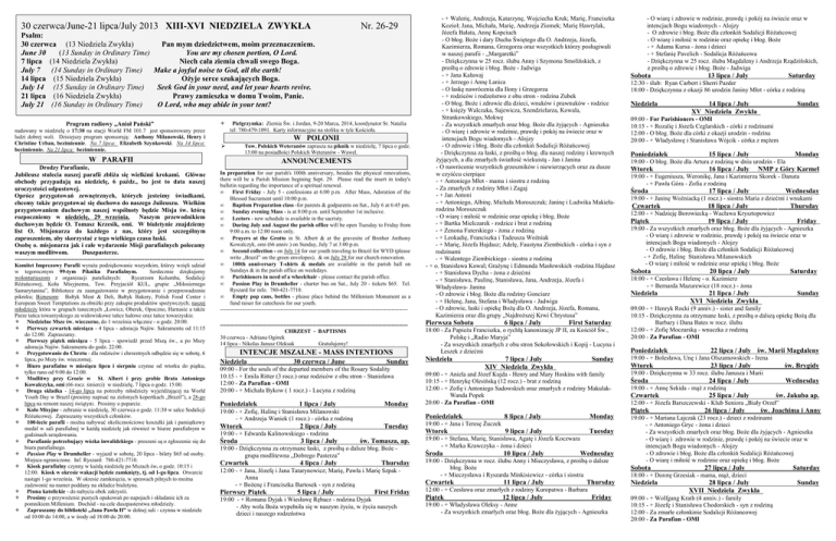 30 czerwca/June-21 lipca/July 2013 XIII-XVI NIEDZIELA ZWYKŁA Nr. 26-29 Psalm: 30 czerwca (13 Niedziela Zwykła) Pan mym dziedzictwem, moim przeznaczeniem. June 30 (13 Sunday in Ordinary Time) You are my chosen portion, O Lord. 7 lipca (14 Niedziela Zwykła) Niech cała ziemia chwali swego Boga. July 7 (14 Sunday in Ordinary Time) Make a joyful noise to God, all the earth! 14 lipca (15 Niedziela Zwykła) Ożyje serce szukających Boga. July 14 (15 Sunday in Ordinary Time) Seek God in your need, and let your hearts revive. 21 lipca (16 Niedziela Zwykła) Prawy zamieszka w domu Twoim, Panie. July 21 (16 Sunday in Ordinary Time) O Lord, who may abide in your tent? Program radiowy „Anioł Pański” nadawany w niedzielę o 17:30 na stacji World FM 101.7 jest sponsorowany przez ludzi dobrej woli. Dzisiejszy program sponsorują: Anthony Milanowski, Henry i Christine Urban, bezimiennie. Na 7 lipca: Elizabeth Szynkowski. Na 14 lipca: bezimiennie. Na 21 lipca: bezimiennie. Pielgrzymka: Ziemia Św. i Jordan, 9-20 Marca, 2014, koordynator Sr. Natalia tel: 780-479-1091. Karty informacyjne na stoliku w tyle Kościoła. W POLONII Tow. Polskich Weteranów zaprasza na piknik w niedzielę, 7 lipca o godz. 13:00 na posiadłości Polskich Weteranów - Wawel. W PARAFII Drodzy Parafianie, Jubileusz stulecia naszej parafii zbliża się wielkimi krokami. Główne obchody przypadają na niedzielę, 6 paźdz., bo jest to data naszej uroczystości odpustowej. Oprócz przygotowań zewnętrznych, których jesteśmy świadkami, chcemy także przygotować się duchowo do naszego Juileuszu. Wielkim przygotowaniem duchowym naszej wspólnoty będzie Misja św. którą rozpoczniemy w niedzielę, 29 września. Naszym przewodnikiem duchowym będzie O. Tomasz Krzesik, omi. W biuletynie znajdziemy list O. Misjonarza do każdego z nas, który jest szczególnym zaproszeniem, aby skorzystać z tego wielkiego czasu łaski. Osobę o. misjonarza jak i całe wydarzenie Misji parafialnych polecamy waszym modlitwom. Duszpasterze. -------------------------------------------------------------------------------------------------------Komitet Imprezowy Parafii wyraża podziękowanie wszystkim, którzy wzięli udział w tegorocznym 99-tym Pikniku Parafialnym. Serdecznie dziękujemy wolontariuszom z organizacji parafialnych: Rycerzom Kolumba, Sodalicji Różańcowej, Kołu Misyjnemu, Tow. Przyjaciół KUL, grupie „Miłosiernego Samarytanina”, Bibliotece za zaangażowanie w przygotowanie i przeprowadzenie pikniku; Biznesom: Bałtyk Meat & Deli, Bałtyk Bakery, Polish Food Center i European Sweet Temptations za obniżki przy zakupie produktów spożywczych; naszej młodzieży która w grupach tanecznych „Łowicz, Oberek, Opoczno, Harnasie a także Parze tańca towarzyskiego za widowiskowe tańce ludowe oraz tańce towarzyskie. Niedzielne Msze św. wieczorne, do 1 września włącznie - o godz. 20:00. Pierwszy czwartek miesiąca - 4 lipca - adoracja Najśw. Sakramentu od 11:15 do 12:00. Zapraszamy. Pierwszy piątek miesiąca - 5 lipca - spowiedź przed Mszą św., a po Mszy adoracja Najśw. Sakramentu do godz. 22:00. Przygotowanie do Chrztu - dla rodziców i chrzestnych odbędzie się w sobotę, 6 lipca, po Mszy św. wieczornej. Biuro parafialne w miesiącu lipcu i sierpniu czynne od wtorku do piątku, tylko rano od 9:00 do 12:00. Modlitwy przy Grocie w St. Albert i przy grobie Brata Antoniego Kowalczyka, omi (66 rocz. śmierci) w niedzielę, 7 lipca o godz. 15:00. Druga składka - 14-go lipca na potrzeby młodzieży wyjeżdżającej na World Youth Day w Brazil (prosimy napisać na zielonych kopertkach „Brazil”), a 28-go lipca na remont naszej świątyni. Prosimy o poparcie. Koło Misyjne - zebranie w niedzielę, 30 czerwca o godz. 11:30 w salce Sodalicji Różańcowej. Zapraszamy wszystkich członków. 100-lecie parafii - można nabywać okolicznościowe koszulki jak i pamiątkowy medal w sali parafialnej w każdą niedzielę jak również w biurze parafialnym w godzinach urzędowania. Parafianie potrzebujący wózka inwalidzkiego - proszeni są o zgłoszenie się do biura parafialnego. Passion Play w Drumheller - wyjazd w sobotę, 20 lipca - bilety $65 od osoby. Miejsca ograniczone. Inf. Ryszard: 780-421-7710. Kiosk parafialny czynny w każdą niedzielę po Mszach św. o godz. 10:15 i 12:00. Kiosk w okresie wakacji będzie zamknięty, tj. od 1-go lipca. Otwarcie nastąpi 1-go września. W okresie zamknięcia, w sprawach pilnych to można zadzwonić na numer poddany na okładce biuletynu. Pisma katolickie - do nabycia obok zakrystii. Prosimy o przywożenie pustych opakowań po napojach i składanie ich za pomnikiem Millenium. Dochód - na cele duszpasterstwa młodzieży. Zapraszamy do biblioteki „Jana Pawła II” w dolnej sali - czynna w niedziele od 10:00 do 14:00, a w środy od 18:00 do 20:00. ANNOUNCEMENTS In preparation for our parish's 100th anniversary, besides the physical renovations, there will be a Parish Mission begining Sept. 29. Please read the insert in today's bulletin regarding the importance of a spiritual renewal. • First Friday - July 5 - confessions at 6:00 p.m. After Mass, Adoration of the Blessed Sacrament until 10:00 p.m. • Baptism Preparation class -for parents & godparents on Sat., July 6 at 6:45 pm. • Sunday evening Mass - is at 8:00 p.m. until September 1st inclusive. • Lectors - new schedule is available in the sacristy. • During July and August the parish office will be open Tuesday to Friday from 9:00 a.m. to 12:00 noon only. • Prayers at the Grotto in St. Albert & at the gravesite of Brother Anthony Kowalczyk, omi (66 anniv.) on Sunday, July 7 at 3:00 p.m. • Second collection - on July 14 for our youth traveling to Brazil for WYD (please write „Brazil” on the green envelopes), & on July 28 for our church renovation. • 100th anniversary T-shirts & medals are available in the parish hall on Sundays & in the parish office on weekdays. • Parishioners in need of a wheelchair - pl