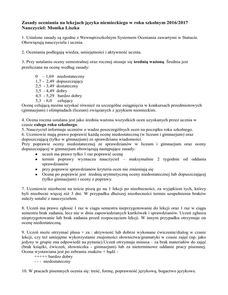 Zasady oceniania na lekcjach języka niemieckiego w roku szkolnym 2016/2017 Nauczyciel: Monika Liszka 1. Ustalone zasady są zgodne z Wewnątrzszkolnym Systemem Oceniania zawartymi w Statucie. Obowiązują nauczyciela i ucznia. 2. Ocenianiu podlegają wiedza, umiejętności i aktywność ucznia. 3. Przy ustalaniu oceny semestralnej oraz rocznej stosuje się średnią ważoną. Średnia jest przeliczana na ocenę według zasady: 0 – 1,69 niedostateczny 1,7 - 2,49 dopuszczający 2,5 - 3,49 dostateczny 3,5 - 4,49 dobry 4,5 - 5,29 bardzo dobry 5,3 - 6,0 celujący Ocenę celującą można uzyskać również za szczególne osiągnięcia w konkursach przedmiotowych (gimnazjum) i olimpiadach (liceum) związanych z językiem niemieckim. 4. Ocena roczna ustalana jest jako średnia ważona wszystkich ocen uzyskanych przez ucznia w czasie całego roku szkolnego. 5. Nauczyciel informuje uczniów o wadze poszczególnych ocen na początku roku szkolnego. 6. Uczniowie mają prawo poprawić każdą ocenę niedostateczną (w liceum i gimnazjum) oraz dopuszczającą (tylko w gimnazjum) ze sprawdzianu wiadomości. Przy poprawie oceny niedostatecznej ze sprawdzianów w liceum i gimnazjum oraz oceny dopuszczającej w gimnazjum obowiązują następujące zasady: uczeń ma prawo tylko 1 raz poprawić ocenę termin poprawy wyznacza nauczyciel – maksymalnie 2 tygodnie od oddania sprawdzianów przy poprawie sprawdzianów kryteria ocen nie zmieniają się Ocena po poprawie jest średnią arytmetyczną oceny niedostatecznej lub dopuszczającej (tylko gimnazjum) i oceny z poprawy. 7. Uczniowie nieobecni na teście piszą go na 1 lekcji po nieobecności, za wyjątkiem tych, którzy byli nieobecni więcej niż 3 dni. W przypadku dłuższej nieobecności termin uzupełnienia braków należy ustalić z nauczycielem. 8. Uczeń ma prawo zgłosić 1 raz w ciągu semestru nieprzygotowanie do lekcji oraz 1 raz w ciągu semestru brak zadania, lecz nie w dniu zapowiedzianych kartkówek i sprawdzianów. Uczeń zgłasza nieprzygotowanie lub brak zadania przed rozpoczęciem lekcji. W innym przypadku otrzymuje on ocenę niedostateczną. 9. Uczeń może otrzymać plusa + za : aktywność lub dobrze wykonane ćwiczenie/dialog w czasie lekcji, czy też umiejętne wykorzystanie znajomości słownictwa/gramatyki w czasie zajęć (np. jako jedyny w grupie zna odpowiedź na pytanie).Uczeń otrzymuje minusa – za brak materiałów do zajęć (brak książki, ćwiczeń, słowniczka - gimnazjum) lub za nieterminowe oddanie pracy pisemnej. Ocena wystawiana jest po zebraniu znaków + bądź +++++ bardzo dobry - - - niedostateczny 10. W pracach pisemnych ocenia się: treść, formę, poprawność językową, bogactwo językowe. 11. W wypowiedziach ustnych ocenia się: poprawność zadania domowego (wypowiedź, ćwiczenia itd.), znajomość słownictwa, zasad gramatyki oraz komunikatywność. Nauczyciel ustnie uzasadnia ocenę powołując się na zasady oceniania wewnątrzszkolnego i zasady oceniania na przedmiocie oraz wymagania na poszczególne stopnie szkolne. Sposoby uzasadniania ustalonej oceny: w przypadku ocen z odpowiedzi ustnych umotywowanie polega na uwzględnieniu mocnych i słabych stron odpowiedzi ucznia, poprawności merytorycznej i gramatycznej, bogactwa językowego, kompozycji (spójności) oraz samodzielności wypowiedzi. przy uzasadnianiu ocen ze sprawdzianów i prac klasowych nauczyciel bierze pod uwagę skalę punktową, według której wystawia ocenę, a która jest zgodna z zasadami oceniania na przedmiocie. w przypadku wypowiedzi pisemnych nauczyciel bierze pod uwagę przekaz informacji (treść), poprawność i bogactwo językowe oraz formę. Procedura uzasadniania ocen: uzasadnienie oceny za odpowiedź ustną następuje bezpośrednio po zakończeniu odpowiedzi w obecności innych uczniów. uzasadnienie oceny za pracę pisemną polega na przyznaniu punktów za poszczególne zadania oraz przedstawieniu poprawnych odpowiedzi, które uczeń może porównać z własną pracą. Nauczyciel może (w przypadku wątpliwości ucznia lub rodziców) wskazać i omówić błędy lub przekazać rodzicom (prawnym opiekunom) ewentualny komentarz ze wskazaniem błędów popełnionych przez ucznia w danej pracy. Na wniosek pisemny rodziców - który może dotyczyć tylko oceny klasyfikacyjnejnauczyciel dokonuje uzasadnienia pisemnego, zgodnie z powyższymi wskazaniami. 12. Progi procentowe na poszczególne stopnie: ocena Sprawdziany Kartkówki, odpowiedź ustna celujący 100 % min 90% z zadań obowiązkowych + bezbłędne wykonanie dodatkowego zadania bardzo dobry od 90 – 99% od 90 – 100% dobry od 75 – 89% od 75 – 89% dostateczny od 60 – 74% od 60 – 74% dopuszczający od 45 – 59% od 45 – 59% niedostateczny od 0 – 44% od 0 – 44%