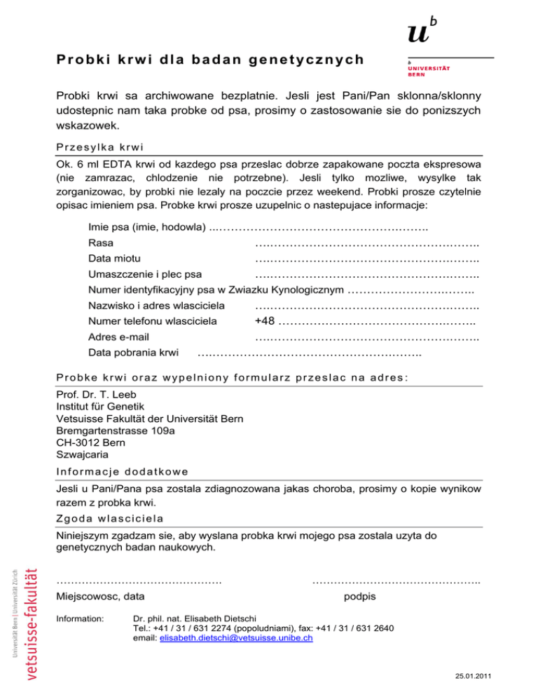 Probki krwi dla badan genetycznych Probki krwi sa archiwowane bezplatnie. Jesli jest Pani/Pan sklonna/sklonny udostepnic nam taka probke od psa, prosimy o zastosowanie sie do ponizszych wskazowek. Przesylka krwi Ok. 6 ml EDTA krwi od kazdego psa przeslac dobrze zapakowane poczta ekspresowa (nie zamrazac, chlodzenie nie potrzebne). Jesli tylko mozliwe, wysylke tak zorganizowac, by probki nie lezaly na poczcie przez weekend. Probki prosze czytelnie opisac imieniem psa. Probke krwi prosze uzupelnic o nastepujace informacje: Imie psa (imie, hodowla) ...……………………………………….…….. ….……………………………………….…….. Data miotu ….……………………………………….…….. Umaszczenie i plec psa ….……………………………………….…….. Numer identyfikacyjny psa w Zwiazku Kynologicznym …………………….…….. Nazwisko i adres wlasciciela ….……………………………………….…….. Numer telefonu wlasciciela +48 …………………………………….…….. Adres e-mail ….……………………………………….…….. Data pobrania krwi ….……………………………………….…….. Rasa Probke krwi oraz wypelniony formularz przeslac na adres : Prof. Dr. T. Leeb Institut für Genetik Vetsuisse Fakultät der Universität Bern Bremgartenstrasse 109a CH-3012 Bern Szwajcaria Informacje dodatkowe Jesli u Pani/Pana psa zostala zdiagnozowana jakas choroba, prosimy o kopie wynikow razem z probka krwi. Zgoda wlasciciela Niniejszym zgadzam sie, aby wyslana probka krwi mojego psa zostala uzyta do genetycznych badan naukowych. ………………………………………. Miejscowosc, data Information: ……………………………………….. podpis Dr. phil. nat. Elisabeth Dietschi Tel.: +41 / 31 / 631 2274 (popoludniami), fax: +41 / 31 / 631 2640 email: [email protected] 25.01.2011