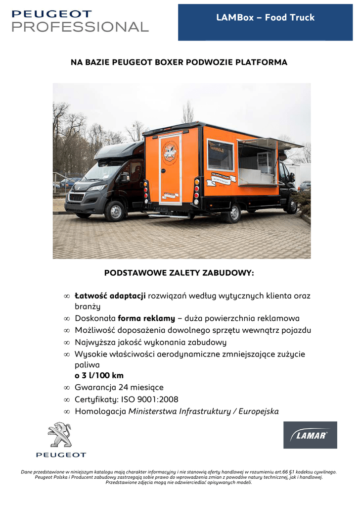 LAMBox – Food Truck NA BAZIE PEUGEOT BOXER PODWOZIE PLATFORMA PODSTAWOWE ZALETY ZABUDOWY: • Łatwość adaptacji rozwiązań według wytycznych klienta oraz branży • Doskonała forma reklamy – duża powierzchnia reklamowa • Możliwość doposażenia dowolnego sprzętu wewnątrz pojazdu • Najwyższa jakość wykonania zabudowy • Wysokie właściwości aerodynamiczne zmniejszające zużycie paliwa o 3 l/100 km • Gwarancja 24 miesiące • Certyfikaty: ISO 9001:2008 • Homologacja Ministerstwa Infrastruktury / Europejska Dane przedstawione w niniejszym katalogu mają charakter informacyjny i nie stanowią oferty handlowej w rozumieniu art.66 §1 kodeksu cywilnego. Peugeot Polska i Producent zabudowy zastrzegają sobie prawo do wprowadzenia zmian z powodów natury technicznej, jak i handlowej. Przedstawione zdjęcia mogą nie odzwierciedlać opisywanych modeli. LAMBox – Food Truck CHARAKTERYSTYKA ZABUDOWY: • • • • • • • • • • • Konstrukcja kontenera wykonana z płyt warstwowych typu „Sandwich” z poszyciem zewnętrznych i wewnętrznym z laminatu poliestrowo – szklanego w kolorze białym, system łączenia ścian oparty na profilach aluminiowych, malowanych proszkowo rama nośna zabudowy wykonana z profili aluminiowych podłoga zabudowy wykonana ze sklejki wodoodpornej z efektem antypoślizgowym pełna ściana przednia wykonana z profili aluminiowych anodowanych ochronne listwy przypodłogowe aluminiowe oświetlenie wewnętrzne diodowe spojler tylny z oświetleniem obrysowym oraz dodatkowym światłem STOP oświetlenie zewnętrzne – obrysowe diodowe, zgodne z przepisami KD i UE wewnętrzne oświetlenie LED fartuchy przeciwbłotne • nadkola z tworzywa sztucznego OPCJE DODATKOWE: • • • • drzwi przesuwne do kabiny kierowcy w ścianie przedniej zagospodarowanie alkowy: dodatkowa przestrzeń dla kierowcy lub dodatkowa przestrzeń ładunkowa indywidualne doposażenie o meble i inne urządzenia dostosowane do branży oraz wykorzystania pojazdu doposażenie o sprzęt gastronomiczny lub multimedialny Dane przedstawione w niniejszym katalogu mają charakter informacyjny i nie stanowią oferty handlowej w rozumieniu art.66 §1 kodeksu cywilnego. Peugeot Polska i Producent zabudowy zastrzegają sobie prawo do wprowadzenia zmian z powodów natury technicznej, jak i handlowej. Przedstawione zdjęcia mogą nie odzwierciedlać opisywanych modeli.