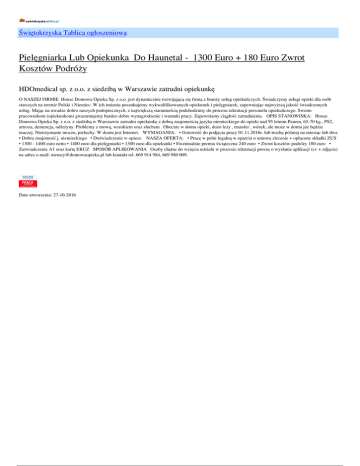 Świętokrzyska Tablica ogłoszeniowa Pielęgniarka Lub Opiekunka Do Haunetal - 1300 Euro + 180 Euro Zwrot Kosztów Podróży HDOmedical sp. z o.o. z siedzibą w Warszawie zatrudni opiekunkę O NASZEJ FIRMIE House Domowa Opieka Sp. z o.o. jest dynamicznie rozwijającą się firmą z branży usług opiekuńczych. Świadczymy usługi opieki dla osób starszych na terenie Polski i Niemiec. W ich imieniu poszukujemy wykwalifikowanych opiekunek i pielęgniarek, zapewniając najwyższą jakość świadczonych usług. Mając na uwadze dobro naszych podopiecznych, z największą starannością podchodzimy do procesu rekrutacji personelu opiekuńczego. Swoim pracownikom (opiekunkom) gwarantujemy bardzo dobre wynagrodzenie i warunki pracy. Zapewniamy ciągłość zatrudnienia. OPIS STANOWISKA: House Domowa Opieka Sp. z o.o. z siedzibą w Warszawie zatrudni opiekunkę z dobrą znajomością języka niemieckiego do opieki nad 95 letnim Panem, 65-70 kg., PS2, artroza, demencja, odleżyny. Problemy z mową, wzrokiem oraz słuchem . Obecnie w domu opieki, dużo leży , transfer , wózek, ale może w domu już będzie inaczej. Nietrzymanie moczu, pieluchy. W domu jest Internet. WYMAGANIA: • Gotowość do podjęcia pracy 01.11.2016r. lub trochę później na miesiąc lub dwa • Dobra znajomość j. niemieckiego • Doświadczenie w opiece NASZA OFERTA: • Pracę w pełni legalną w oparciu o umowę zlecenie + opłacone składki ZUS • 1300 - 1400 euro netto • 1400 euro dla pielęgniarki • 1300 euro dla opiekunki • Ewentualnie premia świąteczna 240 euro • Zwrot kosztów podróży 180 euro • Zaświadczenie A1 oraz kartę EKUZ SPOSÓB APLIKOWANIA Osoby chętne do wzięcia udziału w procesie rekrutacji proszę o wysłanie aplikacji (cv + zdjęcie) na adres e-mail: [email protected] lub kontakt tel. 669 914 984, 669 980 009. Date utworzenia: 27-10-2016
