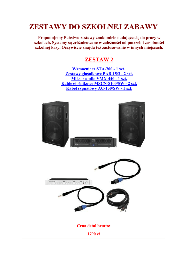 ZESTAWY DO SZKOLNEJ ZABAWY Proponujemy Państwu zestawy znakomicie nadające się do pracy w szkołach. Systemy są zróŜnicowane w zaleŜności od potrzeb i zasobności szkolnej kasy. Oczywiście znajda teŜ zastosowanie w innych miejscach. ZESTAW 2 Wzmacniacz STA-700 - 1 szt. Zestawy głośnikowe PAB-15/3 - 2 szt. Mikser audio VMX-440 - 1 szt. Kable głośnikowe MSCN-8100/SW - 2 szt. Kabel sygnałowy AC-150/SW - 1 szt. Cena detal brutto: 1790 zł
