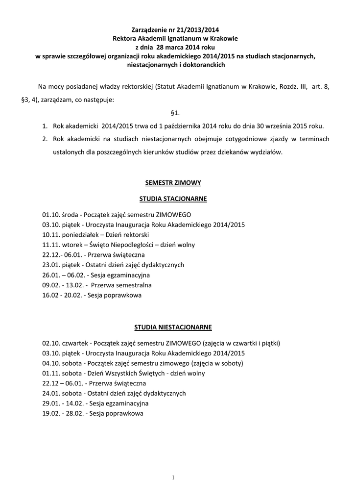 Zarządzenie nr 21/2013/2014 Rektora Akademii Ignatianum w Krakowie z dnia 28 marca 2014 roku w sprawie szczegółowej organizacji roku akademickiego 2014/2015 na studiach stacjonarnych, niestacjonarnych i doktoranckich Na mocy posiadanej władzy rektorskiej (Statut Akademii Ignatianum w Krakowie, Rozdz. III, art. 8, §3, 4), zarządzam, co następuje: §1. 1. Rok akademicki 2014/2015 trwa od 1 października 2014 roku do dnia 30 września 2015 roku. 2. Rok akademicki na studiach niestacjonarnych obejmuje cotygodniowe zjazdy w terminach ustalonych dla poszczególnych kierunków studiów przez dziekanów wydziałów. SEMESTR ZIMOWY STUDIA STACJONARNE 01.10. środa - Początek zajęć semestru ZIMOWEGO 03.10. piątek - Uroczysta Inauguracja Roku Akademickiego 2014/2015 10.11. poniedziałek – Dzień rektorski 11.11. wtorek – Święto Niepodległości – dzień wolny 22.12.- 06.01. - Przerwa świąteczna 23.01. piątek - Ostatni dzień zajęć dydaktycznych 26.01. – 06.02. - Sesja egzaminacyjna 09.02. - 13.02. - Przerwa semestralna 16.02 - 20.02. - Sesja poprawkowa STUDIA NIESTACJONARNE 02.10. czwartek - Początek zajęć semestru ZIMOWEGO (zajęcia w czwartki i piątki) 03.10. piątek - Uroczysta Inauguracja Roku Akademickiego 2014/2015 04.10. sobota - Początek zajęć semestru zimowego (zajęcia w soboty) 01.11. sobota - Dzień Wszystkich Świętych - dzień wolny 22.12 – 06.01. - Przerwa świąteczna 24.01. sobota - Ostatni dzień zajęć dydaktycznych 29.01. - 14.02. - Sesja egzaminacyjna 19.02. - 28.02. - Sesja poprawkowa 1 STUDIA DOKTORANCKIE 01.10. środa - Początek zajęć semestru ZIMOWEGO 03.10. piątek - Uroczysta Inauguracja Roku Akademickiego 2014/2015 10.11. poniedziałek – Dzień rektorski 11.11. wtorek – Święto Niepodległości – dzień wolny 22.12.- 06.01. - Przerwa świąteczna 24.01. sobota - Ostatni dzień zajęć dydaktycznych 26.01. – 07.02. - Sesja egzaminacyjna 09.02. - 14.02. - Przerwa semestralna 16.02. - 21.02. - Sesja poprawkowa SEMESTR LETNI STUDIA STACJONARNE 23.02. poniedziałek - Początek zajęć semestru LETNIEGO 10.03. wtorek - rocznica kanonizacji Św. Ignacego - Święto Uczelni 02.04.-07.04. - Przerwa świąteczna 01.05. piątek- Święto Pracy - dzień wolny 04.06. czwartek – Boże Ciało - Dzień wolny 12.06. piątek - Ostatni dzień zajęć dydaktycznych 15.06. - 26.06. - Sesja egzaminacyjna 01.09. - 11.09. - Sesja poprawkowa - Dodatkowo dniem wolnym od zajęć jest piątek w tygodniu, w którym odbywają się Juwenalia. STUDIA NIESTACJONARNE 26.02. czwartek - Początek zajęć semestru LETNIEGO (zajęcia w czwartki i piątki) 28.02. sobota - Początek zajęć semestru LETNIEGO (zajęcia w soboty) 02.04.-07.04. - Przerwa świąteczna 01.05. piątek - Święto Pracy - Dzień wolny 02.05. sobota - Dzień rektorski 04.06. czwartek – Boże Ciało - Dzień wolny 13.06. sobota - Ostatni dzień zajęć dydaktycznych 18.06. - 27.06. - Sesja egzaminacyjna 03.09. - 12.09. - Sesja poprawkowa STUDIA DOKTORANCKIE 23.02. poniedziałek - Początek zajęć semestru LETNIEGO 10.03. wtorek - rocznica kanonizacji Św. Ignacego - Święto Uczelni 02.04.-07.04. - Przerwa świąteczna 01.05. piątek- Święto Pracy - dzień wolny 04.06. czwartek – Boże Ciało - Dzień wolny 2 13.06. sobota - Ostatni dzień zajęć dydaktycznych 18.06. - 27.06. - Sesja egzaminacyjna 01.09. - 12.09. - Sesja poprawkowa Ks. prof. dr hab. Henryk Pietras SJ Rektor Akademii Ignatianum w Krakowie 3