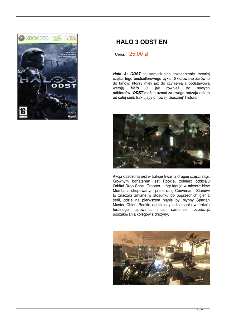 HALO 3 ODST EN Cena: 25.00 zł Halo 3: ODST to samodzielne rozszerzenie trzeciej części tego bestsellerowego cyklu. Skierowane zarówno do fanów, którzy mieli już do czynienia z podstawową wersją Halo 3, jak również do nowych odbiorców. ODST można uznać za swego rodzaju odłam od całej serii, traktujący o nowej, „bocznej” historii. Akcja osadzona jest w trakcie trwania drugiej części sagi. Głównym bohaterem jest Rookie, żołnierz oddziału Orbital Drop Shock Trooper, który ląduje w mieście New Mombasa okupowanym przez rasę Convenant. Stanowi to znaczną zmianę w stosunku do poprzednich gier z serii, gdzie na pierwszym planie był słynny Spartan Master Chief. Rookie oddzielony od zespołu w trakcie feralnego lądowania musi samotnie rozpocząć poszukiwania kolegów z drużyny. 1/2 Możemy wyruszyć na samotną misję w kampanii dla pojedynczego gracza, bądź też dołączyć do innych fanów w rozgrywkach sieciowych. Maksymalnie czterech graczy (dwóch na jednym ekranie) przechodzić może wspólnie kampanię oraz grać w nowym trybie – Firefight, w którym zmierzyć mogą się z niezliczonymi armiami wroga (typowy tryb survival, niczym Horda w Gears of War 2). Do gry dołączona jest też osobna płyta z pełną wersją trybu multiplayer z Halo 3. Zobacz wideo: Szczegóły wersja językowa ANGIELSKA 2/2 Powered by TCPDF (www.tcpdf.org)