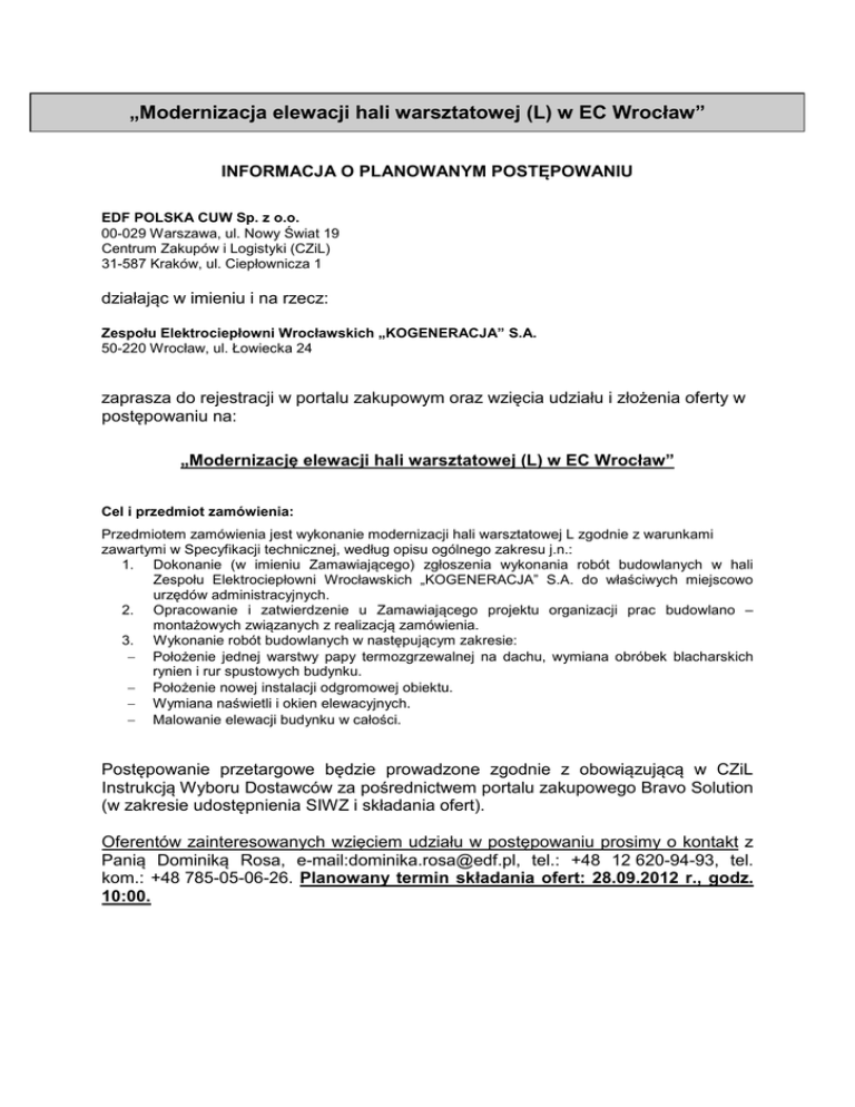 „Modernizacja elewacji hali warsztatowej (L) w EC Wrocław” INFORMACJA O PLANOWANYM POSTĘPOWANIU EDF POLSKA CUW Sp. z o.o. 00-029 Warszawa, ul. Nowy Świat 19 Centrum Zakupów i Logistyki (CZiL) 31-587 Kraków, ul. Ciepłownicza 1 działając w imieniu i na rzecz: Zespołu Elektrociepłowni Wrocławskich „KOGENERACJA” S.A. 50-220 Wrocław, ul. Łowiecka 24 zaprasza do rejestracji w portalu zakupowym oraz wzięcia udziału i złożenia oferty w postępowaniu na: „Modernizację elewacji hali warsztatowej (L) w EC Wrocław” Cel i przedmiot zamówienia: Przedmiotem zamówienia jest wykonanie modernizacji hali warsztatowej L zgodnie z warunkami zawartymi w Specyfikacji technicznej, według opisu ogólnego zakresu j.n.: 1. Dokonanie (w imieniu Zamawiającego) zgłoszenia wykonania robót budowlanych w hali Zespołu Elektrociepłowni Wrocławskich „KOGENERACJA” S.A. do właściwych miejscowo urzędów administracyjnych. 2. Opracowanie i zatwierdzenie u Zamawiającego projektu organizacji prac budowlano – montażowych związanych z realizacją zamówienia. 3. Wykonanie robót budowlanych w następującym zakresie: − Położenie jednej warstwy papy termozgrzewalnej na dachu, wymiana obróbek blacharskich rynien i rur spustowych budynku. − Położenie nowej instalacji odgromowej obiektu. − Wymiana naświetli i okien elewacyjnych. − Malowanie elewacji budynku w całości. Postępowanie przetargowe będzie prowadzone zgodnie z obowiązującą w CZiL Instrukcją Wyboru Dostawców za pośrednictwem portalu zakupowego Bravo Solution (w zakresie udostępnienia SIWZ i składania ofert). Oferentów zainteresowanych wzięciem udziału w postępowaniu prosimy o kontakt z Panią Dominiką Rosa, e-mail:[email protected], tel.: +48 12 620-94-93, tel. kom.: +48 785-05-06-26. Planowany termin składania ofert: 28.09.2012 r., godz. 10:00.