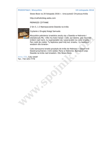 POZOSTAŁE | Wszystkie 19 Listopada 2016 Slowo Boze na 20 listopada 2016 r.- Uroczystość Chrystusa Króla http://catholicblog.webs.com PIERWSZE CZYTANIE 2 Sm 5, 1-3 Namaszczenie Dawida na króla Czytanie z Drugiej Księgi Samuela .c o m Wszystkie pokolenia izraelskie zeszły się u Dawida w Hebronie i oświadczyły Mu: «Oto my kości twoje i ciało. Już dawno, gdy Saul był królem nad nami, ty wyprawiałeś się i powracałeś na czele Izraela. I Pan rzekł do ciebie: Ty będziesz pasł mój lud, Izraela, i ty będziesz wodzem dla Izraela». w w w .s po Anna, FZS, Caly swiat! Tel.: 732-325-7779 jn ik Cała starszyzna Izraela przybyła do króla do Hebronu. I zawarł król Dawid przymierze z nimi wobec Pana w Hebronie. Namaścili więc Dawida na króla nad Izraelem. Oto Słowo Boże.