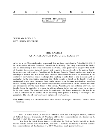 A R T Y K U Y __________________________________________________________ ROCZNIKI TEOLOGICZNE Tom LXI, zeszyt 10 2014 WIESAW BOKAJO REV. JERZY KOPEREK THE FAMILY AS A RESOURCE FOR CIVIL SOCIETY A b s t r a c t. This article refers to research that has been carried out in Poland in 2010-2012 in collaboration with the Pontifical Council for the Family. The study concerned the family and its functioning in the social conditions in Poland. Their goal was to diagnose the needs of families, the possible areas of support and to answer the question how the present family is resource for civil society. Catechism of the Roman Catholic Church, defines the family as marriage of woman and man which have children. This definition should be perceived in the context of the Church’s social teachings, the teaching of John Paul II and Benedict XVI in particular. In the sociological approach, the whole society is based on the family, which is understood as the most important basic social group, as an intimate relationship, based on mutual feeling, cooperation and mutual responsibility; reinforcement of the internal relations and interactions are the main focus of the family. According to the systemic approach, the family should be treated as a system, in which a change in his one part brings on a change in its other parts. The presented study is considering the issues concerning the family as a social institution in the context of the following main points: 1. Family – sociological approach; 2. The idea of civil society; 3. Spheres of civil society. Key words: family as a social institution, civil society, sociological approach, Catholic social teaching. Prof. Dr. habil. WIESAW BOKAJO – Head of the Chair of European Studies, Institute of Political Science, University of Wroclaw; address for correspondence: ul. Koszarowa 3, bud 2/3, 51-149 Wrocaw; e-mail: [email protected] Rev. Prof. Dr. habil. JERZY KOPEREK – Head of the Chair of Family Social Life, Institute of Family Studies and Social Work, John Paul II Catholic University of Lublin; address for correspondence: al. Racawickie 14, 20-950 Lublin; e-mail: [email protected] WIESAW BOKAJO, REV. JERZY KOPEREK 8 INTRODUCTION The Pontifical Council for the Family, whose president in 2008-2012 was H.E. Cardinal Ennio Antonelli, initiated in 2010-2012 the international sociological research on contemporary family. The study also joined the Polish Bishops’ Conference. The Pastoral Polish Family Counseling has undertaken the organization of the Polish part of the project. Bishop Stanislaw Stefanek SChr, responsible for the program ‘The Family as a Resource for Society’ on behalf of the Polish Conference of Bishops, wrote: “To the family is entrusted the task of striving, first and foremost, to unleash the forces of good, the source of which is found in Christ the Redeemer of man, so that these forces be the property of all families […].”1 This task given to families is realized by them in various social, economic, moral conditions. The understanding of these conditions becomes an important duty of the Church, caring for the future of every family and especially for families that are based on the indissoluble union with Christ in the sacramental sign of matrimony.”2 Development of this research has been done in the Department of Family Social Life, headed by Rev. Prof. Dr. habil. Jerzy Koperek in the Institute of Family Studies and Social Work at the John Paul II Catholic University of Lublin in cooperation with the Department of European Studies in the Faculty of Social Sciences at the University of Wroclaw, headed by Prof. Dr. habil. Wiesaw Bokajo.3 The study concerned the family and its functioning in the social conditions in different countries (Italy, Spain, USA, Mexico, Brazil and Poland). Their goal was to diagnose the needs of families, the possible areas of support and to answer the question how the present family is resource for civil society. The considerations in this article refer to the analysis of the above problems. So, the presented study is considering the issues concerning the family as a resource for civil society in the context of the following points: 1. Family – sociological approach; 2. The idea of civil society; 3. Spheres of civil society. 1 J o h n P a u l II, Letter to Families “Gratissimam sane”. Year of the Family – 1994, p. 23. 2 S. S t e f a n e k bp., Preface, in: W. B o k a j o, J. K o p e r e k, The View of Polish Family as a Social Institution in the Light of Empirical Research (2011-2012). Report of the Research Project: The Family as a Resource for Society. Vatican City: Pontifical Council for the Family–Fundacja Vita Familiae 2012, p. 5. 3 B o k a j o & K o p e r e k, The View of Polish Family. THE FAMILY AS A RESOURCE FOR CIVIL SOCIETY 9 1. FAMILY – SOCIOLOGICAL APPROACH Catechism of the Roman Catholic Church defines the family as marriage of woman and man which have children.4 This definition should be perceived in the context of the Church’s social teachings, the teaching of John Paul II and Benedict XVI in particular. In the sociological approach, the whole society is based on the family, which is understood as the most important basic social group,5 as an intimate relationship, based on mutual feeling, cooperation and mutual responsibility; reinforcement of the internal relations and interactions are the main focus of the family. According to the systemic approach, the family should be treated as a system, in which a change in his one part brings on a change in its other parts.6 The understanding of family as social institution assumes that in the sexual intercourses in this unit should be so long-lasting and normalized enough to guarantee of the renewable reproduction sphere, what requires fulfillment of the sexual–procreative needs of the couple.7 The family should fulfill two other institutional functions: creation of the economic community and security community. The fourth function