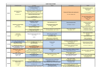 KURSY FAKULTAYWNE PONIEDZIAŁEK WTOREK ŚRODA CZWARTEK Potencjał militarny państw arabskich. Stan obecny, perspektywy. prof. dr hab. H. Królikowski, P. Niziński s. 0.25 PIĄTEK Półwysep Koreański w stosunkach międzynarodowych dr M. Lubina Japoński język biznesowy w praktyce 1 Bezpieczeństwo energetyczne i ekologiczne Chin dr hab. Ł. Gacek - IK, ul. Radz. 4 - s. 1.04 Problemy Indii i Pakistanu wobec współczesności mgr K. Moch s. 0.48 Współczesne Społeczeństwo Japonii dr K. Junik - Łuniewska s. 049 s. 1.0.2 ul. Gronostajowa 7 8:00-9:30 dr J. Guzik, s. 0.49 Chinese Characters in Korea (I) prof. B. Cho Urdu - język i tradycja kulturowa - poz. 2 dr hab. A. Kuczkiewicz-Fraś s.IGiGP s. 1.128 8.15-9.45 s. 1.0.2 gron 7 Kraje Maghrebu. Gospodarka, społeczeństwo i kultura 9.45-11.15 Introduction to Korean Studies prof. Cho G 0.42 - ul. Gronos. 3 prof. dr hab. H. Królikowski, P. Niziński s. G. 042 Gron 5 International Dynamics in East Asia prof. B. Cho s. 1.19 IGiGP ul. Gron 7 Polityka zagraniczna CHRL dr hab. Ł. Gacek - IK, ul. Radz. 4 - s. 1.04 11.30-13.00 Teatr koreański dr hab. E. Rynarzewska s. 0.48 Półwysep Koreański 2 państwa jeden naród dr hab. G. Strnad Obraz współczesnych Chin Relacje amerykańsko-irańskie w kinematografii Państwa środka dr A. Mikrut- Żaczkiewicz dr M. Rzepka s. 1.0.2 Gron 7 Colonialism and Nationalism in Southeast Asia dr M. Lubina G. 0.42 - ul. Gron 5 s 0.48 Human Dimension in Diplomacies of Asia-Pacific States dr M. Kosmala-Kozłowska, s. G042 - ul. Gron 5 Taiwan - Culture and Society dr B. Zemanek - s. 146 Polityka zagraniczna Japonii wobec Azji Wschodniej w XXI wieku dr O. Barbasiewicz, BRAK SALI Reklama i PR w świecie arabskim dr I. Balwierz - s. 146 Prawa człowieka a systemy Rosja w regionie Azji i Pacyfiku dr M. Lubina BRAK SALI Japońska rodzina cesarska. polityczno-prawne w Azji Wschodniej dr M. Kosmala-Kozłowska, s. G042 - ul. Gron 5 Historia i wspołczesność dr Ol. Barbasiewicz BRAK SALI brak Sali Tel Aviv. History, Athropology, Mythology dr P. Weiser s.G. 042 Gon. 5 Business Korean Language Metody tłumaczenia japońskich komisków manga dr P. Dybała - s. 0.25 Japan- Korea Relations prof. B. Cho, s. 3.0.6 - Gron. 7 Nauka j. indonezyjskiego - kontynuacja p. Hertiki Hertiki IGiGP - s. 1.14a dr J. Guzik s. 146 Kultura wizualna Indii i Pakistanu dr K. Junik-Łuniewska s. 0.49 s. 0.49 Stany Zjednoczone w regionie Azji i Pacyfiku dr R. Kwieciński s. 146 Południowe Indie - natura i kultura dr hab. P. Patoczka s. 1.28 IGiGP - ul. Gron. 7 Nauka języka indonezyjskiego p. Hertiki Hertiki IGiGP - s. 1.14a Wyrażenia w j. japońskim zakorzenione w kulturze i mentalności japońskiej dr P. Dybała s. 0.25 Arabska popkultura dr K. Rak s. 146 Nauka dialektu irackiego j. arabskiego - kurs podst. dr hab. P. Siwiec, prof. UJ s. 025 Feminizm arabski dr K. Rak The English Language Writers of South Asia dr hab. R. Czekalska s. 0.48 zajęcia od 20.10.2016 Rewolucja Czerownych Khmerów. Studium autarkicznego rozwoju. 13.15-14.45 15.00-16.30 Konfucjanizm a demokratyzacja Korei Pd i Tajwanu dr T. Łozińska s. 146 Scena polityczna izraela dr A. Skorek, s. 0.49 Psychologia międzykulturowa biznesu i polityki w Azji - dr M. Kosmala-Kozłowska s. 0.48 Japońskie mniejszości etniczne dr S. Meyer s. 129 Academic English: Writing and Article mgr D. Lubińska-Pyla s. 1.0.3 Gron 7 prof. dr hab. A. W. Jelonek s. 146 Birma. Historia, polityka i społeczeństwo dr M. Lubina s. 146 S. Chiune, T. Romer i polscy uchodźcy na DW w czasie II wojny światowej dr O. Barbasiewicz s. 0.49 16.45-18.15 Taiwaneseness in Contemporary Popular Culture Koreańska myśl polityczna XX wieku dr T. Łozińska s. 146 Siły zbrojne i służby specjalne Izraela dr A. Zemanek dr A. Skorek, s. 0.49 s. 146 Australia na politycznym rozdrożu - jeszcze Oceania Izraelska popkultura jako zwierciadło debat Tajwan: historia i polityka dr B. Zemanek s. 1.0.2 Gron 7 społecznych dr M. Kozłowska - s. 146 Eastern Christianity: History of its Churches, Doctrine Piśmiennictwo hebrajskie dr D. Starzyńśki , s. 0.25 and Liturgy - dr hab. P. Turek s. 1.0.2 - Gron 7 Ewolucja doktryny dżihadu dr hab. P. Siwiec, prof. UJ s. 0.48 Procesy integracyjne w regionie Azji i Pacyfiku dr R. Kwieciński, s. 129 Od Y. Ozo i A. Kurosawy po Asia Extreme studio Ghibi 16.45-18.15 dr A. Mikrut-Żaczkiewicz s. 1.0.3 Gron 7 czy już Azja? - dr D. Zdziech s. 048 Budowanie współczesnego konfliktu medialnego na BW s. 129 prof. dr hab. H. Królikowski, P. Niziński 18.30-20.00 Film izraelski dr P. Weiser s. 0.49 Język turecki - język i tradycja kulturowa - 2 mgr G. Stoczyńska-Tunçdemir s. 0.25 The History of Globalization prof. S. Babones, s. 1.0.2 UWAGA NIESTANDARDOWY UKŁAD ZAJĘĆ* Azja Wschodnia w polityce państw Australii i Oceanii Kobieta w Izraelu dr M. Kożlowska s. 146 Japoński język biznesowy w praktyce gr 2 mgr K. Moch s. 049 dr D. Zdziech, s. 0.48 *The History of Globalization - prof. S. Babones/ dr M. Lubina zajecia od 11października - 24 października 2016 roku w godz. 16.45 - 20.00 prowadzi dr M. Lubina 07.11.2016 (poniedziałek) 16.45 - 20.00 - prof. S. Babones s. 0.48 08.11.2016 (wtorek) 16.45 - 20.00 - prof. S. Babones s. 1.0.2 - ul. Gron 7 09.11.2016 (środa) 16.45 - 20.00 - prof. S. Babones s. 129 10.11.2016 (czwartek) 08.00 - 09.30 - prof. S. Babones s. 1.0.2 - Gron 7 egzamin z przedmiotu 22.11.godz. 16.45 (egzamin prowadzi dr M. Lubina) Potencjał turystyczny Dalekiego Wschodu dr J. Wardęga s. 129