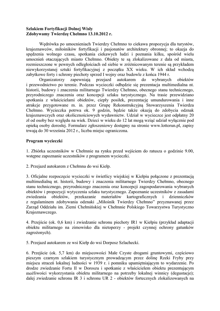 Szlakiem Fortyfikacji Dolnej Wisły Zdobywamy Twierdzę Chełmno 13.10.2012 r. Wędrówka po umocnieniach Twierdzy Chełmno to ciekawa propozycja dla turystów, krajoznawców, miłośników fortyfikacji i pasjonatów architektury obronnej; to okazja do spędzenia wolnego czasu, spotkania ciekawych ludzi i poznania kilku, spośród wielu umocnień otaczających miasto Chełmno. Obiekty te są zlokalizowane z dala od miasta, rozmieszczone w pewnych odległościach od siebie w zróżnicowanym terenie są przykładem niewykorzystanej sztuki fortyfikacyjnej z początku XX wieku. W ich skład wchodzą zabytkowe forty i schrony piechoty sprzed I wojny oraz budowle z końca 1944 r. Organizatorzy zapewniają przejazd autokarem do wybranych obiektów i przewodnictwo po terenie. Podczas wycieczki odbędzie się prezentacja multimedialna nt. historii, budowy i znaczenia militarnego Twierdzy Chełmno, obecnego stanu technicznego, przyrodniczego znaczenia oraz koncepcji szlaku turystycznego. Na trasie przewidziano spotkania z właścicielami obiektów, ciepły posiłek, prezentację umundurowania i inne atrakcje przygotowane m. in. przez Grupę Rekonstrukcyjną Stowarzyszenia Twierdza Chełmno. Wycieczka potrwa ok. 9 godzin, będzie także okazją do zdobycia odznak krajoznawczych oraz okolicznościowych wydawnictw. Udział w wycieczce jest odpłatny 20 zł od osoby bez względu na wiek. Dzieci w wieku do 12 lat mogą wziąć udział wyłącznie pod opieką osoby dorosłej. Formularz zgłoszeniowy dostępny na stronie www.lottorun.pl, zapisy trwają do 30 września 2012 r., liczba miejsc ograniczona. Program wycieczki 1. Zbiórka uczestników w Chełmnie na rynku przed wejściem do ratusza o godzinie 9.00, wstępne zapoznanie uczestników z programem wycieczki. 2. Przejazd autokarem z Chełmna do wsi Kiełp. 3. Oficjalne rozpoczęcie wycieczki w świetlicy wiejskiej w Kiełpiu połączone z prezentacją multimedialną nt. historii, budowy i znaczenia militarnego Twierdzy Chełmno, obecnego stanu technicznego, przyrodniczego znaczenia oraz koncepcji zagospodarowania wybranych obiektów i propozycji wytyczenia szlaku turystycznego. Zapoznanie uczestników z zasadami zwiedzania obiektów, przekazanie materiałów kartograficznych i dzienniczków z regulaminem zdobywania odznaki „Miłośnik Twierdzy Chełmno” przyznawanej przez Zarząd Oddziału im. Ziemi Chełmińskiej w Chełmnie Polskiego Towarzystwa Turystyczno Krajoznawczego. 4. Przejście (ok. 0,6 km) i zwiedzanie schronu piechoty IR1 w Kiełpiu (przykład adaptacji obiektu militarnego na zimowisko dla nietoperzy - projekt czynnej ochrony gatunków zagrożonych). 5. Przejazd autokarem ze wsi Kiełp do wsi Dorposz Szlachecki. 6. Przejście (ok. 5,7 km) do miejscowości Małe Czyste drogami gruntowymi, częściowo pieszym czarnym szlakiem turystycznym prowadzącym przez dolinę Rzeki Fryby przy miejscu straceń lokalnej ludności w 1939 r. i pomniku upamiętniającym to wydarzenie. Po drodze zwiedzanie Fortu II w Doroszu i spotkanie z właścicielem obiektu prezentującym możliwości wykorzystania obiektu militarnego na potrzeby lokalnej winnicy (degustacje); dalej zwiedzanie schronu IR 3 i schronu UR 2 - obiektów fortecznych zlokalizowanych na wzniesieniu, w zakolu rzeki Fryby; w dalej zwiedzanie schronu artyleryjskiego i stałej baterii armat w miejscowości Małe Czyste. 7. Przejazd autokarem z miejscowości Małe Czyste przez Stolno do wsi Rybieniec. 8. Przejście (ok. 3,7 km) do wsi Klamry, (polną drogą, potem asfaltem i leśną ścieżką odcinkiem czerwonego szlaku turystycznego). Po drodze zwiedzanie schronu IR6 w Rybieńcu (przedstawienie założeń programu opieki nad zabytkami w gminie Stolno), zwiedzanie zimowisko dla nietoperzy - schronu UR4 i pokaz obozowiska Wojska Polskiego z 1939 roku w wykonaniu Stowarzyszenia Twierdza Chełmno (poczęstunek, prezentacja umundurowania, pokaz zastosowania wykrywaczy metali). 9. Oficjalne zakończenie wycieczki, wręczenie okolicznościowych certyfikatów, materiałów informacyjnych i odznak krajoznawczych „Miłośnik Twierdzy Chełmno”. 10. Przejazd autokarem z miejscowości Klamry pod Ratusz w Chełmnie - do miejsca zbiórki. Opracowanie scenariusza wycieczki: Robert Gonia - Towarzystwo Przyjaciół Dolnej Wisły Bydgoszcz 11.06.2012 r.