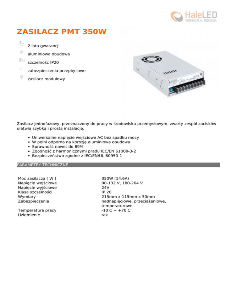 ZASILACZ PMT 350W 2 lata gwarancji aluminiowa obudowa szczelność IP20 zabezpieczenia przepięciowe zasilacz modułowy Zasilacz jednofazowy, przeznaczony do pracy w środowisku przemysłowym, zwarty zespół zacisków ułatwia szybką i prostą instalację. Uniwersalne napięcie wejściowe AC bez spadku mocy W pełni odporna na korozję aluminiowa obudowa Sprawność nawet do 89% Zgodność z harmonicznymi prądu IEC/EN 61000-3-2 Bezpieczeństwo zgodne z IEC/EN/UL 60950-1 PARAMETRY TECHNICZNE Moc zasilacza [ W ] Napięcie wejściowe Napięcie wyjściowe Klasa szczelności Wymiary Zabezpieczenia Temperatura pracy Uziemienie Powered by TCPDF (www.tcpdf.org) 350W (14.6A) 90-132 V, 180-264 V 24V IP 20 215mm x 115mm x 50mm nadnapięciowe, przeciążeniowe, temperaturowe -10 C ~ +70 C tak