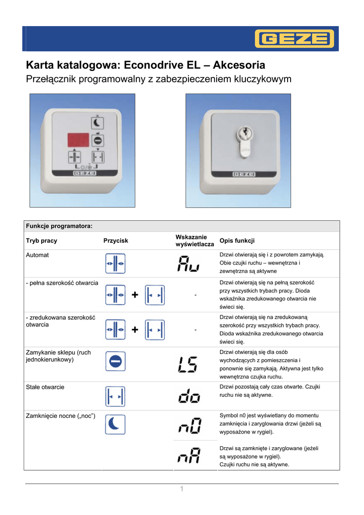Karta katalogowa: Econodrive EL – Akcesoria Przełącznik programowalny z zabezpieczeniem kluczykowym Funkcje programatora: Tryb pracy Wskazanie Opis funkcji wyświetlacza Przycisk Automat Drzwi otwierają się i z powrotem zamykają. Obie czujki ruchu – wewnętrzna i zewnętrzna są aktywne - pełna szerokość otwarcia - Drzwi otwierają się na pełną szerokość przy wszystkich trybach pracy. Dioda wskaźnika zredukowanego otwarcia nie świeci się. - Drzwi otwierają się na zredukowaną szerokość przy wszystkich trybach pracy. Dioda wskaźnika zredukowanego otwarcia świeci się. + - zredukowana szerokość otwarcia + Zamykanie sklepu (ruch jednokierunkowy) Drzwi otwierają się dla osób wychodzących z pomieszczenia i ponownie się zamykają. Aktywna jest tylko wewnętrzna czujka ruchu. Stałe otwarcie Drzwi pozostają cały czas otwarte. Czujki ruchu nie są aktywne. Zamknięcie nocne („noc”) Symbol n0 jest wyświetlany do momentu zamknięcia i zaryglowania drzwi (jeżeli są wyposażone w rygiel). Drzwi są zamknięte i zaryglowane (jeżeli są wyposażone w rygiel). Czujki ruchu nie są aktywne. 1
