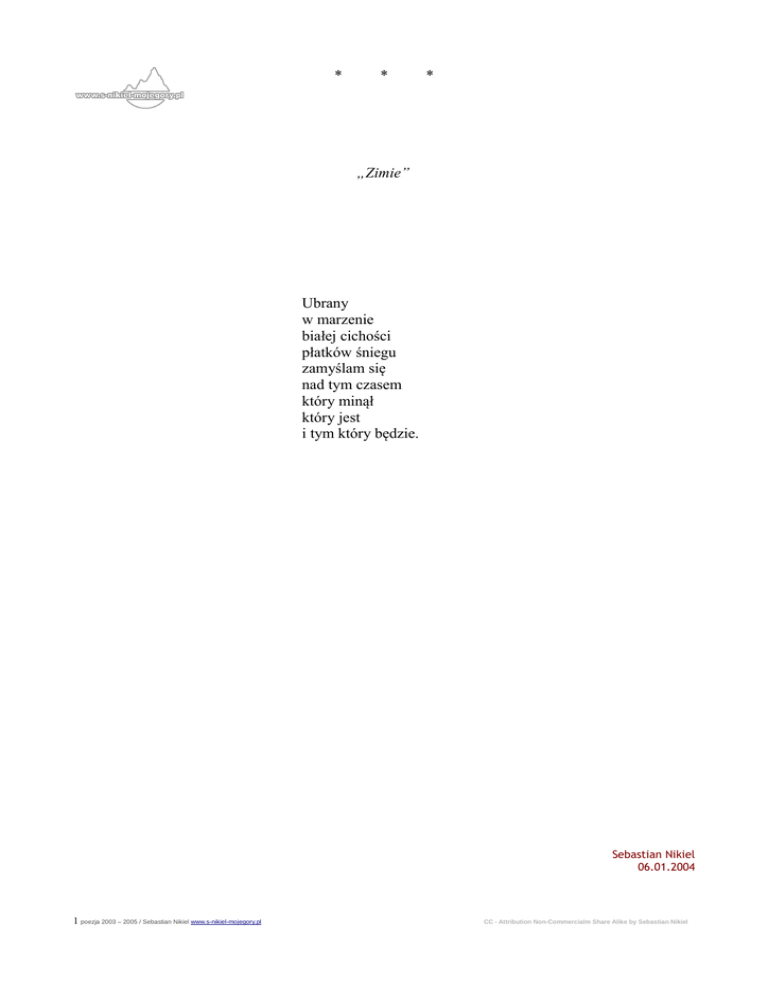 * * * „Zimie” Ubrany w marzenie białej cichości płatków śniegu zamyślam się nad tym czasem który minął który jest i tym który będzie. Sebastian Nikiel 06.01.2004 1 poezja 2003 – 2005 / Sebastian Nikiel www.s-nikiel-mojegory.pl CC - Attribution Non-Commercialm Share Alike by Sebastian Nikiel * * * Zawstydzony ukląkłem przed świata doskonałym obliczem tak kruchy tak mały pod niebios kopułą gdzie barwy wszystkie od złota przez purpurę po błękity i granaty niczym farby na palecie obrazu dopiero co rozpoczętego a już w czerni nocy tonącego. Sebastian Nikiel 19.05.2004 2 poezja 2003 – 2005 / Sebastian Nikiel www.s-nikiel-mojegory.pl CC - Attribution Non-Commercialm Share Alike by Sebastian Nikiel * * * Żółty liść porwany wiatrem spadł martwe wspomnienie minionego lata I dni coraz krótsze a noce dłuższe I już wkrótce nadejdzie ten czas gdy zmęczone kolorem serce odnajdzie ukojenie w białej cichości zimy Sebastian Nikiel 09.08.2004 3 poezja 2003 – 2005 / Sebastian Nikiel www.s-nikiel-mojegory.pl CC - Attribution Non-Commercialm Share Alike by Sebastian Nikiel * * * Wczoraj Wykopałem grób W ogródku Tuż obok domu Pochowałem w nim Te wszystkie marzenia Które są na później Sebastian Nikiel 23.08.2004 4 poezja 2003 – 2005 / Sebastian Nikiel www.s-nikiel-mojegory.pl CC - Attribution Non-Commercialm Share Alike by Sebastian Nikiel * * * „Ślepcom” Przekupiony Srebrnikiem Na targowisku Życia codziennego banału Sprzedałem Swoją Twoją I waszą duszę Teraz zmęczony Pusty Bezbarwny Pędzę Wraz z innymi Widzącymi ślepcami Za kolejnym talarem Sebastian Nikiel 23.08.2004 5 poezja 2003 – 2005 / Sebastian Nikiel www.s-nikiel-mojegory.pl CC - Attribution Non-Commercialm Share Alike by Sebastian Nikiel * * * „O Tatrach ” One tam są wieczne olbrzymy z granitu nieba filary Tutaj Ja spowity myślą błądzę pośród nich - wspomnieniami Okraszone czerwienią słońca pełne życia i samotności zarazem tutaj niebo z ziemią myśl i serce wiatr deszcz ból szczęście Tutaj Ja - zasnąłem myśląc O czym ? - zapomniałem - Sebastian Nikiel Wiersz stanowiący reminiscencje z wypadu na „Błatnią” 26.01.2003 6 poezja 2003 – 2005 / Sebastian Nikiel www.s-nikiel-mojegory.pl CC - Attribution Non-Commercialm Share Alike by Sebastian Nikiel * * * Deszcz niekończący się taniec igraszka nieba z ziemią łańcuch narodzin i śmierci tysiące srebrzystych kropel ich życie mierzone odległością dla nas chwilą dla nich wiecznością Zabawne niczym nasze życie narodziny pierwsze tchnienie bardziej lub mniej kręta droga setki marzeń planów Pac i już ktoś inny pełen wiary kroczy tą ścieżką bez nas Sebastian Nikiel 11.04.2003 7 poezja 2003 – 2005 / Sebastian Nikiel www.s-nikiel-mojegory.pl CC - Attribution Non-Commercialm Share Alike by Sebastian Nikiel * * * „Jesień” Otulony myślą na ganku wyobraźni przed serca domem siedzę wsłuchując się w starego pianina pieśń spoglądam na liście tańczące z wiatrem to bal dziś w dobrym są tonie złote i czerwone stroje niepostrzeżenie pola skrajem podąża o n a idzie w z mgły i liści skrojonej sukni we włosy wplotła słońca promienie -jesieńZaczekam tu na nią na tym ganku a gdy nadejdzie usiądziemy razem przy herbaty czarze i będziemy wspominać te czasy piękne gdy ją pośród tych pól poznałem a potem odejdzie przez czas ponaglana a ja na tym ganku pozostanę czekając aż za rok powróci Sebastian Nikiel 23.11.2003 8 poezja 2003 – 2005 / Sebastian Nikiel www.s-nikiel-mojegory.pl CC - Attribution Non-Commercialm Share Alike by Sebastian Nikiel