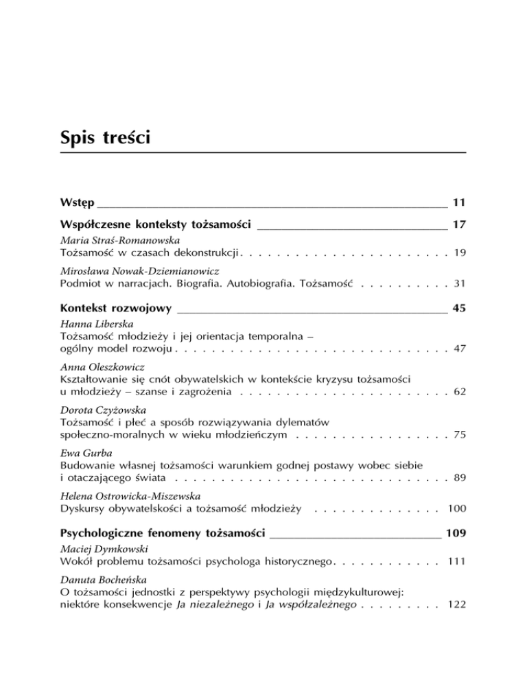 Spis treści Wstęp _________________________________________________________ 11 Współczesne konteksty tożsamości _______________________________ 17 Maria Straś-Romanowska Tożsamość w czasach dekonstrukcji . . . . . . . . . . . . . . . . . . . . . . . 19 Mirosława Nowak-Dziemianowicz Podmiot w narracjach. Biografia. Autobiografia. Tożsamość . . . . . . . . . . 31 Kontekst rozwojowy ____________________________________________ 45 Hanna Liberska Tożsamość młodzieży i jej orientacja temporalna – ogólny model rozwoju . . . . . . . . . . . . . . . . . . . . . . . . . . . . . . 47 Anna Oleszkowicz Kształtowanie się cnót obywatelskich w kontekście kryzysu tożsamości u młodzieży – szanse i zagrożenia . . . . . . . . . . . . . . . . . . . . . . . 62 Dorota Czyżowska Tożsamość i płeć a sposób rozwiązywania dylematów społeczno-moralnych w wieku młodzieńczym . . . . . . . . . . . . . . . . . 75 Ewa Gurba Budowanie własnej tożsamości warunkiem godnej postawy wobec siebie i otaczającego świata . . . . . . . . . . . . . . . . . . . . . . . . . . . . . . 89 Helena Ostrowicka-Miszewska Dyskursy obywatelskości a tożsamość młodzieży . . . . . . . . . . . . . . 100 Psychologiczne fenomeny tożsamości ____________________________ 109 Maciej Dymkowski Wokół problemu tożsamości psychologa historycznego. . . . . . . . . . . . 111 Danuta Bocheńska O tożsamości jednostki z perspektywy psychologii międzykulturowej: niektóre konsekwencje Ja niezależnego i Ja współzależnego . . . . . . . . . 122 8 Barbara Zimoń-Dubowik, Małgorzata Gamian-Wilk, Izabela Szarmach-Nestorowicz Mobbing – psychologiczne mechanizmy utraty tożsamości zawodowej . . . 137 Olga Bąk Wpływ otrzymanej informacji o własnej agresywności na przekonania o sobie . . . . . . . . . . . . . . . . . . . . . 154 Kamila Madeja-Bień Skutki autoprezentacyjnego występu . . . . . . . . . . . . . . . . . . . . . . 170 Małgorzata Gamian-Wilk, Katarzyna Borejko, Aleksandra Gwara, Joanna Paszko, Katarzyna Stokłosa Przyjmowanie nieadaptacyjnych strategii autoprezentacji jako rezultat zagrożonej tożsamości zawodowej osób długotrwale bezrobotnych . . . . . 185 Jan Pietraszko, Jarosław Rychlik Zmiany w poczuciu tożsamości u osób osadzonych w więzieniu (badanie eksploracyjne) . . . . . . . . . . . . . . . . . . . . . . . . . . . . 202 Tomasz Frąckowiak Na ile tożsamość współczesnego człowieka jest hipernarracją?. . . . . . . . 221 Tożsamość w perspektywie socjologicznej ________________________ 233 Ewa Banaszak Tożsamość. Socjologiczne konceptualizacje . . . . . . . . . . . . . . . . . . 235 Marcin Starnawski O reżimach identyfikacyjnych i dylematach tożsamości w diasporze . . . . 248 Paweł Rudnicki Niepokorni. Kim są przeciwnicy globalizacji? . . . . . . . . . . . . . . . . . 274 Joanna Mysiakowska Tożsamość kobiety wobec imperatywów kulturowych i biologicznych . . . . 285 Agnieszka Powłoka Taniec jako pretekst doświadczania niepowtarzalnej cielesności . . . . . . . 299 Olga Nowaczyk Tożsamość studentów Wyższych Szkół Oficerskich jako strategia życia we współczesnym społeczeństwie polskim i armii . . . . . . . . . . . . . . 305 Beata Bochnia Śmierć jako kryzys tożsamości . . . . . . . . . . . . . . . . . . . . . . . . . 316 Contents Introduction ___________________________________________________ 11 Contemporary contexts of identity _______________________________ 17 Maria Straś-Romanowska Identity in the time of deconstruction . . . . . . . . . . . . . . . . . . . . . . 19 Mirosława Nowak-Dziemianowicz A subject in narrative. Biography. Autobiography. Identity . . . . . . . . . . . 31 Developmental approach ________________________________________ 45 Hanna Liberska Adolescents’ identity and time orientation: A general model of development . . . . . . . . . . . . . . . . . . . . . . . . 47 Anna Oleszkowicz Forming civic virtues in the context of youths’ identity crisis: Opportunities and threats . . . . . . . . . . . . . . . . . . . . . . . . . . . . 62 Dorota Czyżowska Identity, gender, and a way of considering the socio-moral dilemmas by young adults . . . . . . . . . . . . . . . . . . . 75 Ewa Gurba Development of one’s own identity as a necessary condition for defending one’s dignity towards oneself and the world . . . . . . . . . . . 89 Helena Ostrowicka-Miszewska Citizen discourse and youth identity . . . . . . . . . . . . . . . . . . . . . . 100 Psychological phenomena of identity _____________________________ 109 Maciej Dymkowski The historical psychologist’s identity . . . . . . . . . . . . . . . . . . . . . . 111 Danuta Bocheńska Self-identity from the perspective of cross-cultural psychology: Selected implications of independent and interdependent self-construals . . . 122 10 Barbara Zimoń-Dubowik, Małgorzata Gamian-Wilk, Izabela Szarmach-Nestorowicz Mobbing: The psychological mechanisms of losing one’s job identity . . . . 137 Olga Bąk Feedback about aggressiveness influences self-beliefs . . . . . . . . . . . . . 154 Kamila Madeja-Bień Psychological results of self-presentation. . . . . . . . . . . . . . . . . . . . 170 Małgorzata Gamian-Wilk, Katarzyna Borejko, Aleksandra Gwara, Joanna Paszko, Katarzyna Stokłosa Endorsing unadaptive self-presentation strategies as a result of threatened job identity of the long-term unemployed . . . . . . . . . . . 185 Jan Pietraszko, Jarosław Rychlik Changes in identity among prison inmates (preliminary study) . . . . . . . . 202 Tomasz Frąckowiak How much of contemporary man’s identity is hypernarration? . . . . . . . . 221 Identity in the sociological perspective ___________________________ 233 Ewa Banaszak Identity: Sociological conceptualizations . . . . . . . . . . . . . . . . . . . 235 Marcin Starnawski On identification regimes and dilemmas of identity in a “diasporic” situation . . . . . . . . . . . . . . . . . . . . . . . . . . . 248 Paweł Rudnicki Wh