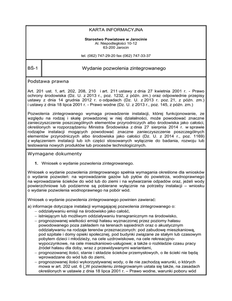 KARTA INFORMACYJNA Starostwo Powiatowe w Jarocinie Al. Niepodległości 10-12 63-200 Jarocin tel. (062) 747-29-20 fax (062) 747-33-37 BŚ-1 Wydanie pozwolenia zintegrowanego Podstawa prawna Art. 201 ust. 1, art. 202, 208, 210 i art. 211 ustawy z dnia 27 kwietnia 2001 r. - Prawo ochrony środowiska (Dz. U. z 2013 r., poz. 1232, z późn. zm.) oraz odpowiednie przepisy ustawy z dnia 14 grudnia 2012 r. o odpadach (Dz. U. z 2013 r. poz. 21, z późn. zm.) i ustawy z dnia 18 lipca 2001 r. - Prawo wodne (Dz. U. z 2013 r., poz. 145, z późn. zm.) Pozwolenia zintegrowanego wymaga prowadzenie instalacji, której funkcjonowanie, ze względu na rodzaj i skalę prowadzonej w niej działalności, może powodować znaczne zanieczyszczenie poszczególnych elementów przyrodniczych albo środowiska jako całości, określonych w rozporządzeniu Ministra Środowiska z dnia 27 sierpnia 2014 r. w sprawie rodzajów instalacji mogących powodować znaczne zanieczyszczenie poszczególnych elementów przyrodniczych albo środowiska jako całości (Dz. U. z 2014 r., poz. 1169) z wyłączeniem instalacji lub ich części stosowanych wyłącznie do badania, rozwoju lub testowania nowych produktów lub procesów technologicznych. Wymagane dokumenty 1. Wniosek o wydanie pozwolenia zintegrowanego. Wniosek o wydanie pozwolenia zintegrowanego spełnia wymagania określone dla wniosków o wydanie pozwoleń: na wprowadzanie gazów lub pyłów do powietrza, wodnoprawnego na wprowadzanie ścieków do wód lub do ziemi i na wytwarzanie odpadów oraz, jeżeli wody powierzchniowe lub podziemne są pobierane wyłącznie na potrzeby instalacji – wniosku o wydanie pozwolenia wodnoprawnego na pobór wód. Wniosek o wydanie pozwolenia zintegrowanego powinien zawierać: a) informacje dotyczące instalacji wymagającej pozwolenia zintegrowanego o: − oddziaływaniu emisji na środowisko jako całość, − istniejącym lub możliwym oddziaływaniu transgranicznym na środowisko, − prognozowanej wielkości emisji hałasu wyznaczonej przez poziomy hałasu powodowanego poza zakładem na terenach sąsiednich oraz o akustycznym oddziaływaniu na rodzaje terenów przeznaczonych: pod zabudowę mieszkaniową, pod szpitale i domy opieki społecznej, pod budynki związane ze stałym lub czasowym pobytem dzieci i młodzieży, na cele uzdrowiskowe, na cele rekreacyjnowypoczynkowe, na cele mieszkaniowo-usługowe; a także o rozkładzie czasu pracy źródeł hałasu dla doby, wraz z przewidywanymi wariantami, − prognozowanej ilości, stanie i składzie ścieków przemysłowych, o ile ścieki nie będą wprowadzane do wód lub do ziemi, − prognozowanej ilości wykorzystywanej wody, o ile nie zachodzą warunki, o których mowa w art. 202 ust. 6 („W pozwoleniu zintegrowanym ustala się także, na zasadach określonych w ustawie z dnia 18 lipca 2001 r. – Prawo wodne, warunki poboru wód powierzchniowych lub podziemnych, jeżeli wody te są pobierane wyłącznie na potrzeby instalacji wymagającej pozwolenia zintegrowanego”), − proponowanych sposobach zapobiegania występowaniu i ograniczania skutków awarii, jeżeli nie dotyczy zakładów stwarzających zagrożenie wystąpienia poważnej awarii przemysłowej, − spełnianiu wymagań, o których mowa w art. 207 ust. 1 i 1a („Najlepsze dostępne techniki powinny spełniać wymagania, przy których określaniu uwzględnia się jednocześnie: rachunek kosztów i korzyści; czas niezbędny do wdrożenia najlepszych dostępnych technik dla danego rodzaju instalacji; zapobieganie zagrożeniom dla środowiska powodowanym przez emisje lub ich ograniczanie do minimum; podjęcie środków zapobiegających poważnym awariom przemysłowym lub zmniejszających do minimum powodowane przez nie zagrożenia dla środowiska; termin oddania instalacji do eksploatacji; dokumenty referencyjne BAT oraz konkluzje BAT, o ile zostały opublikowane w Dzienniku Urzędowym Unii Europejskiej; przy określaniu najlepszych dostępnych technik bierze się pod uwagę wymagania, przy których określaniu uwzględnia się w szczególności: stosowanie substancji o małym potencjale zagrożeń”); − efektywne wytwarzanie oraz wykorzystanie energii; zapewnienie racjonalnego zużycia wody i innych surowców oraz materiałów i paliw; stosowanie technologii bezodpadowych i małoodpadowych oraz możliwość odzysku powstających odpadów; rodzaj, zasięg oraz wielkość emisji; wykorzystywanie porównywalnych procesów i metod, które zostały skutecznie zastosowane w skali przemysłowej; postęp naukowotechniczny, także w przypadku gdy instalacja nie jest nowo uruchamiana lub zmieniana w sposób istotny) b) uzasadnienie dla proponowanej wielkości emisji w przypadku, o którym mowa w art. 204 ust. 2 („W szczególnych przypadkach organ właściwy do wydania pozwolenia zintegrowanego może w pozwoleniu zintegrowanym zezwolić na odstępstwo od granicznych wielkości emisyjnych, jeżeli w jego ocenie ich osiągnięcie prowadziłoby do nieproporcjonalnie wysokich kosztów w stosunku do korzyści dla środowiska oraz pod warunkiem że nie zostaną przekroczone standardy emisyjne, o ile mają one zastosowanie”); c) opis wariantów środków zapobiegających powstawaniu zanieczyszczeń, o ile takie warianty istnieją; d) w przypadku gdy eksploatacja instalacji obejmuje wykorzystywanie, produkcję lub uwalnianie substancji powodującej ryzyko oraz występuje możliwość zanieczyszczenia gleby, ziemi lub wód gruntowych na terenie zakładu: − raport początkowy o stanie zanieczyszczenia gleby, ziemi i wód gruntowych tymi substancjami, − opis stosowanych sposobów zapobiegania emisjom do gleby, ziemi i wód gruntowych, − propozycje dotyczące sposobu prowadzenia systematycznej oceny ryzyka zanieczyszczenia gleby, ziemi i wód gruntowych substancjami powodującymi ryzyko, które mogą znajdować się na terenie zakładu, w związku z eksploatacją instalacji albo sposobu i częstotliwości wykonywania badań zani